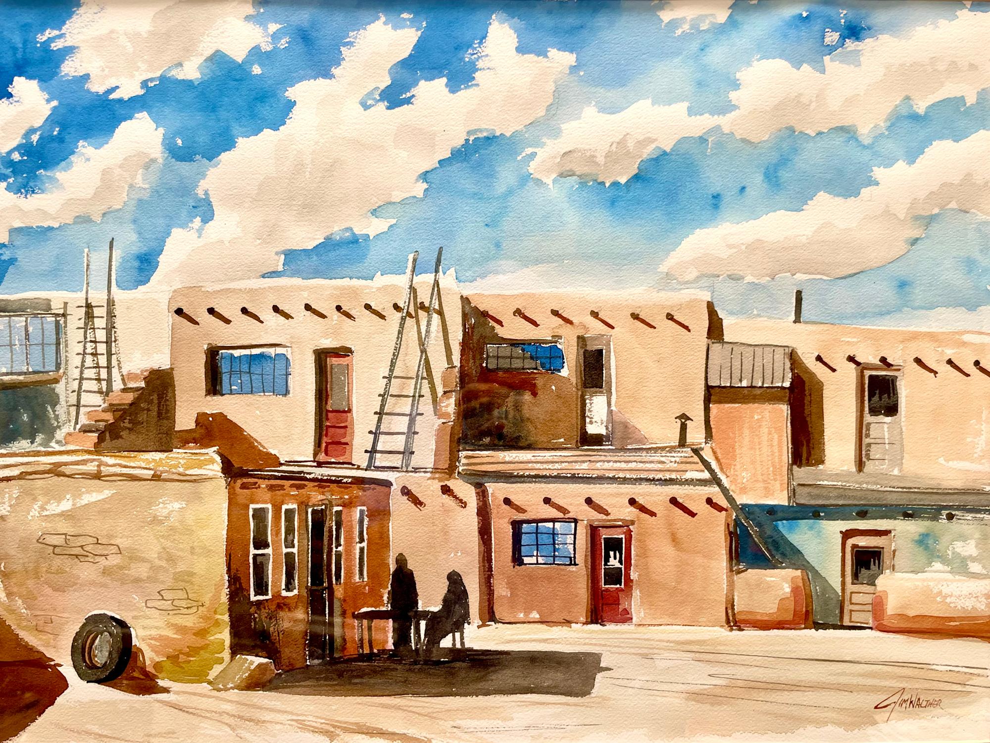 Soon after arriving in New Mexico, Celeste and I were visited by old friends Bill and Dee Bradshaw. They wanted to experience Acoma Sky City and we had not been either. This studio watercolor painting is from a photograph taken on top of the mesa. This is a very mysical space with lots of history of the intersection of Hispanic and Native cultures back in the 1600's. Seeing the people still living in this ancient place is enchanting.