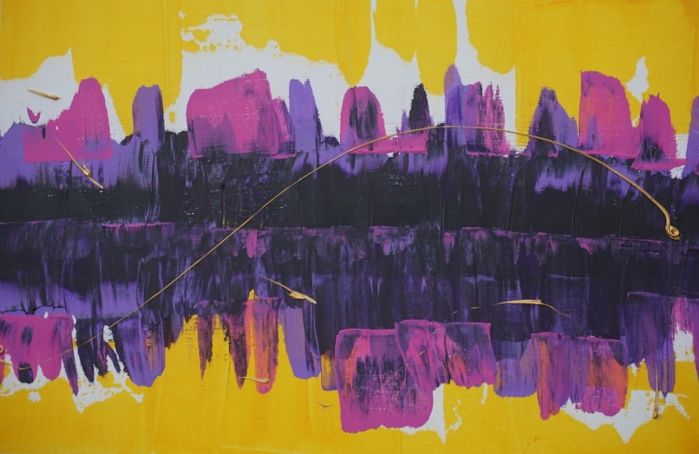 A contemporary acrylic abstract painting of a cityscape using bold bright colors.