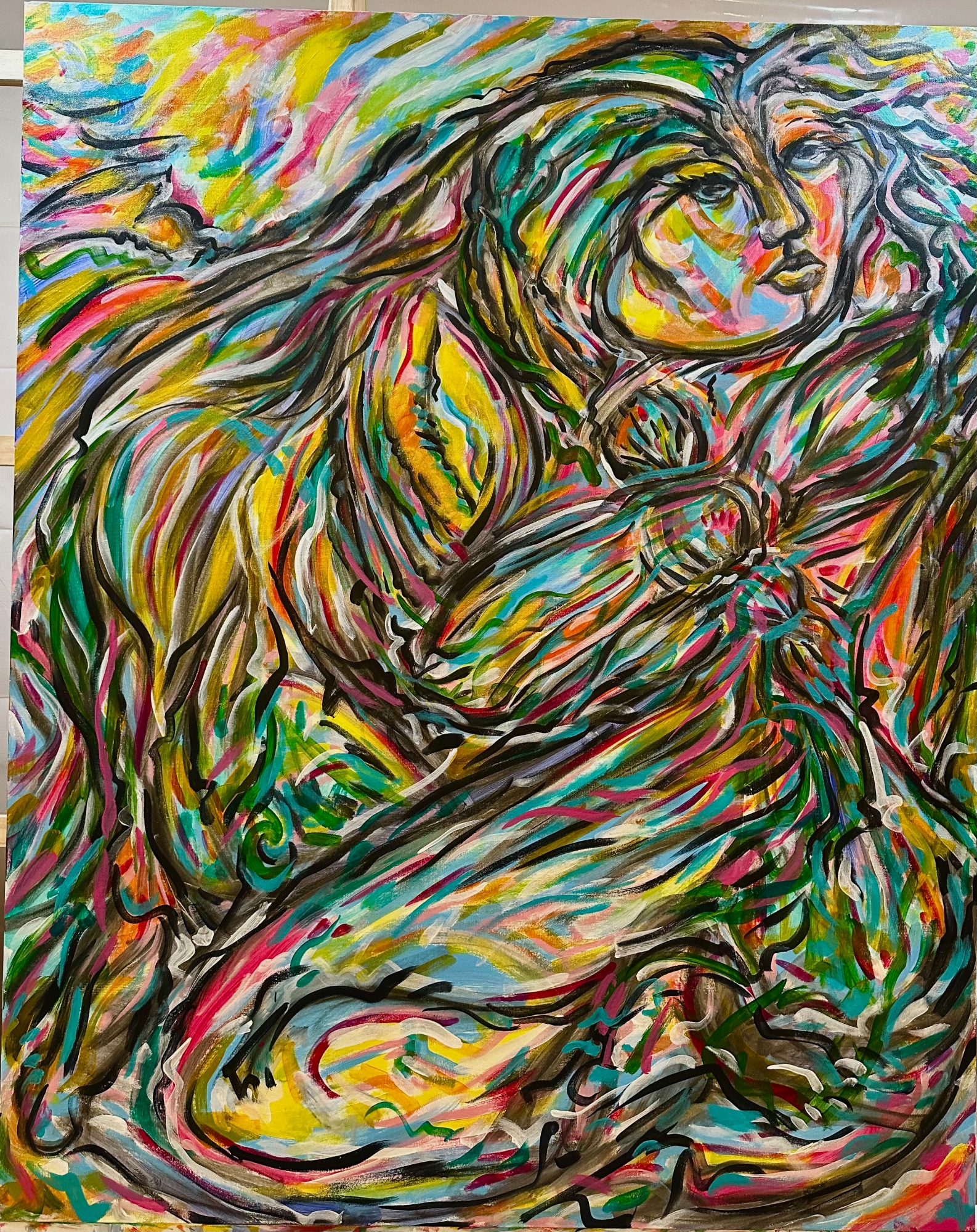"Consejo de las Mujeres: Yolanda" is a vibrant tapestry of color and emotion, capturing the viewer with its dynamic composition and expressive energy. Standing at 60 inches high and 48 inches wide, this acrylic on canvas piece immerses the audience in a world of swirling lines and bold hues that seem to pulse with life. The canvas is a dance of colors, where vivid blues, radiant reds, sunny yellows, and lush greens intertwine, blending seamlessly to form an inviting and intricate landscape.