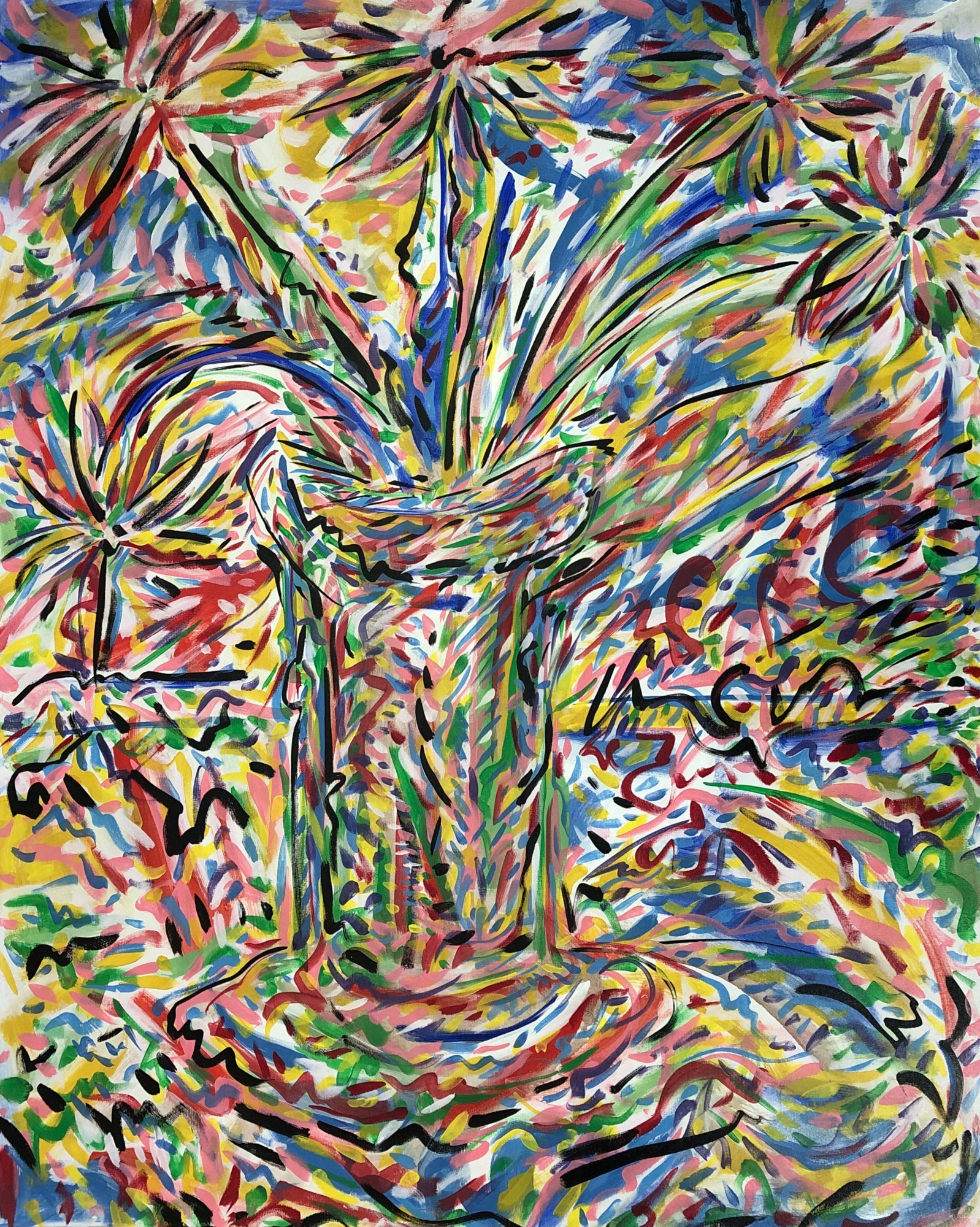 The focal point, a stylized vase amidst flowers, emerges strikingly against a background that pulsates with kinetic energy. I've crafted a delicate balance between recognizability and abstraction, encouraging viewers to interpret the forms and flow across the scene for themselves. The spiraling strokes emanate a sense of motion that animates the canvas, making the piece feel like it’s constantly in flux, much like the perpetual motion of life itself.