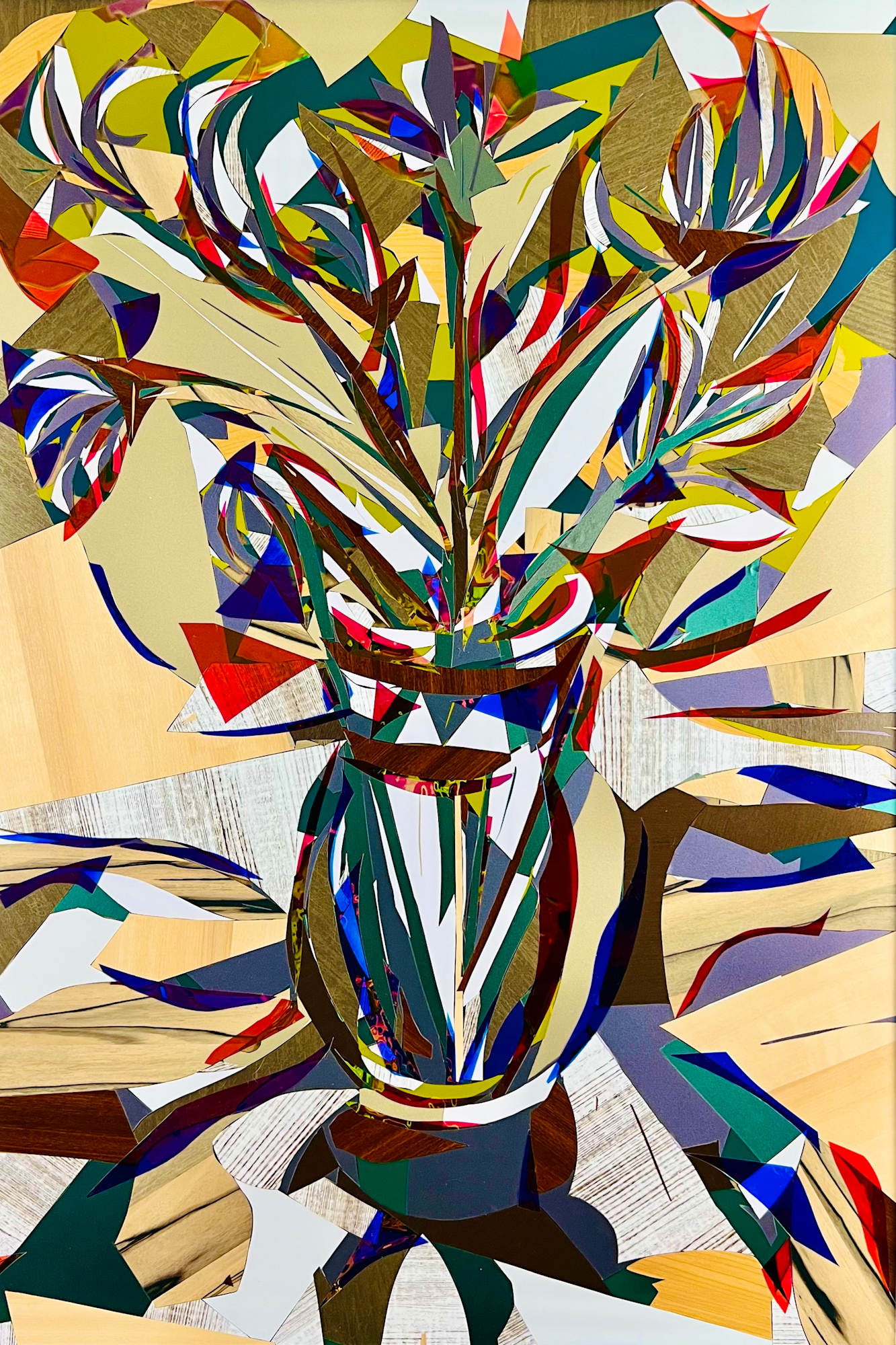 "Flores de Oro" is a captivating piece that exudes vibrancy and energy, inviting viewers into an abstract world where color and form collide. Measuring 36 inches in height and 24 inches in width, this artwork serves as a compelling visual statement, crafted from 3M Vinyls and Films. Its bold and dynamic composition is centered around the concept of a stylized vase brimming with flowers, offering a modern twist on the traditional still life.