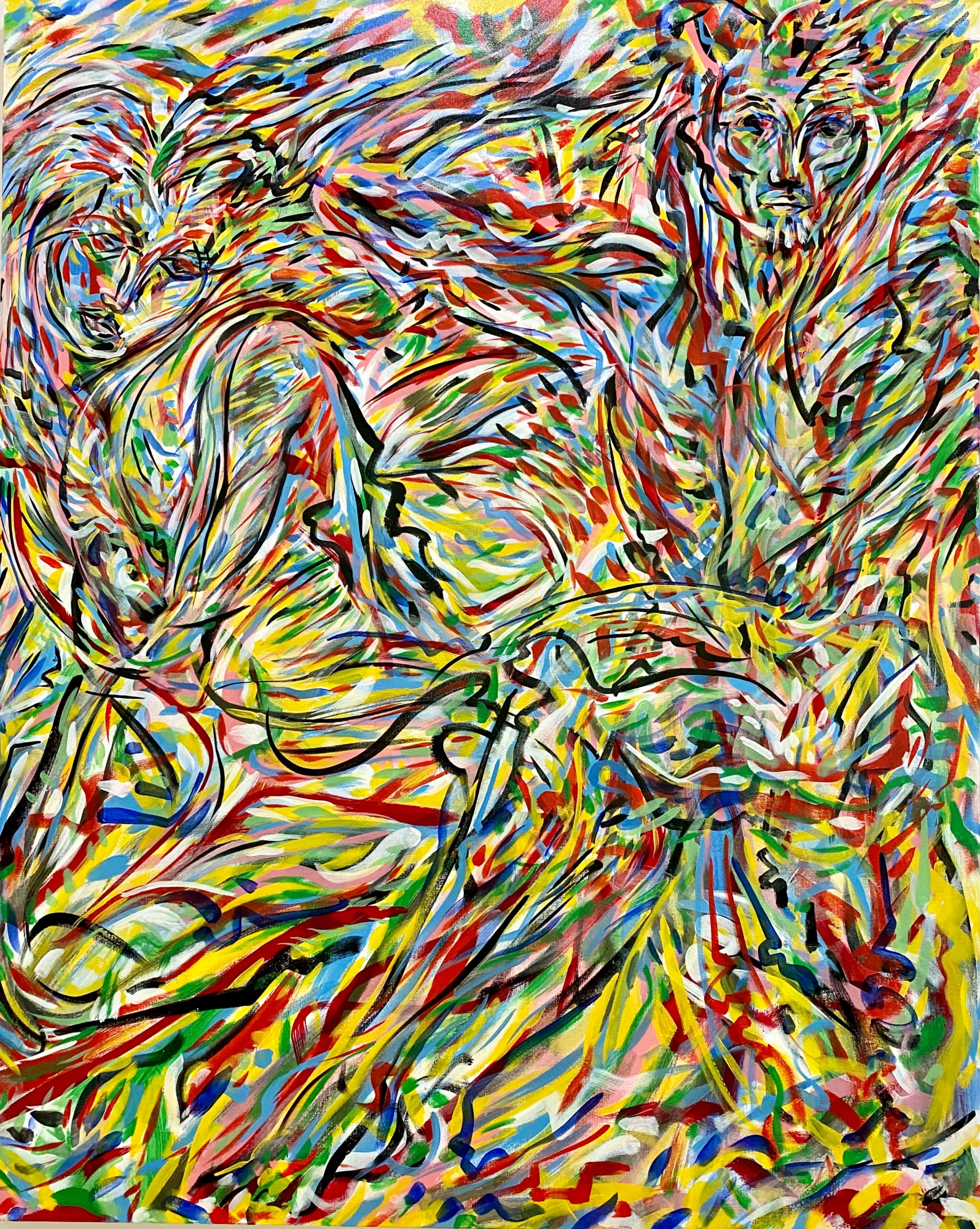 Part of a four panel mural portraying dancers articulating the entire space. The mural is created as the foundation element for an animation to be used as backdrop to a ballet called La Brocha (The Brush). You see the dancers interconnected in a turn full of energy and vitality. It is intended to represent all of the folkloric dances amalgamated into a classical ballet interpretation. My purpose as a radical Chicano Artist is to employ the cultural legacy of all Hispanic and Indigenous peoples and fabricate a future aesthetic distinctly Americano.