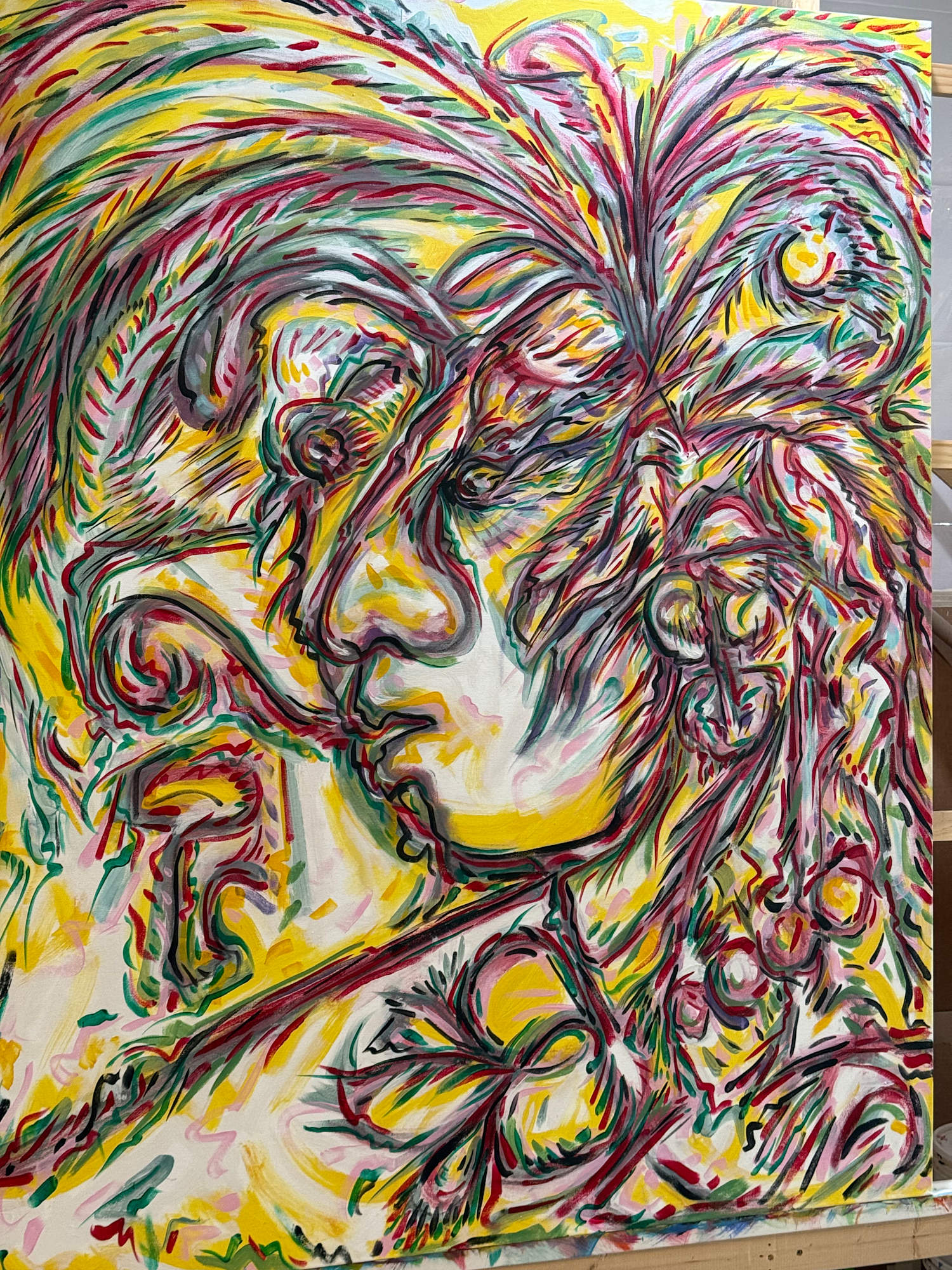 "Mayan Warrior with Flute" is an enchanting exploration of color and form, measuring an impressive 60 inches high by 48 inches wide. This acrylic on canvas captivates the viewer with its abstract depiction of a face that seamlessly integrates with a riot of dynamic lines and patterns. Radiant shades of yellow, red, pink, and blue weave through the artwork, creating a tapestry of vibrant energy that almost leaps off the canvas.