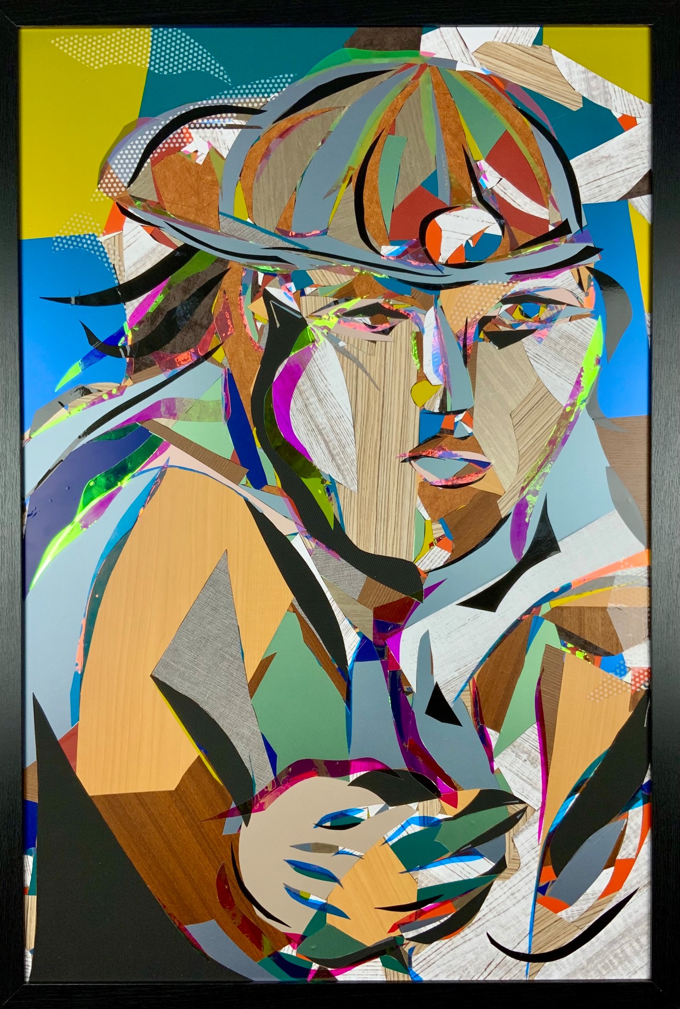 "Young Boy with Hat" is a captivating exploration of identity and cultural reflection, harnessing the power of geometric abstraction to create a visually arresting portrait. Measuring 36 inches in height and 24 inches in width, this piece employs the innovative use of 3M Architectural Vinyls and Prismatic Films, creating a textured, layered surface that catches and plays with light, enhancing the vibrant colors within. The artwork presents a stylized portrait of a young boy, his features exaggerated and his presence both immediate and enigmatic.