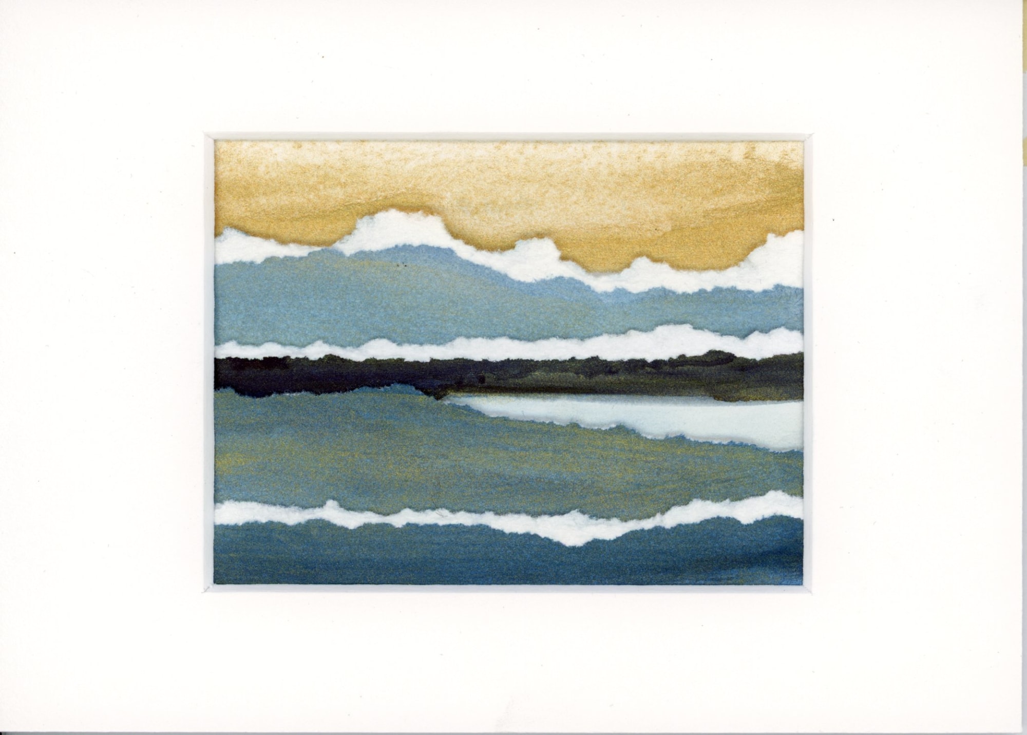 A little note about the art...it was not intentional but a happy accident when I was messing around in the studio. Several pieces of art were bound for the recycle bin. I decided to rip them up and layer them...I love the rolling cloud bank above the multi-plane landscape below. And what could be more reminiscent of Kintsugi style than a hopeful golden strip of sunshine emerging in the distance?