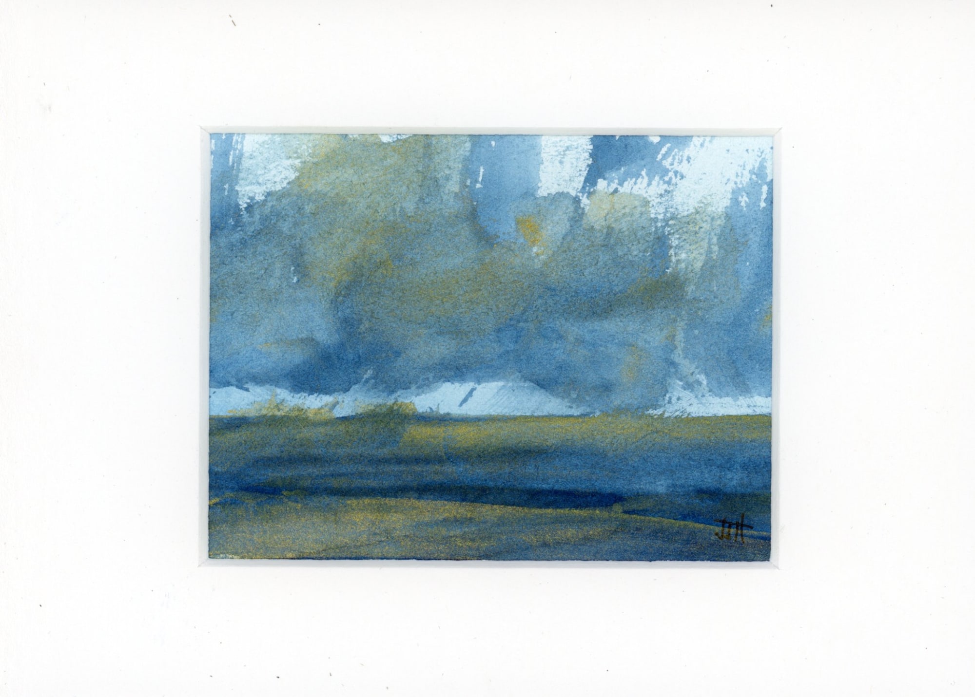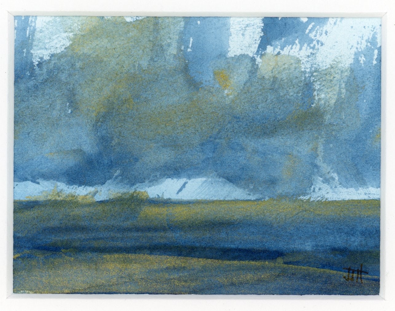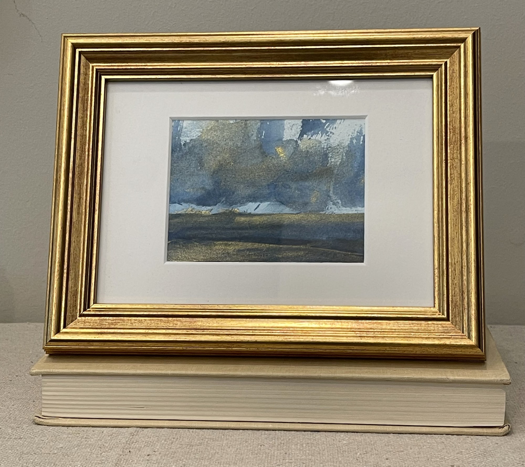 This energetic, stirring coastal landscape watercolor is professionally finished with a classic burnished gold frame. Blue, white and metallic gold palette.
