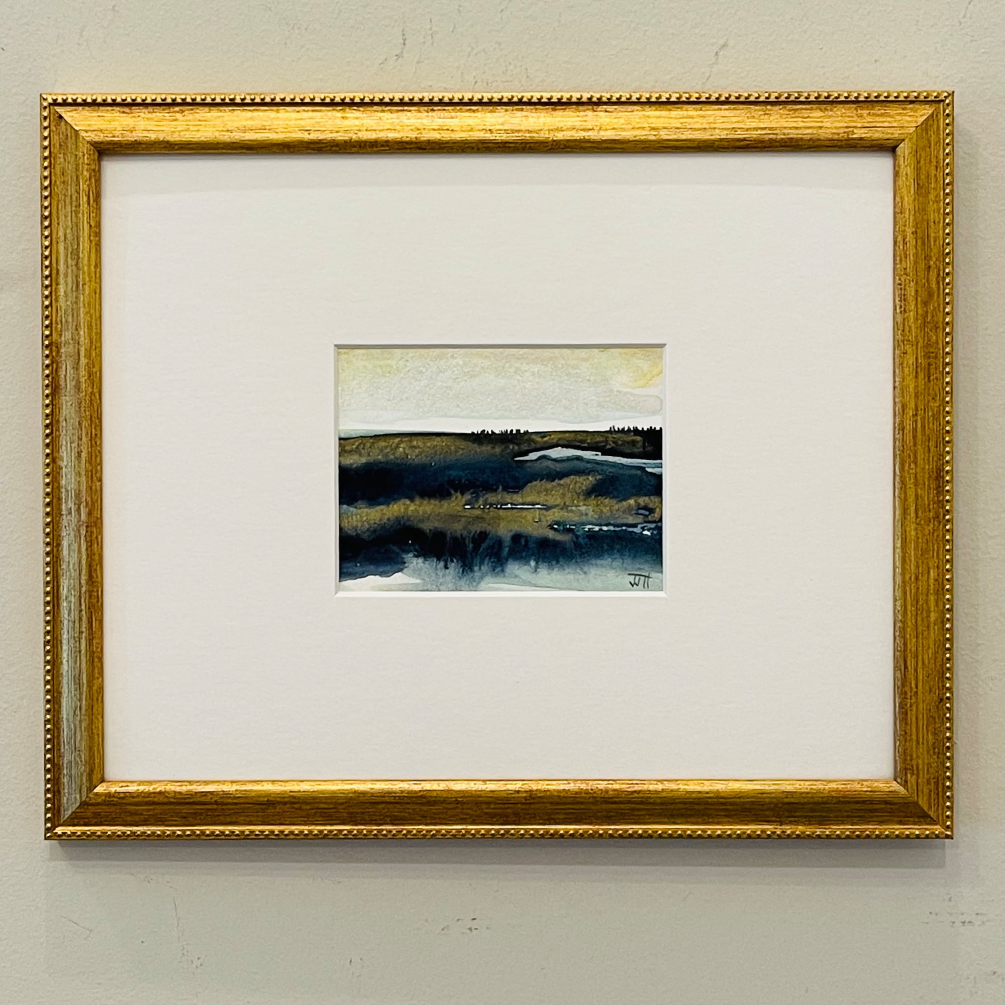 This shimmery marshy landscape watercolor is professionally finished with a delicate beaded, burnished gold frame. The land and sky are subtle yet dramatic and intriguing.