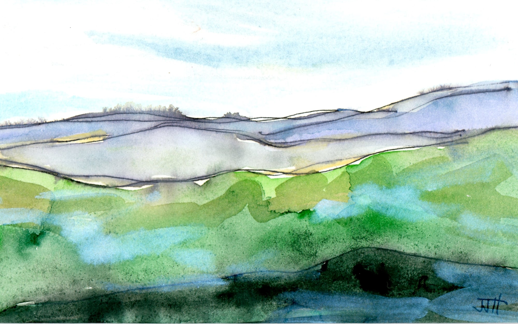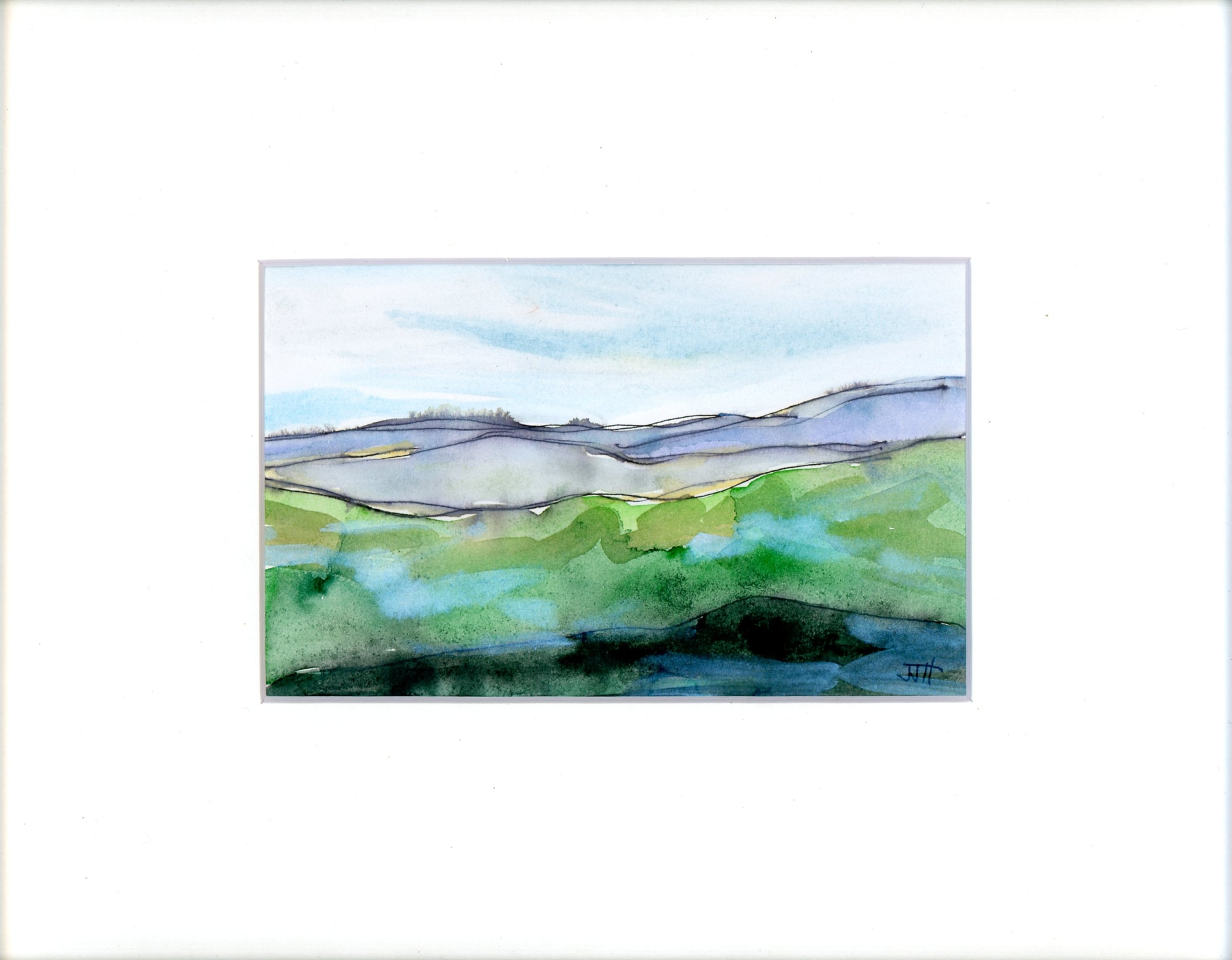 Petite landscape watercolor (thin white wood frame, matted under glass).