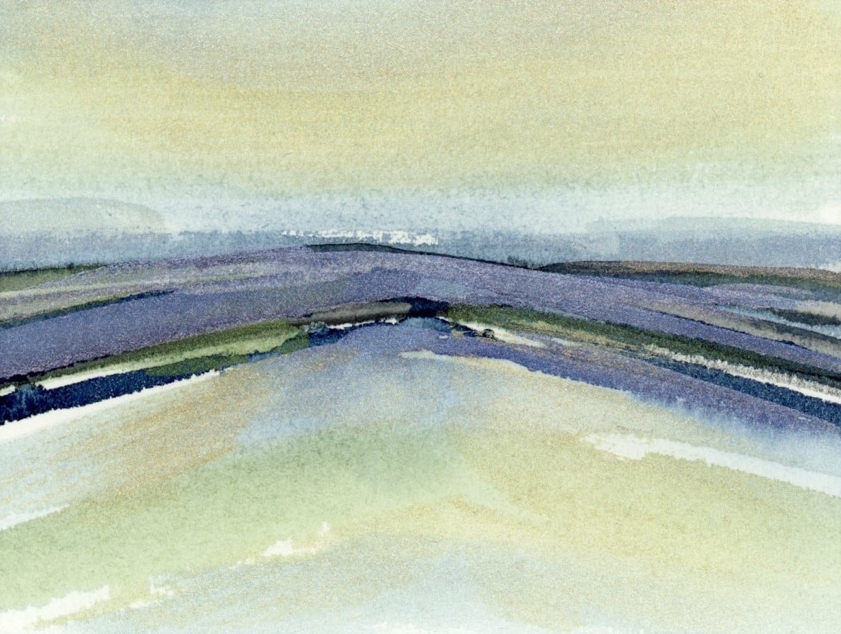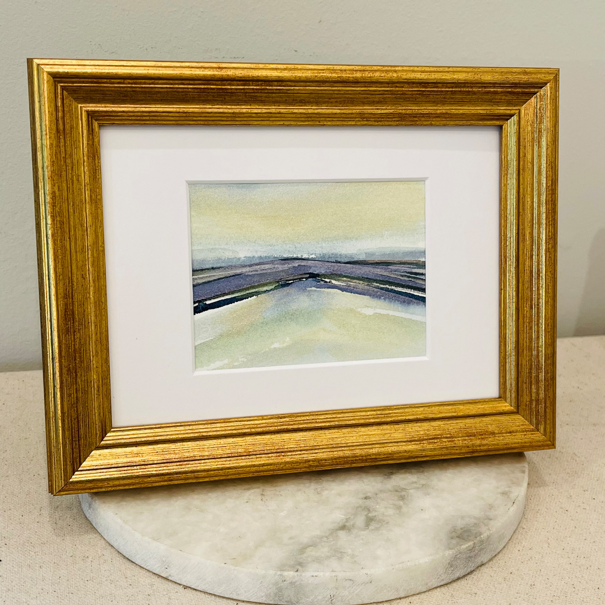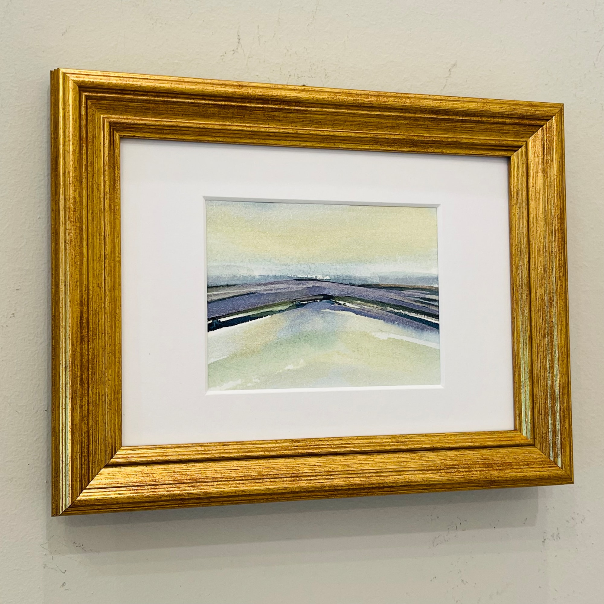 This landscape watercolor is professionally finished with a classic burnished gold frame.