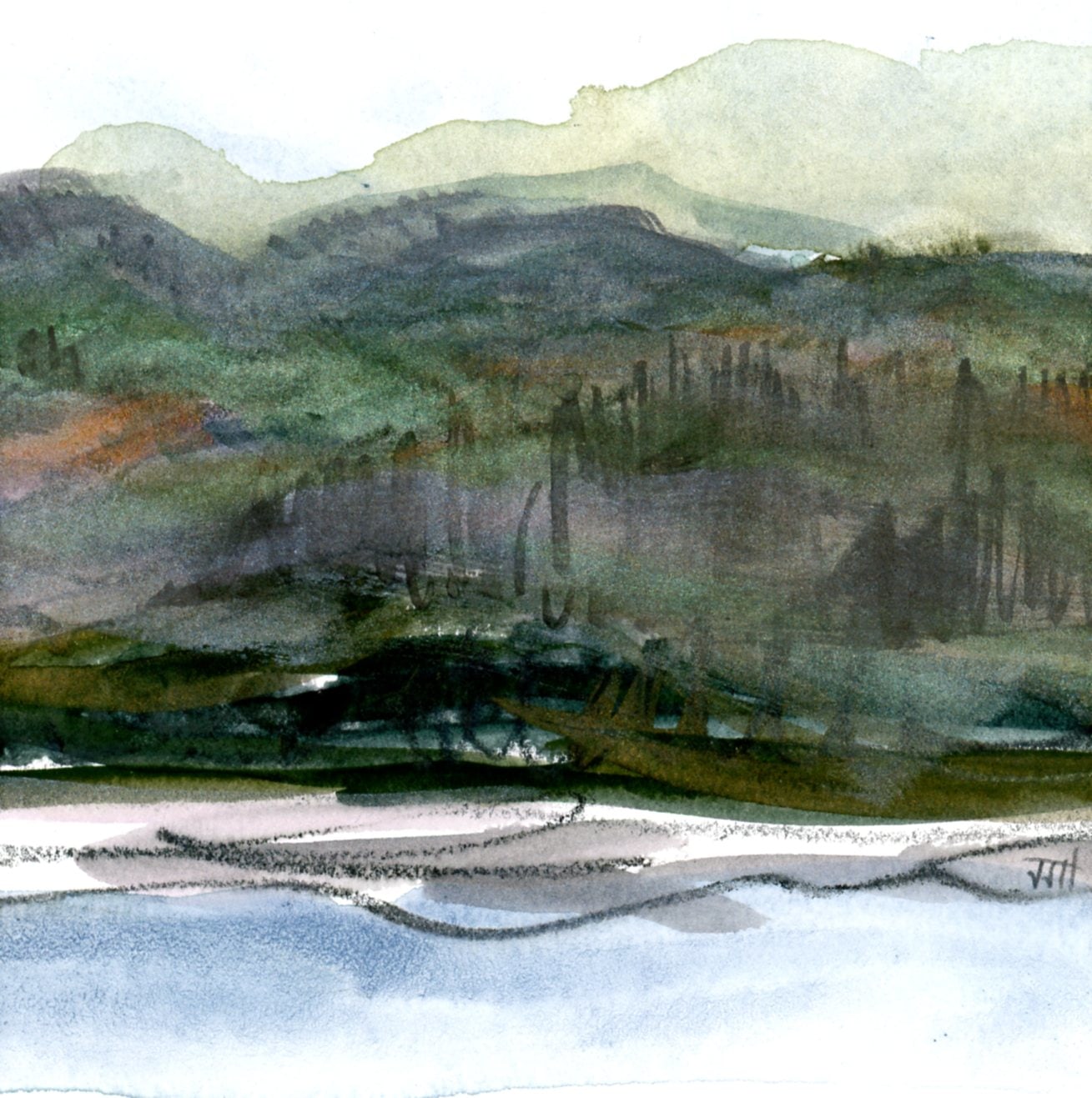 Bevel-cut archival-quality mat showcases 5x5 original watercolor and graphite. Professionally finished with backing board in clear acrylic sleeve — ready for framing.