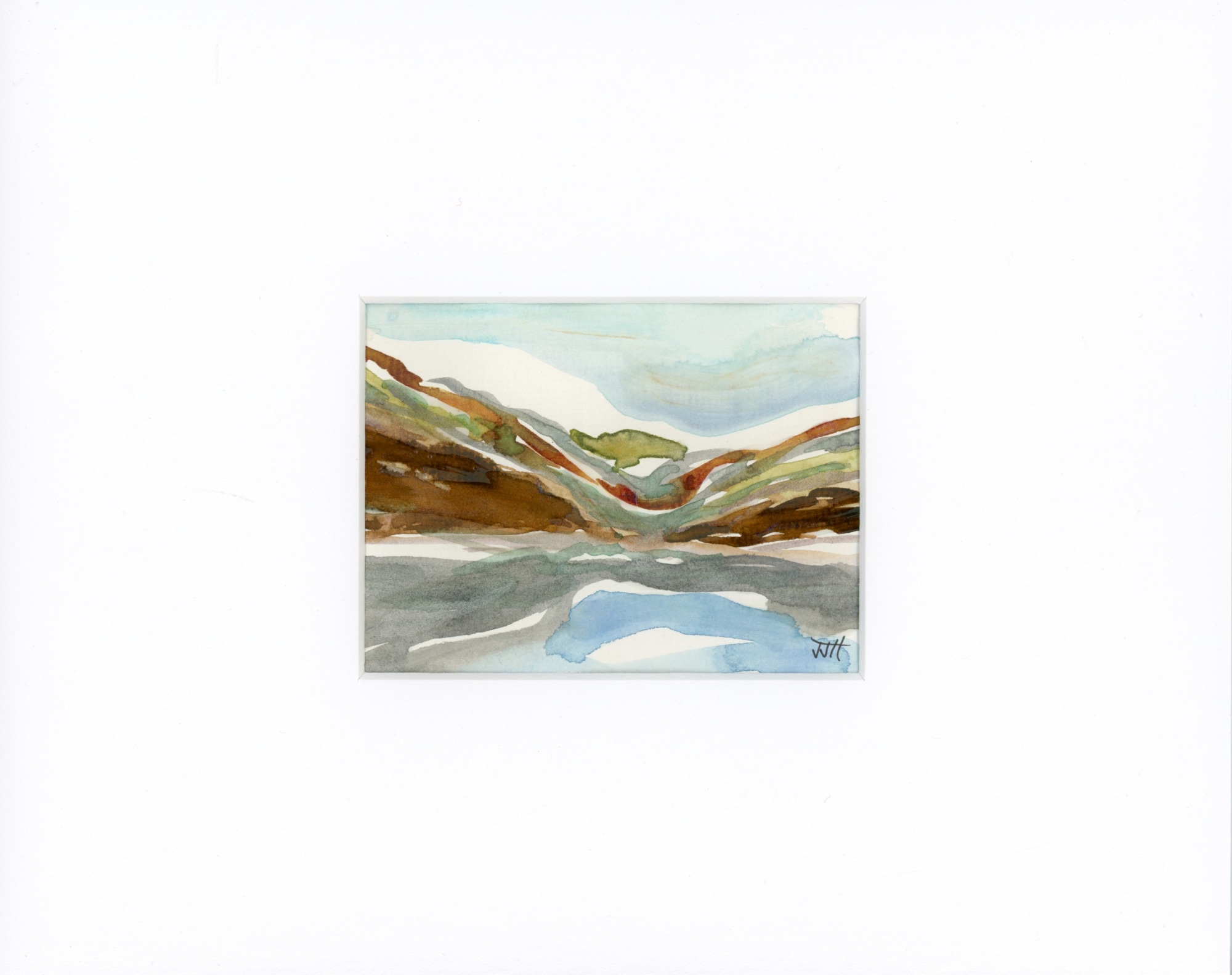 This landscape watercolor is professionally finished with a delicate beaded, burnished gold frame. This is a dramatic and intriguing piece of art. A custom blue and white palette makes this a great addition to any decor.