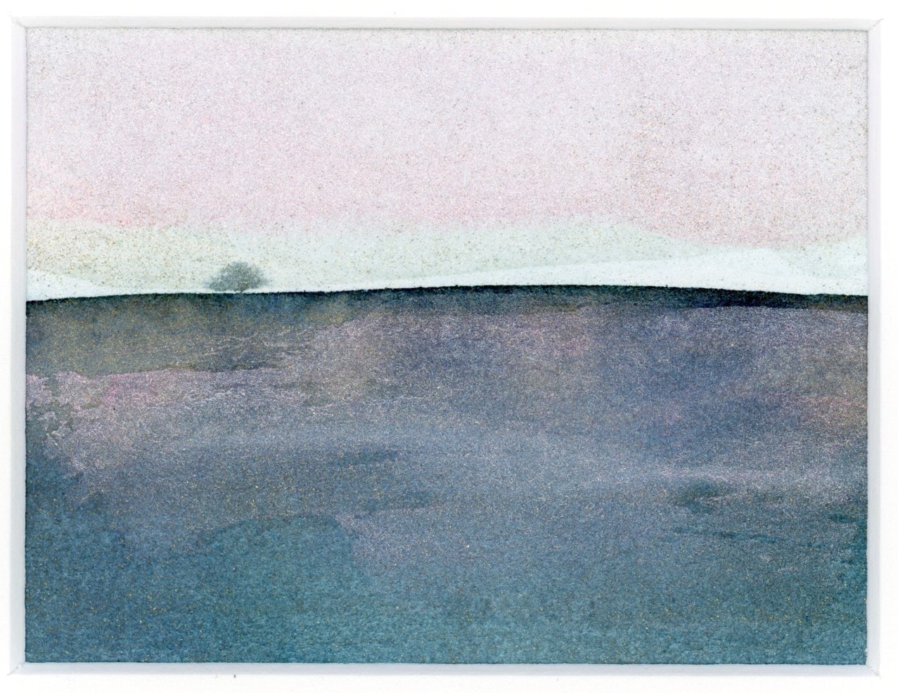 This shimmery, hushed landscape with its lone tree is a one-of-a-kind. This watercolor is professionally finished with a classic burnished gold frame.