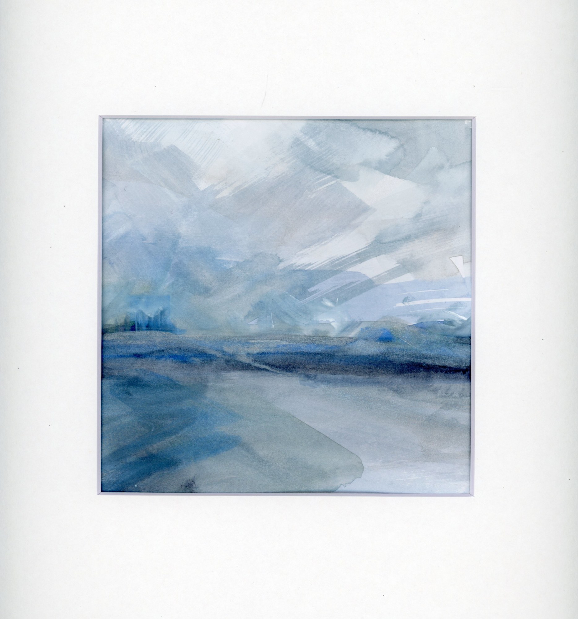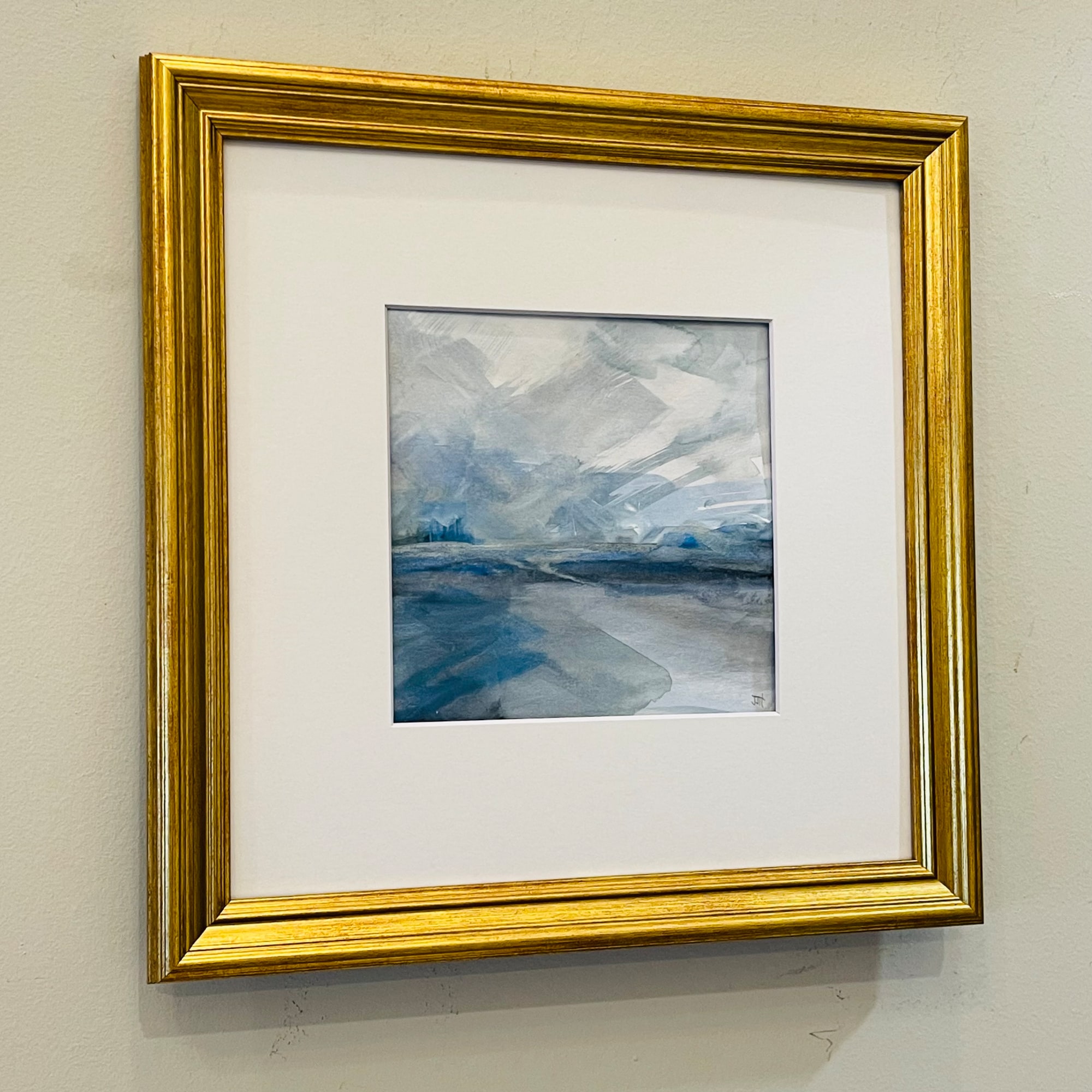 This abstract shimmery grey and blue watercolor is professionally finished with a classic burnished gold frame. The feeling of boundless clouds mixed with rain, sky, and the land is exhilarating to the eye. A custom paint palette makes this a classic for any decor.