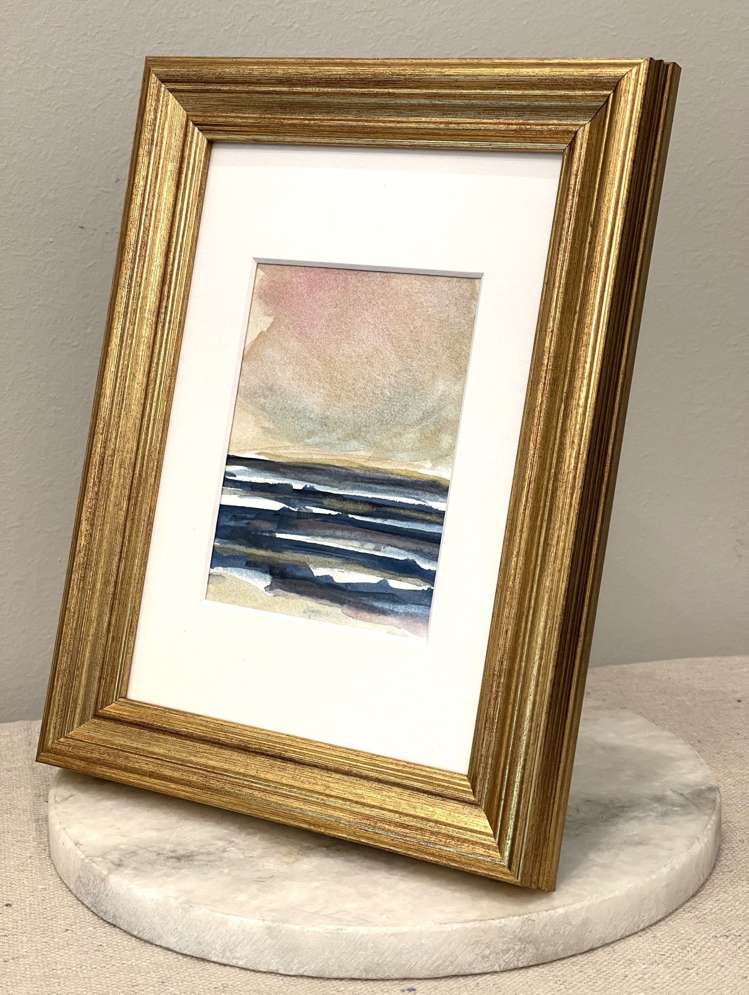 This coastal landscape watercolor is professionally finished with a classic burnished gold frame. The ocean waves and the shimmery cloud-filled sky transport you to a place of calm.