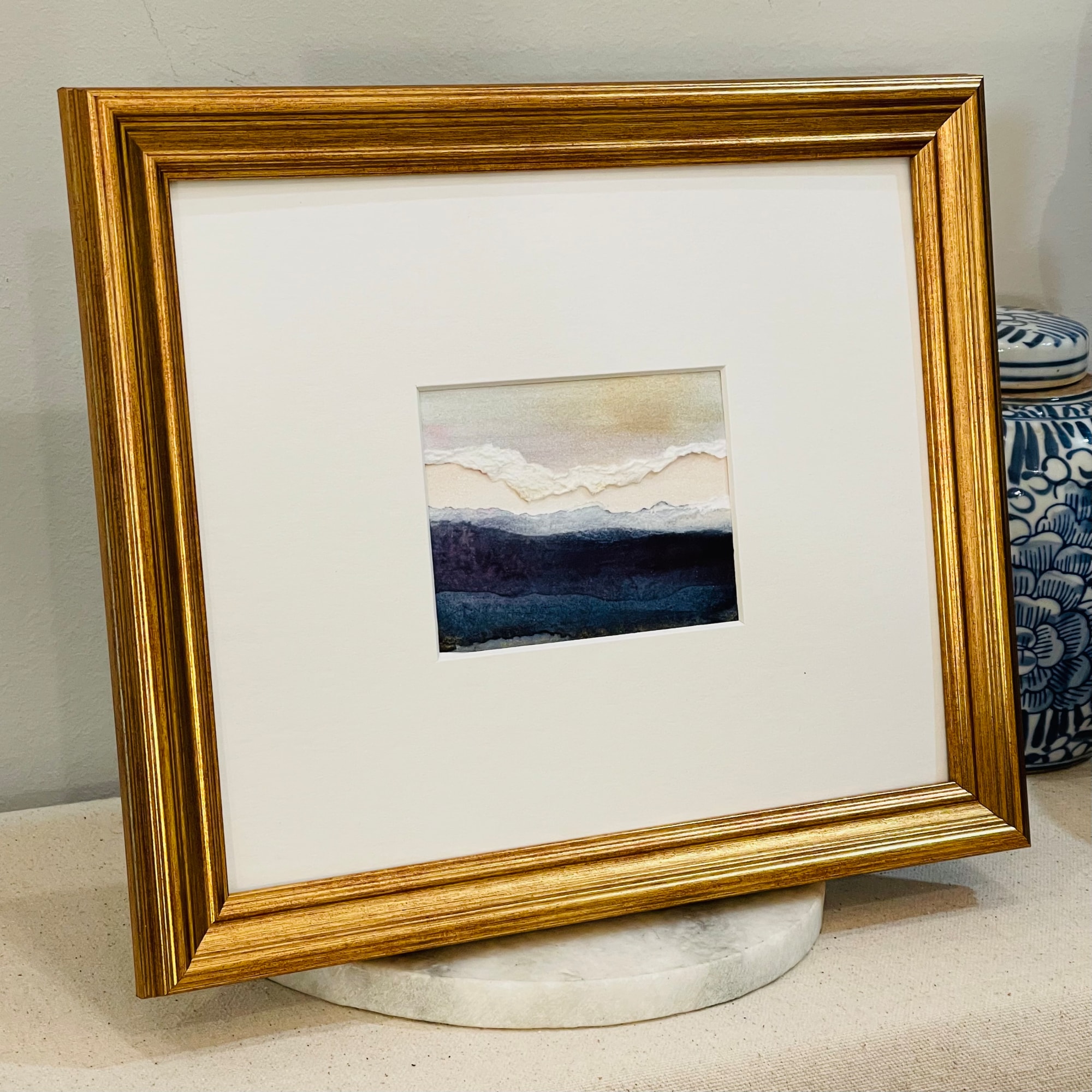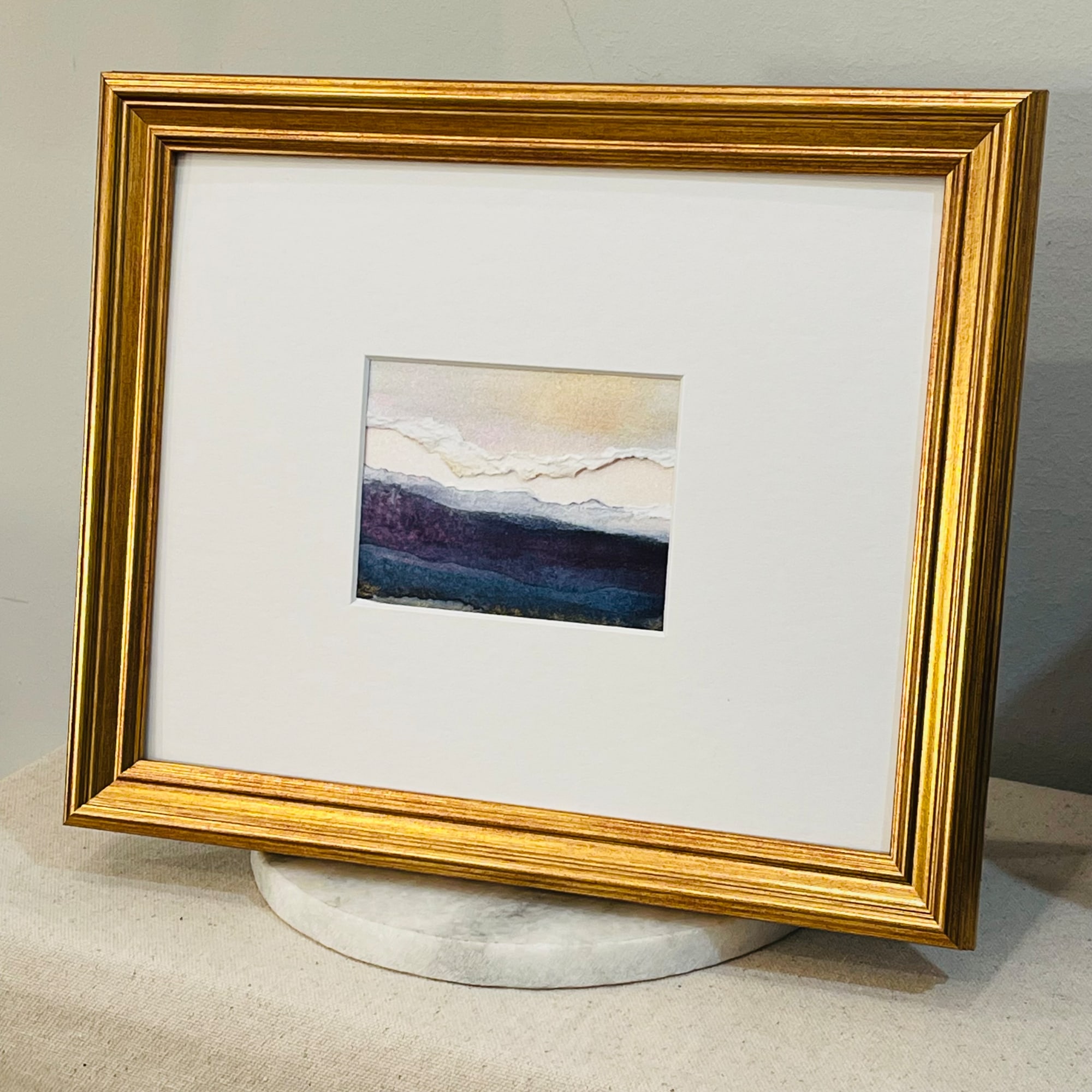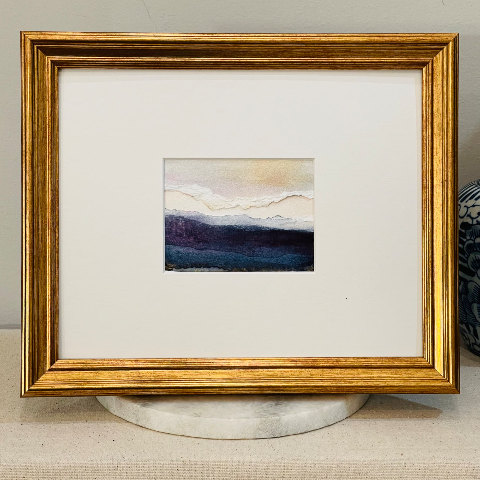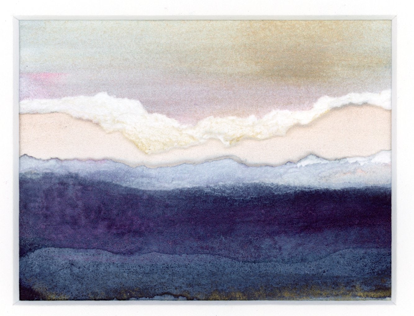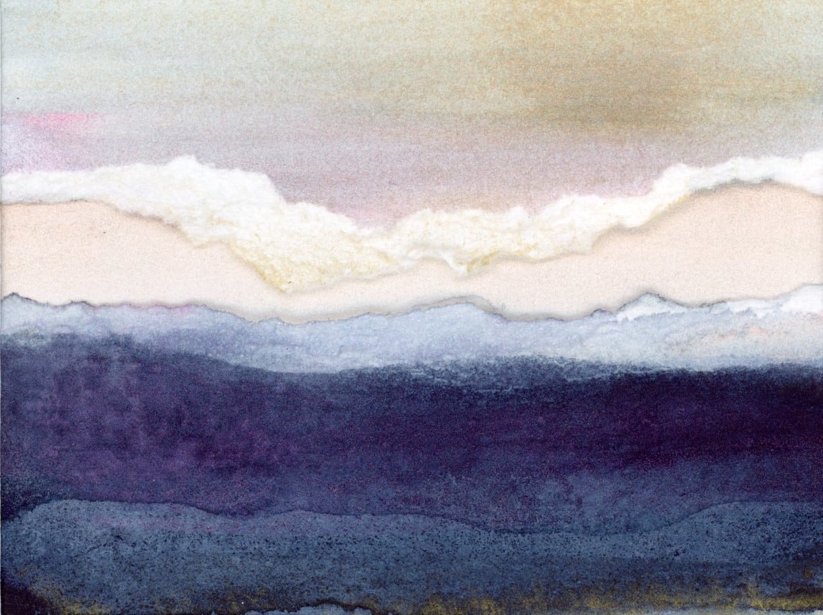 A little note about the art...it was not intentional but a happy accident when I was messing around in the studio. Several pieces of art were bound for the recycle bin. I decided to rip them up and layer them...I love the rolling cloud bank above the purplish-blue-tinged landscape below. And what could be more reminiscent of Kintsugi style than a hopeful pink-sky strip of sunshine emerging in the distance.