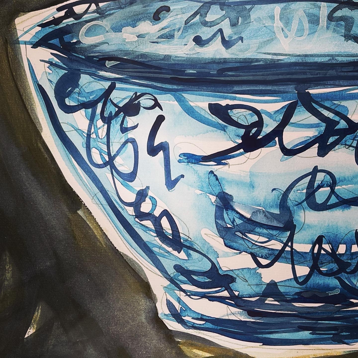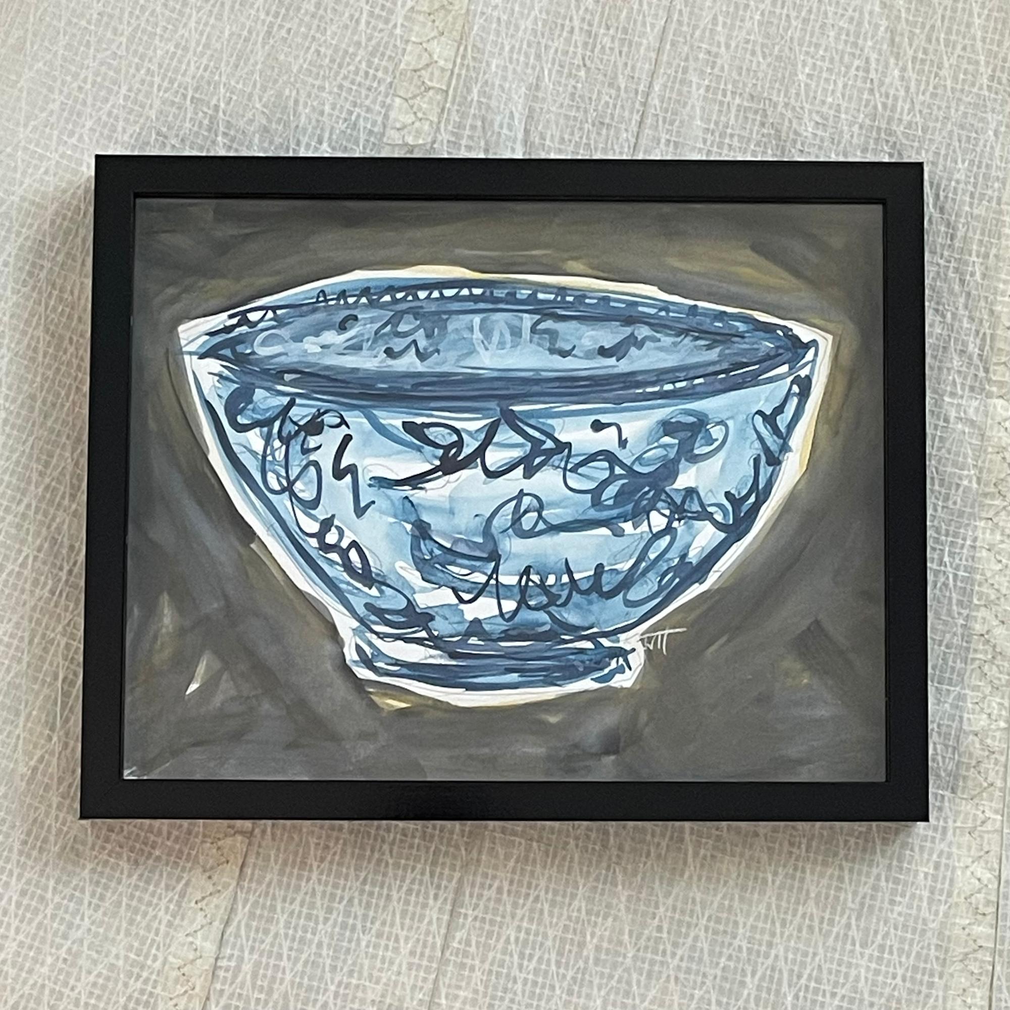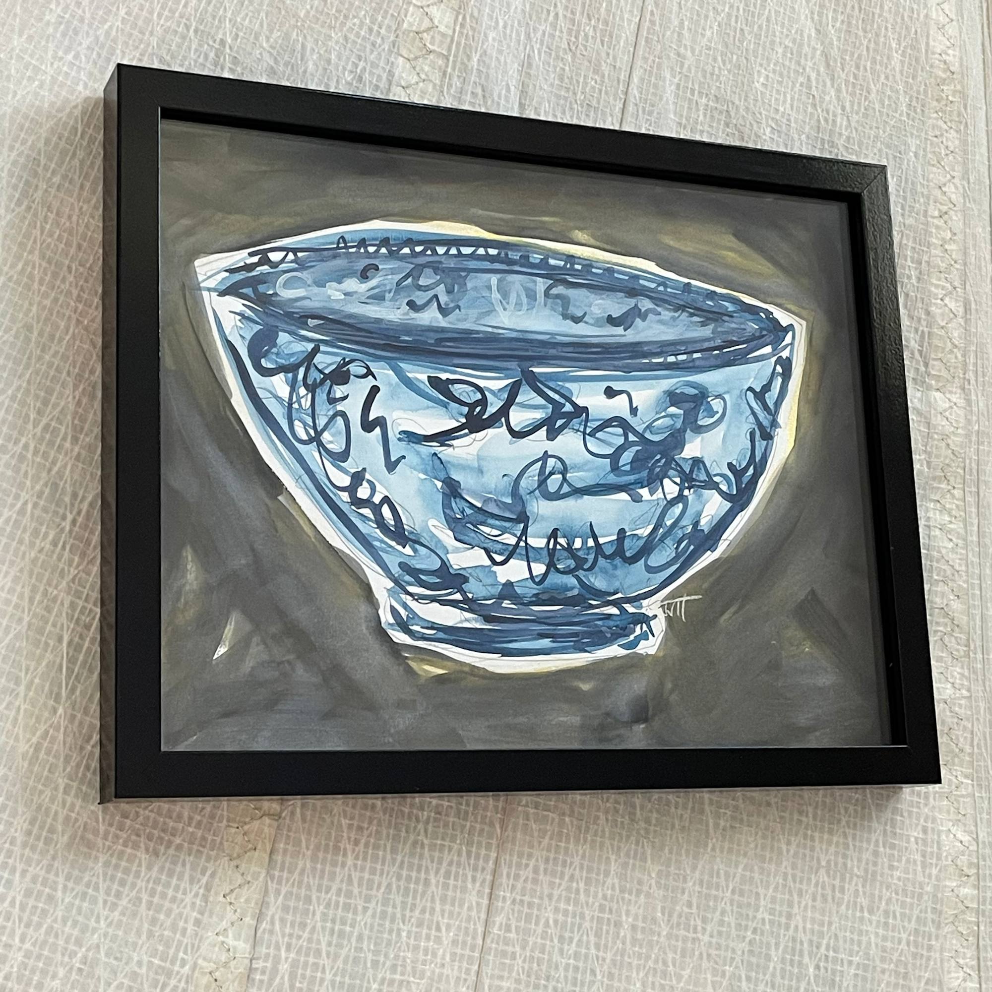 Incredible blue and white Chinoiserie-inspired watercolors. Shimmery metallic gold underpainting with a deep blue palette. Glossy black modern frame, under glass.
