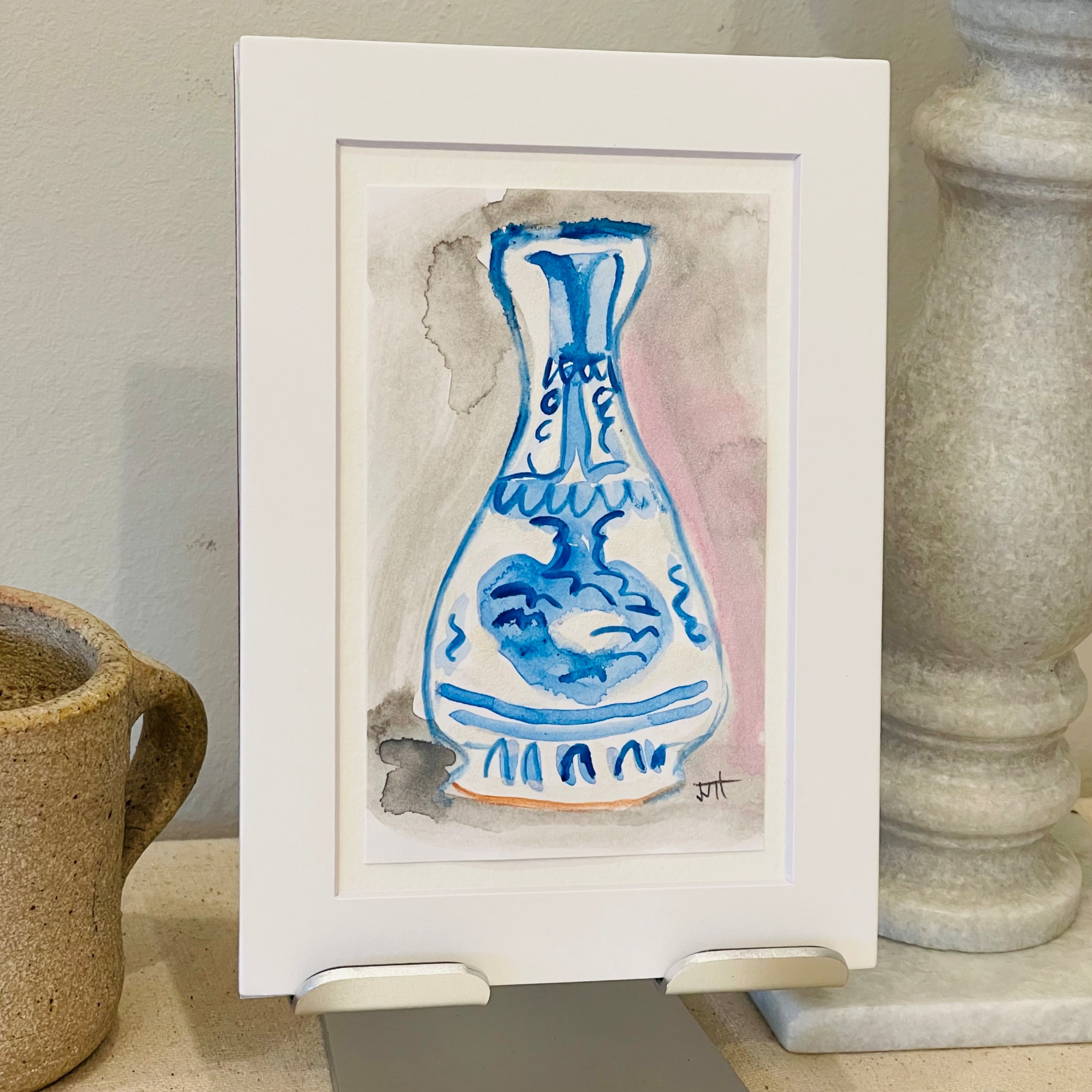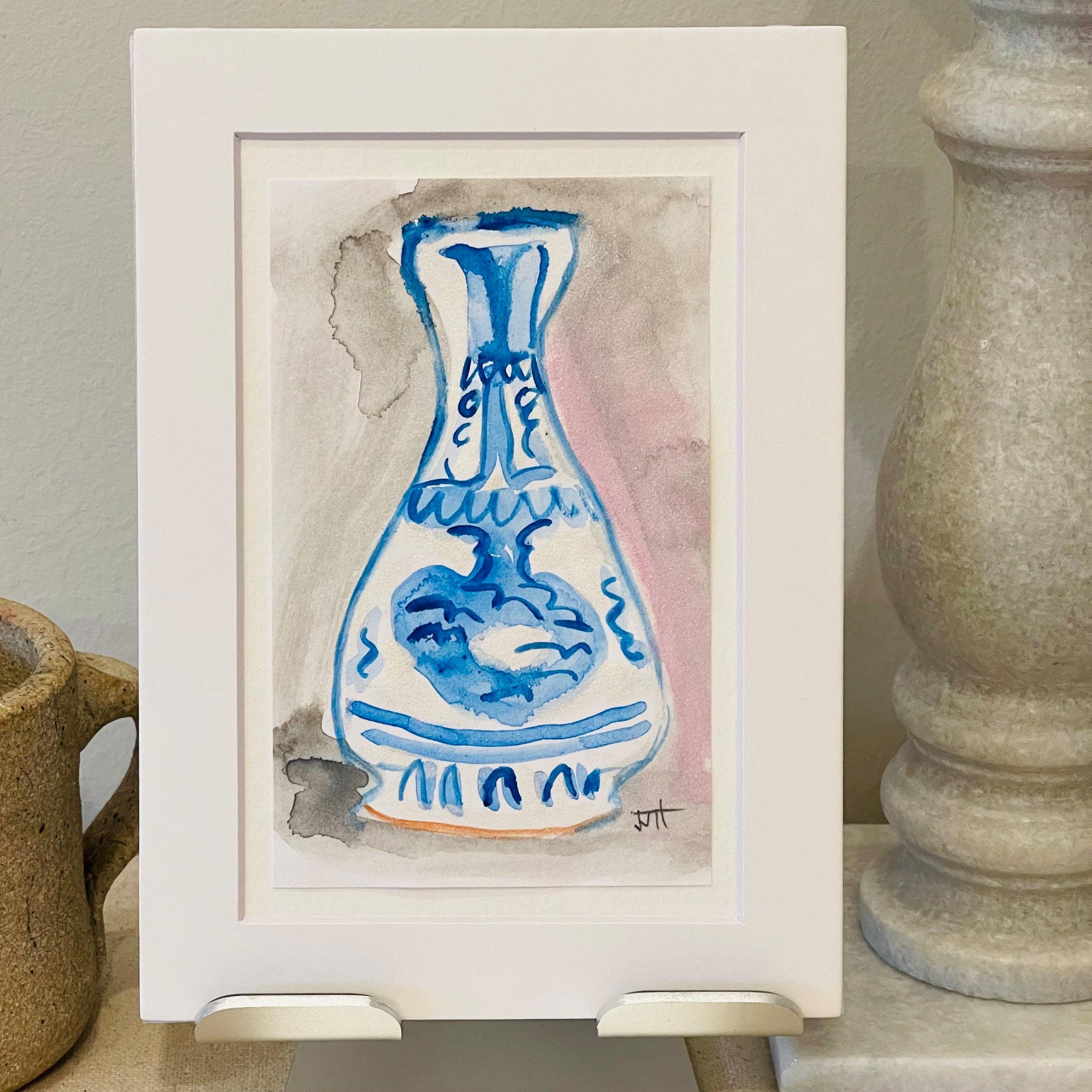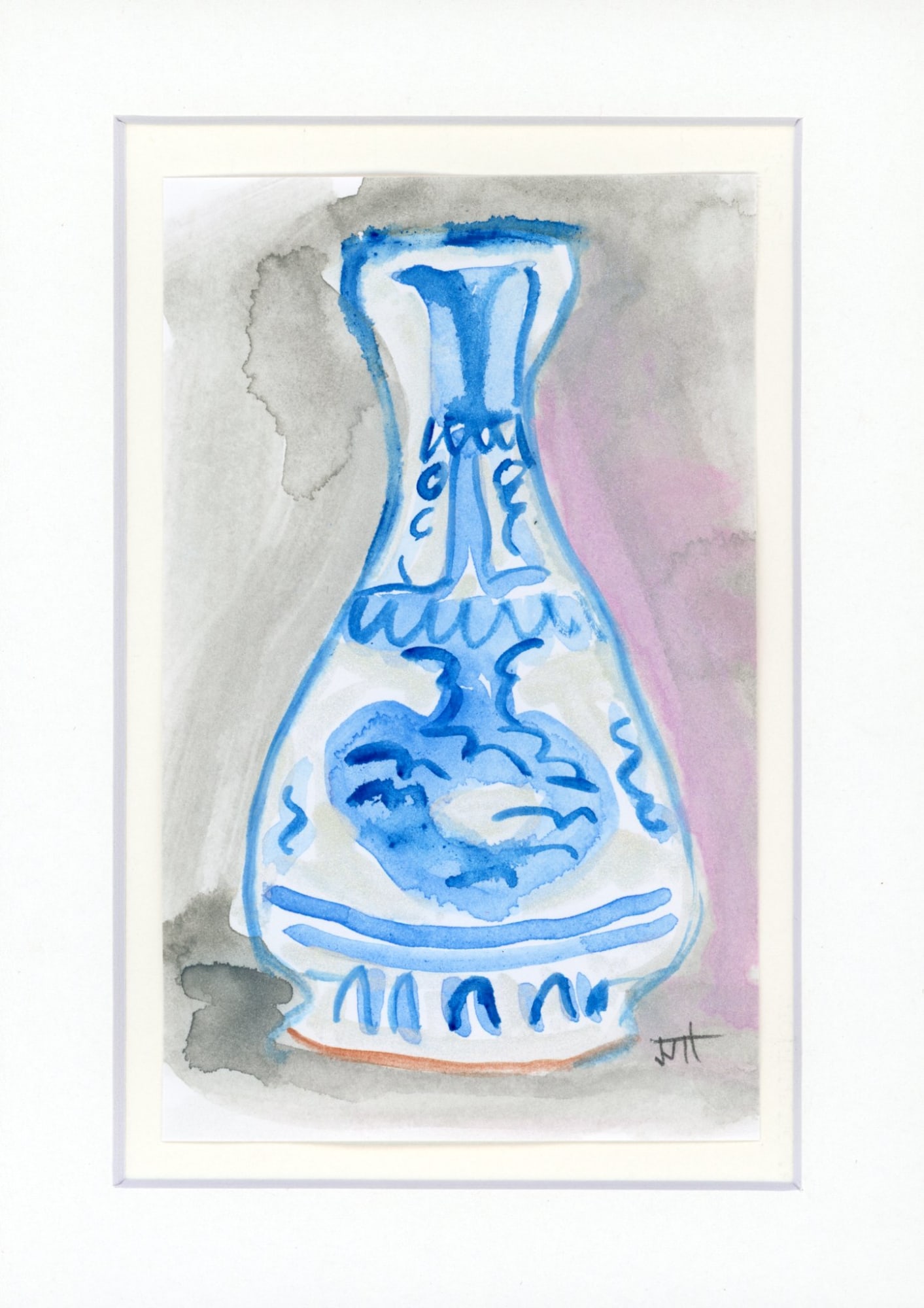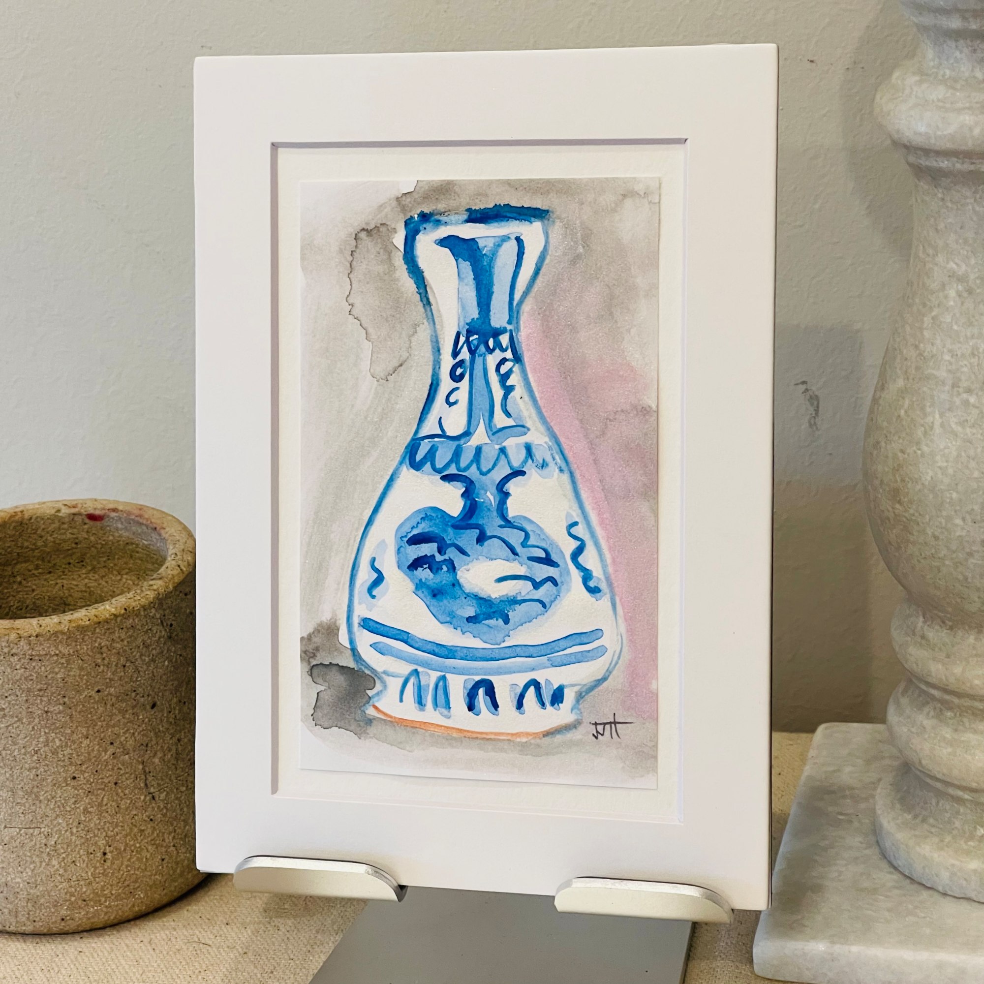 Mounted contemporary mini abstract mid-14th century vase watercolor.