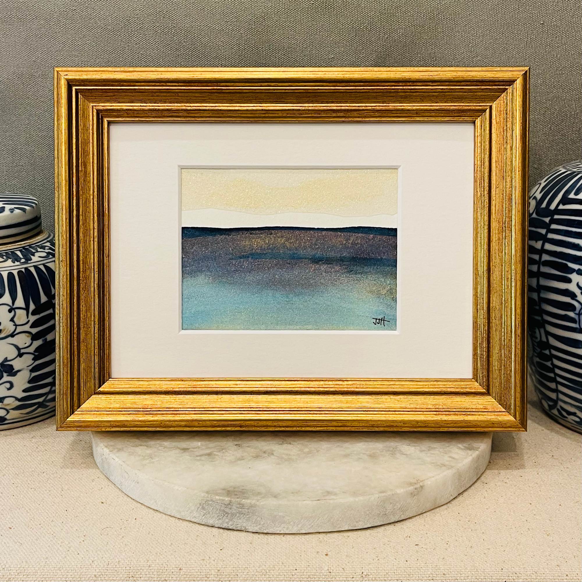 A contemporary abstract landscape with shimmering jewel undertones and shimmery golden skies. This seascape watercolor is professionally finished with a classic burnished gold frame.