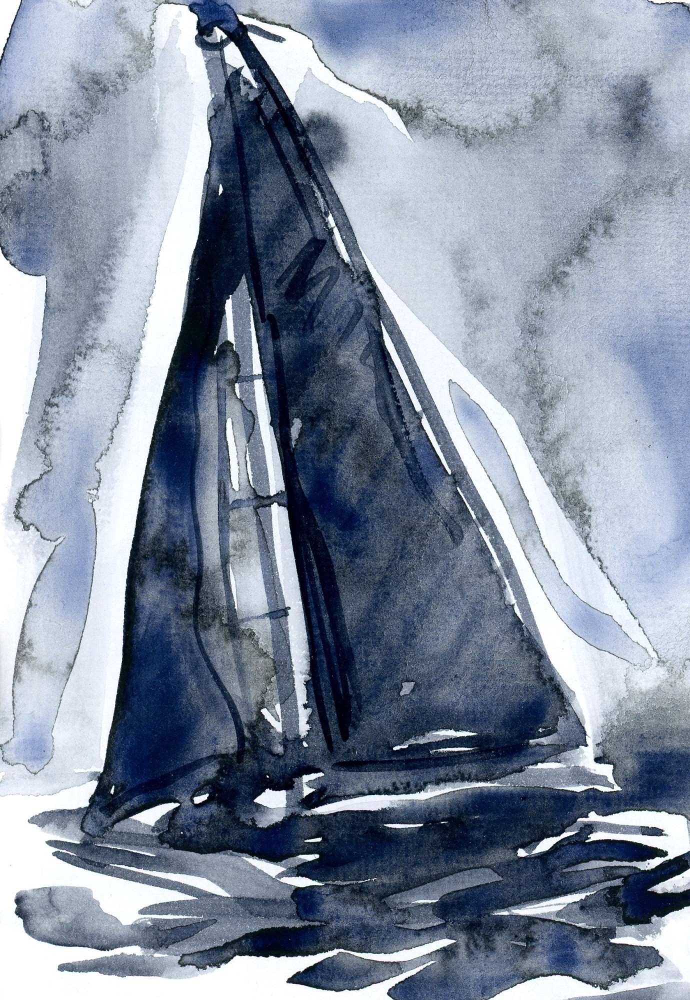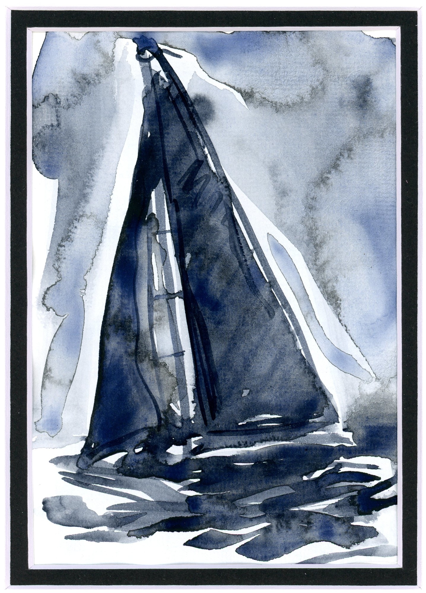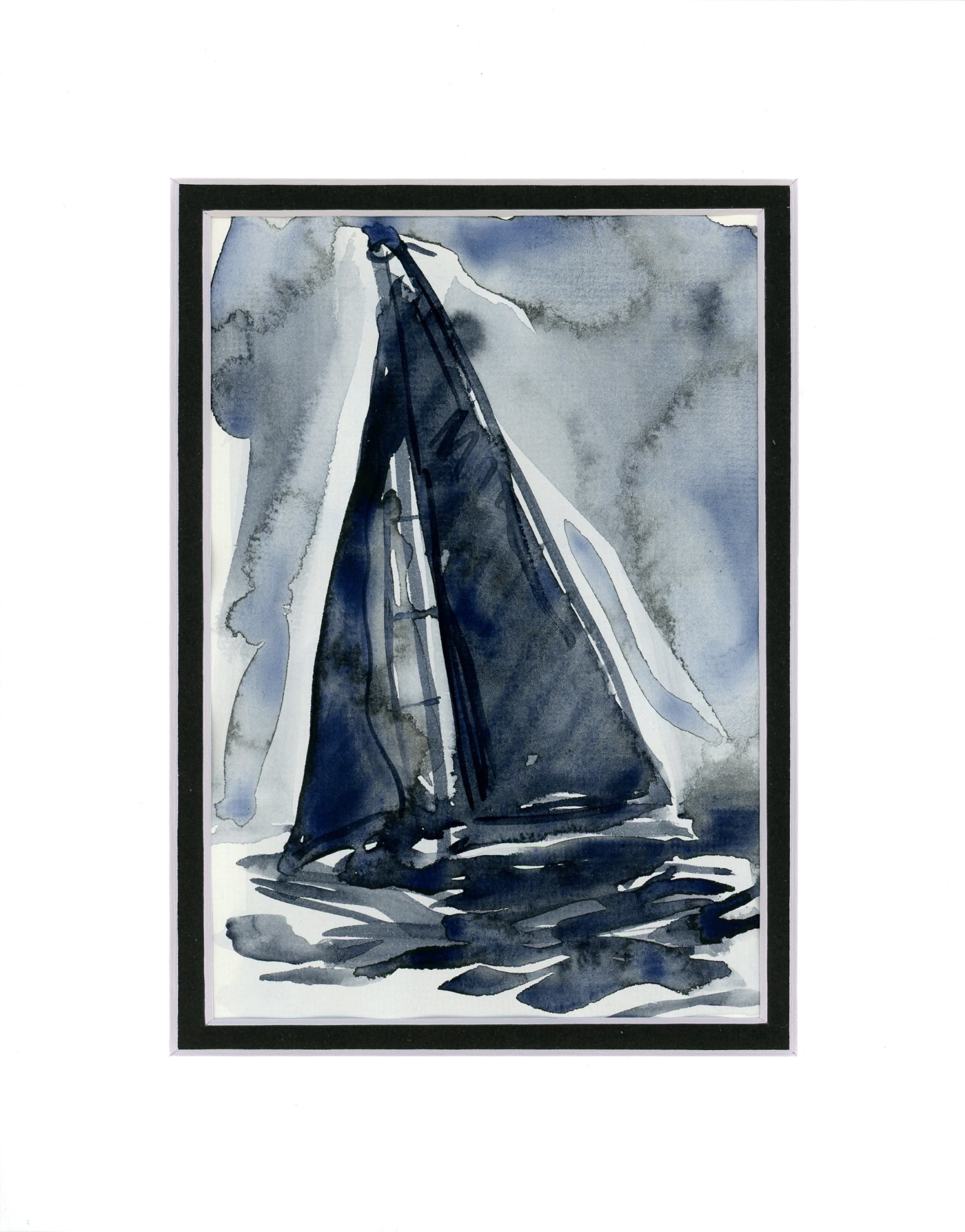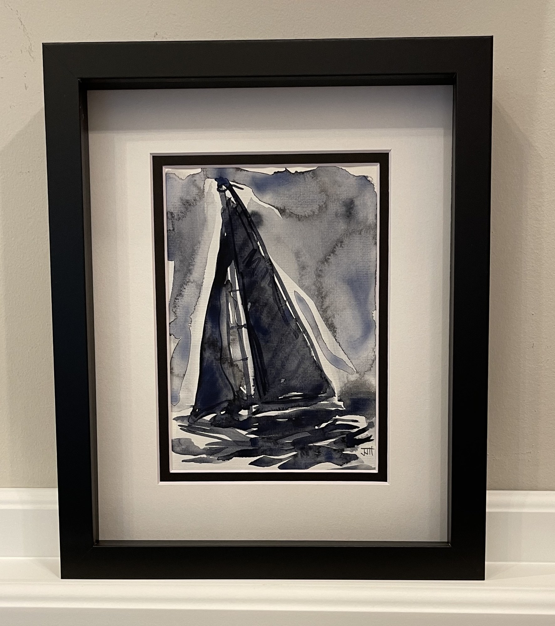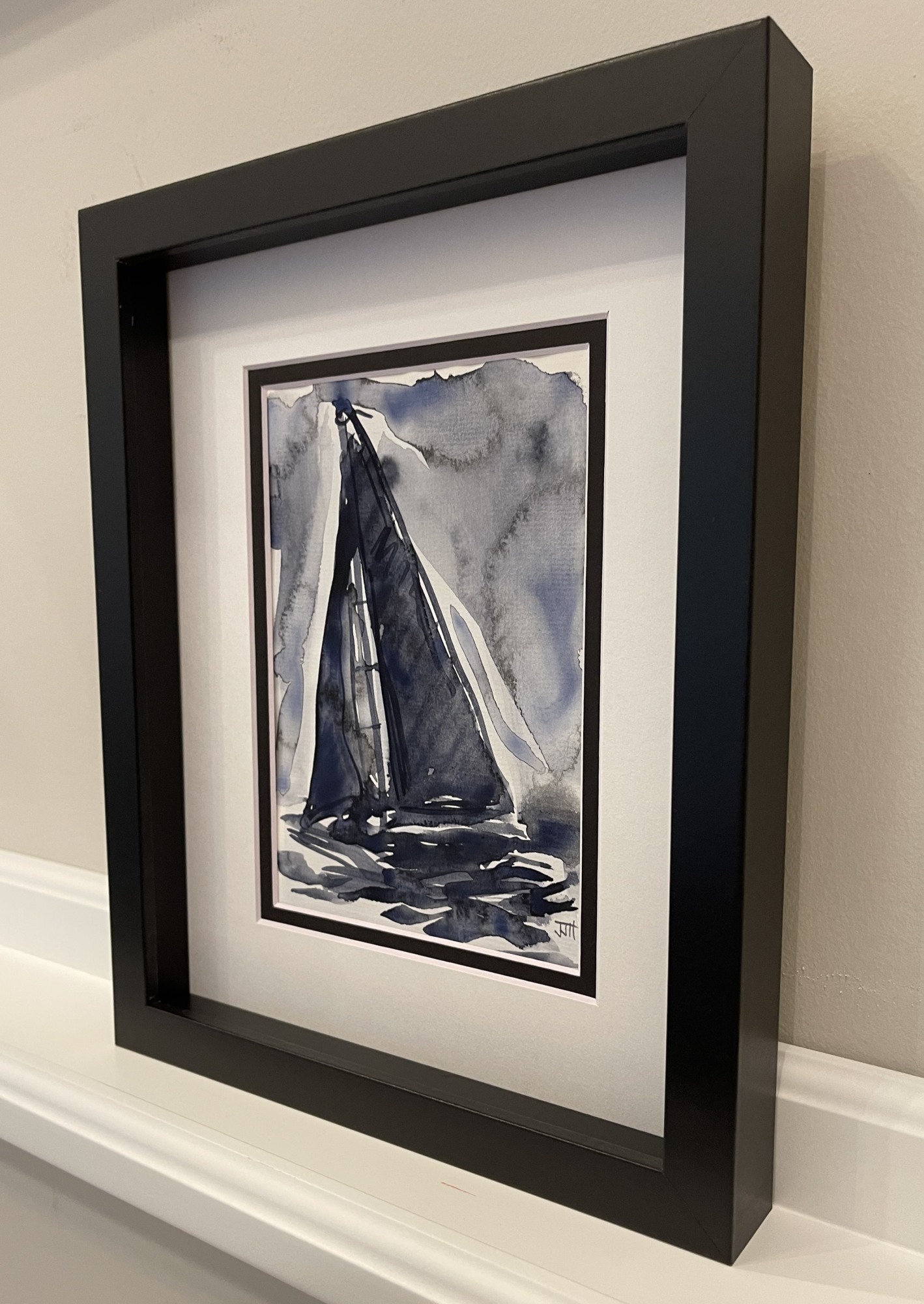 Nautical-inspired Payne's grey and white watercolor; bold black frame, double mat under glass.