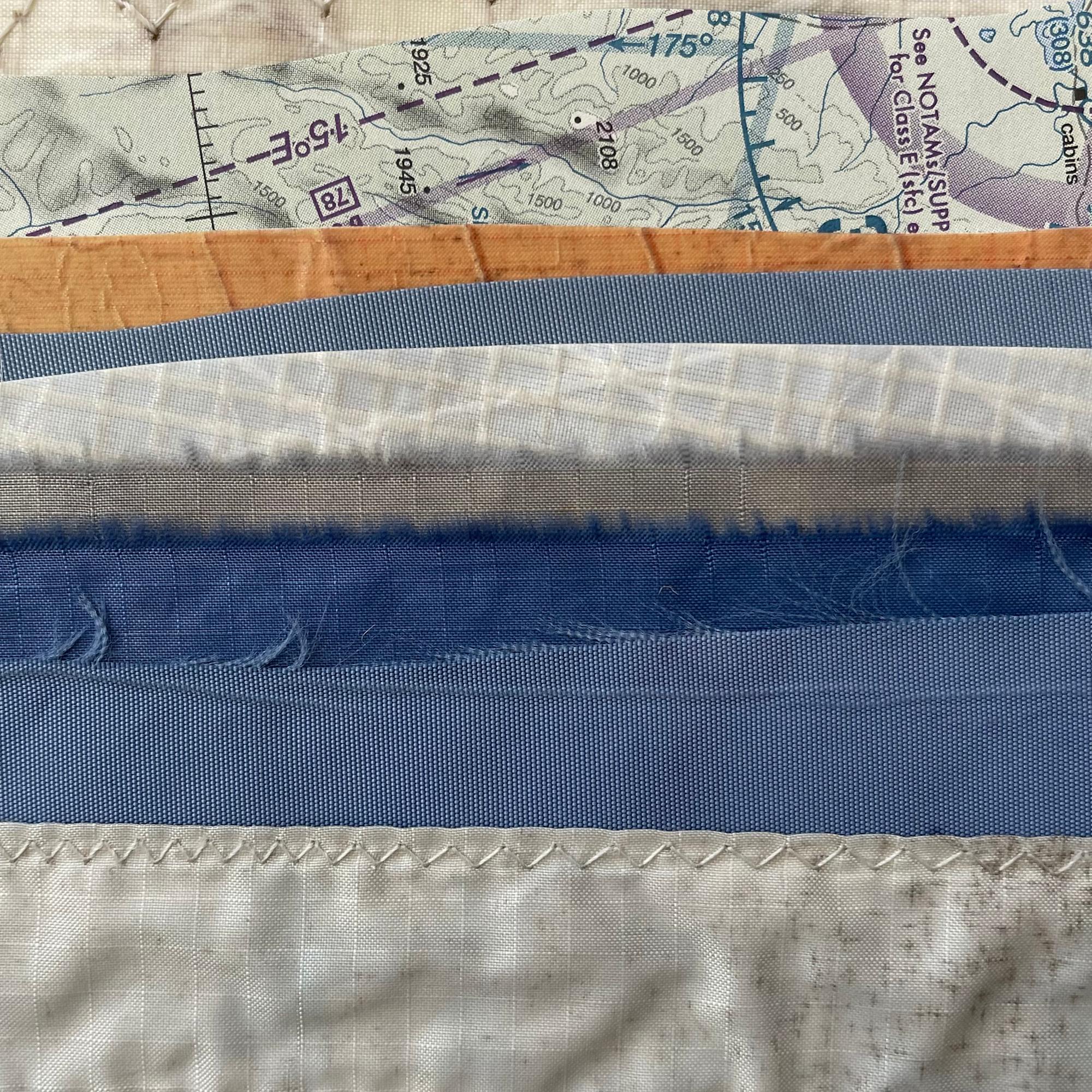 Special attributes included might be: retired nautical sails, marine cloths, vintage dupioni silks, aviation topographic charts, watercolor paints, fabric dyes, and more.