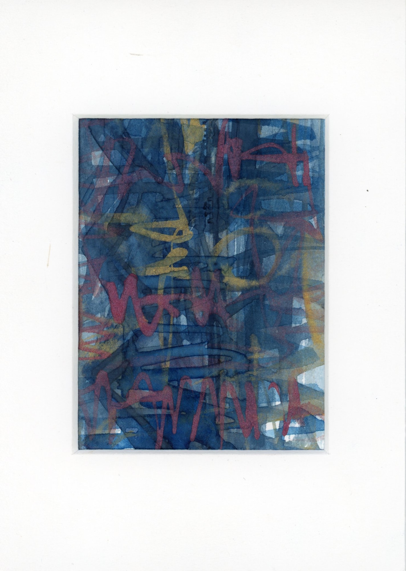 Bevel-cut archival-quality mat showcases original petite abstract watercolor. Professionally finished with backing board in clear acrylic sleeve — ready for framing.