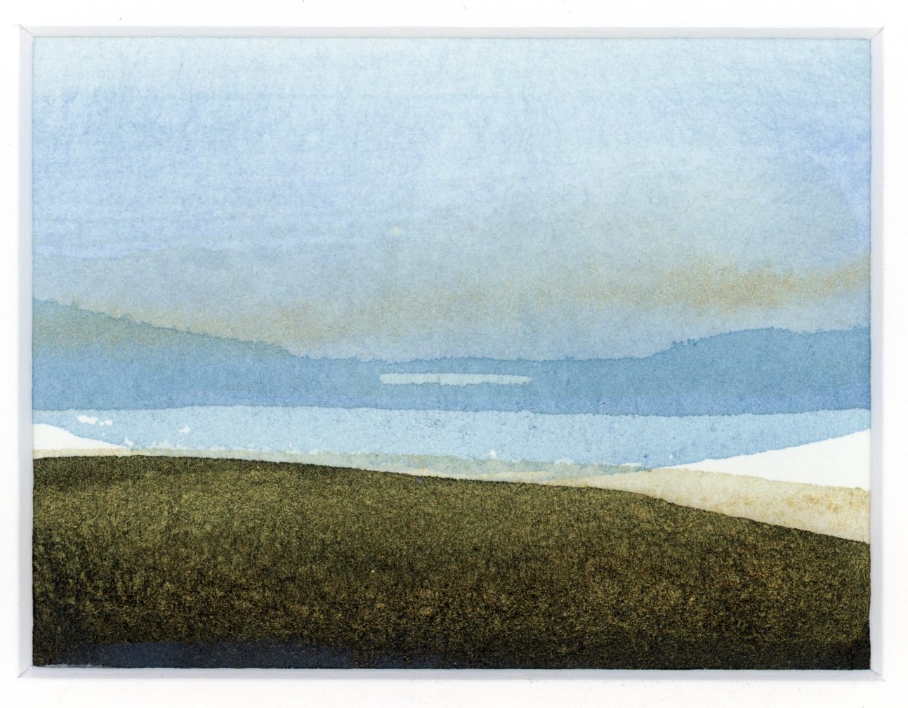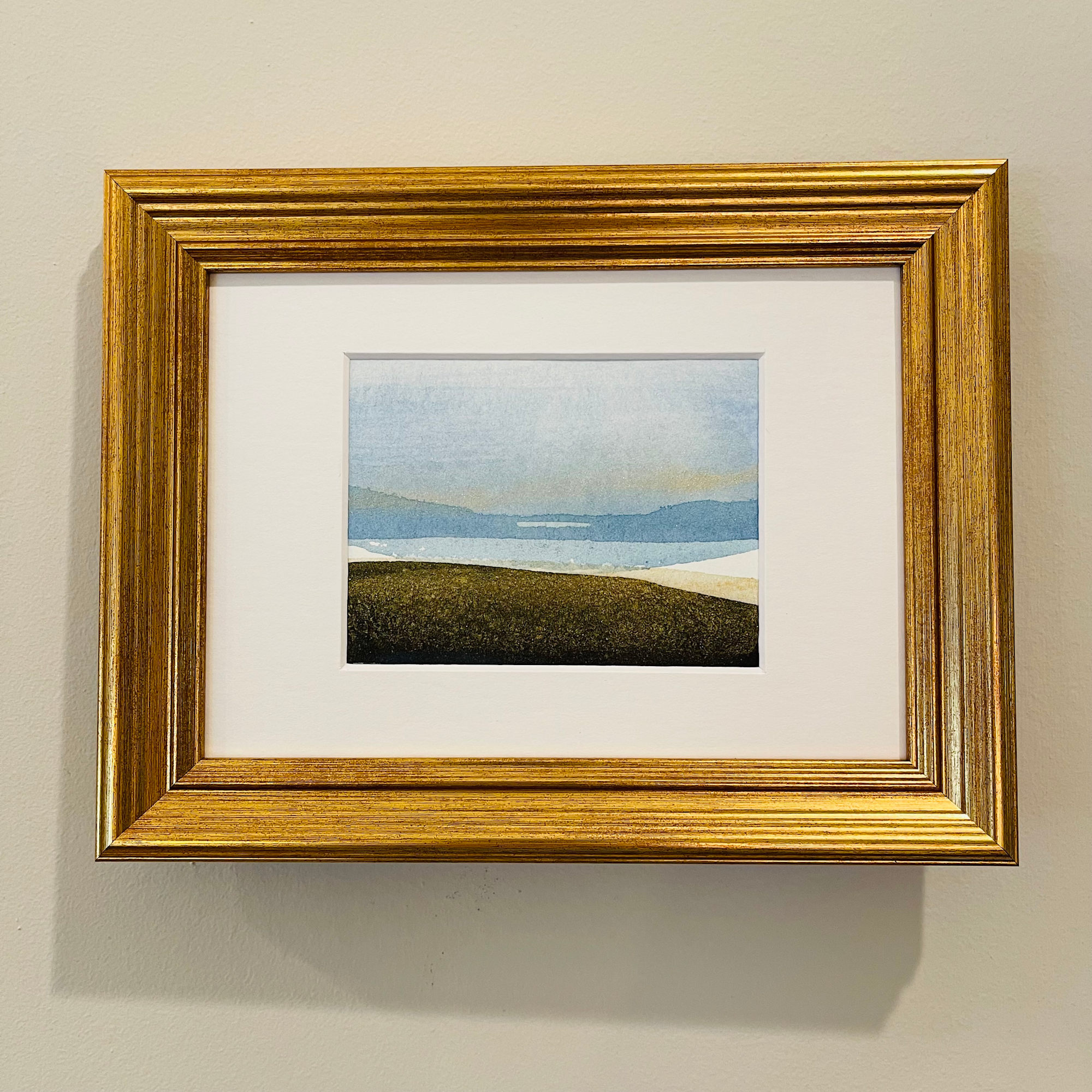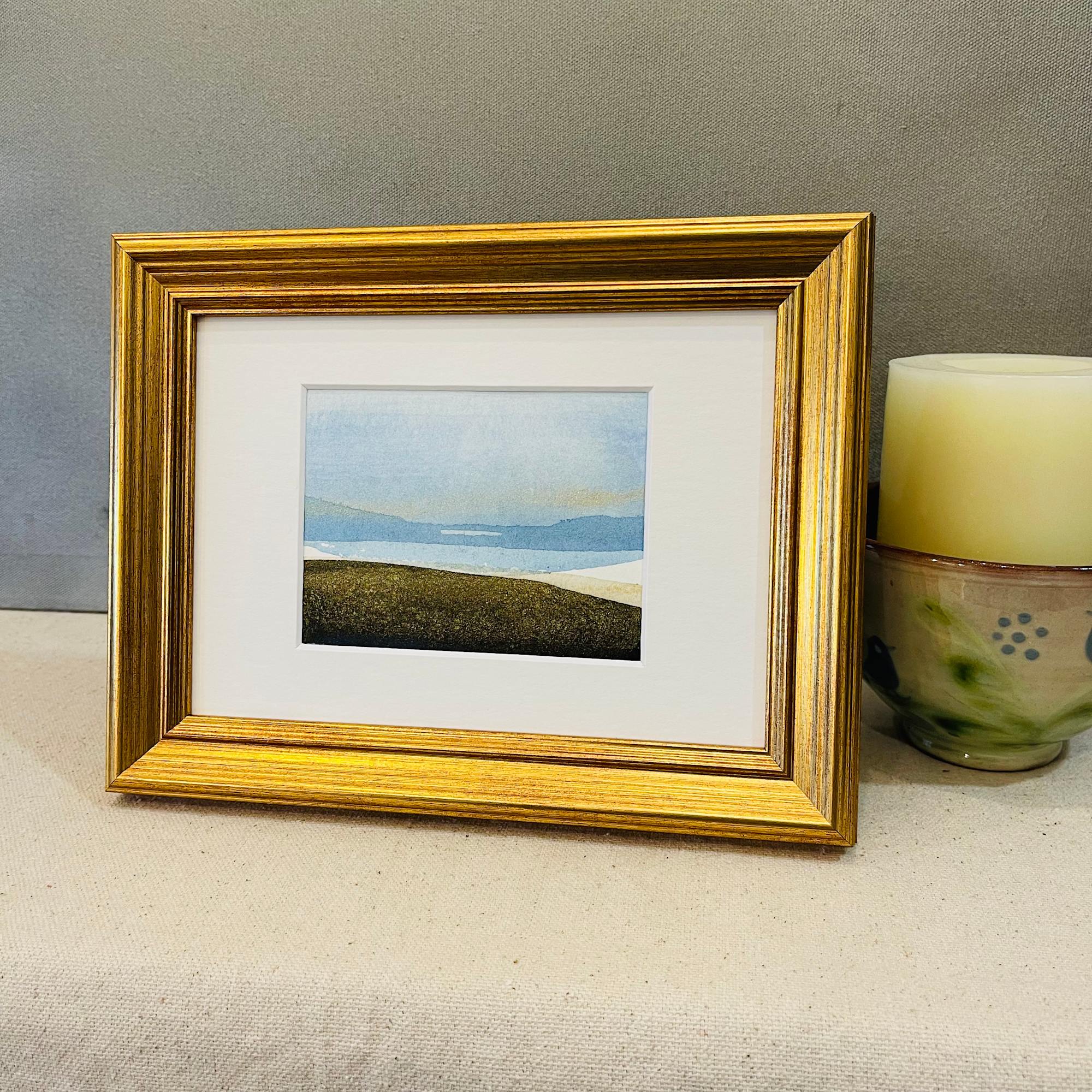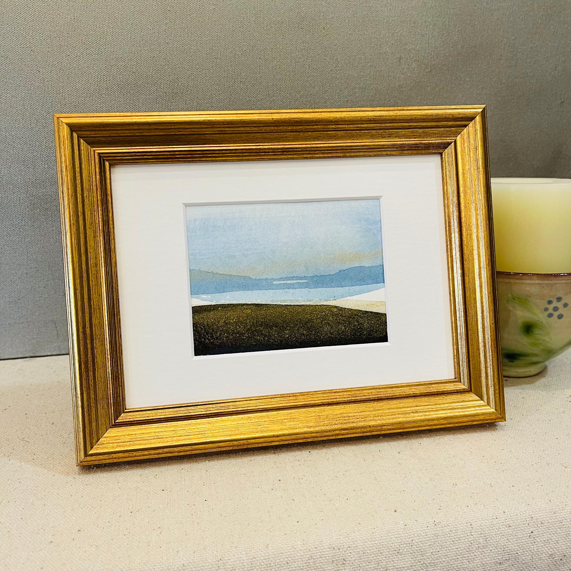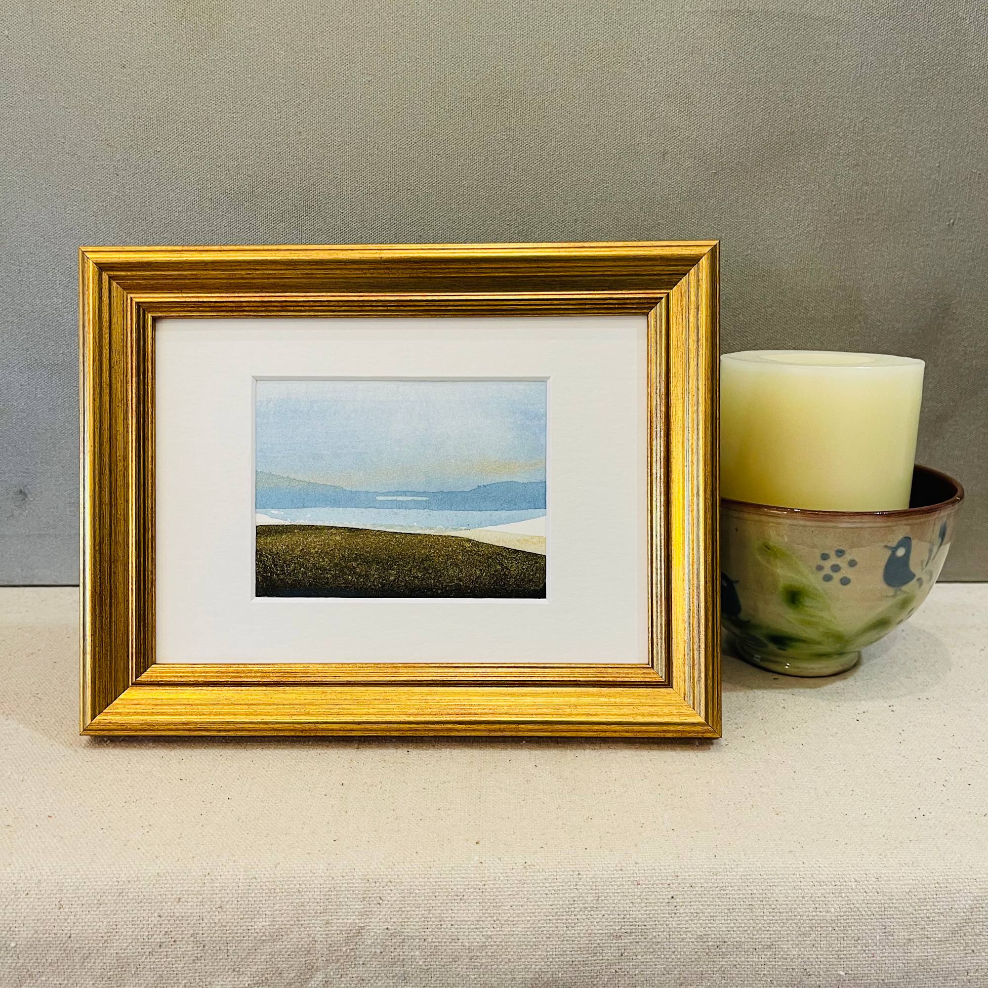 The burnished gold frame showcases golden streaks of sunlight on the hushed and silent landscape.
