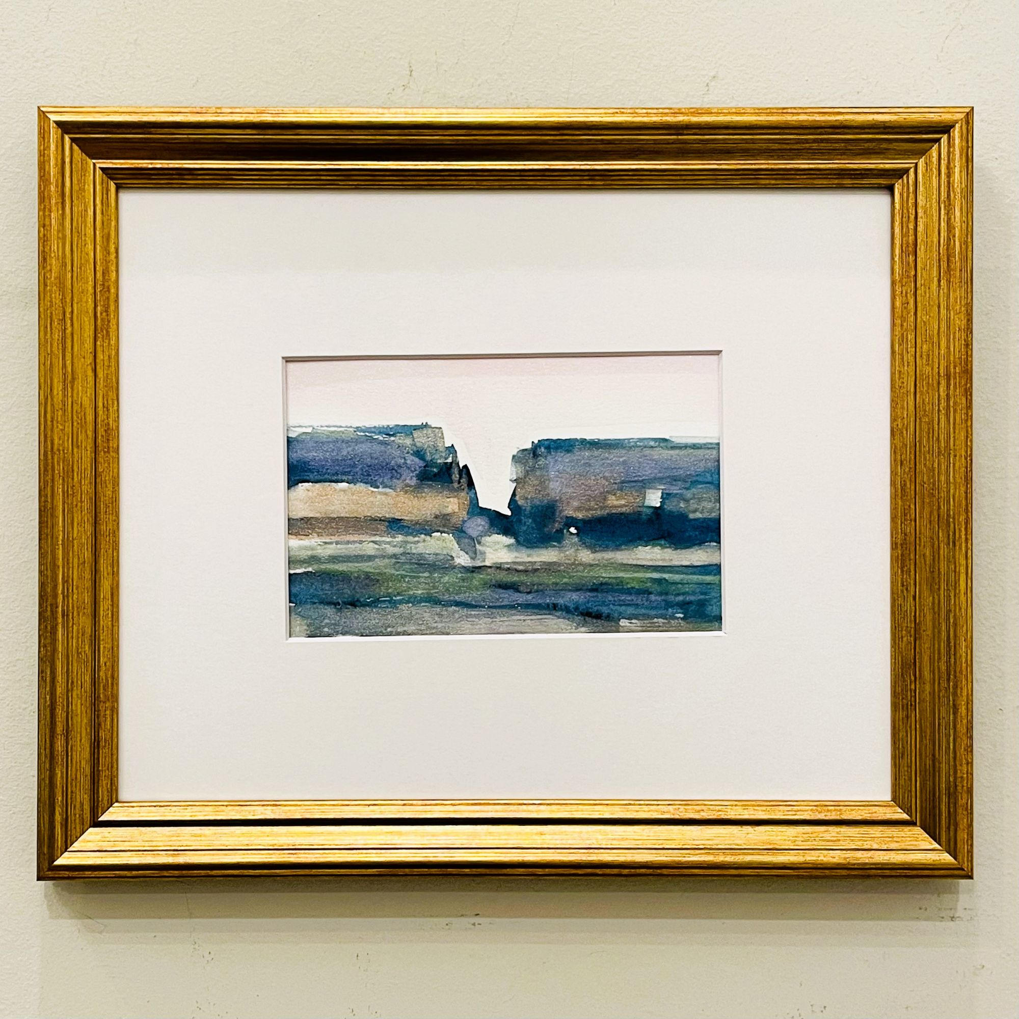 This pearlescent-hued canyon landscape watercolor is professionally finished with a classic burnished gold frame.