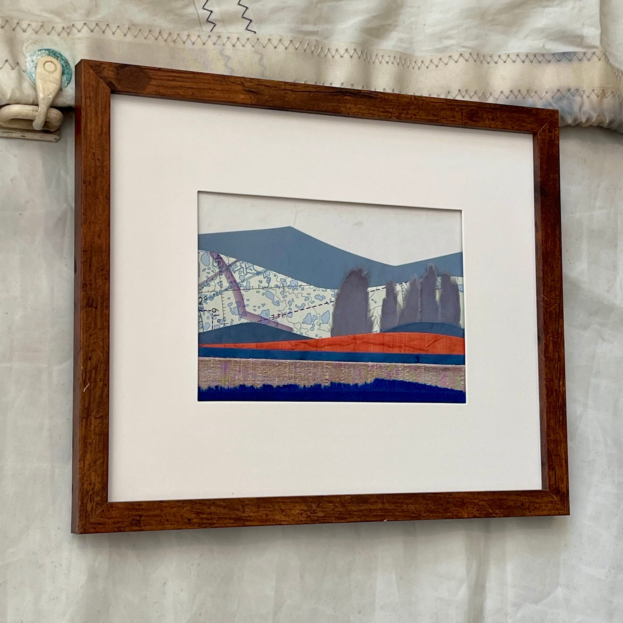 Repurposed "retired" nautical sail, aviation chart and dupioni silk mixed media art.