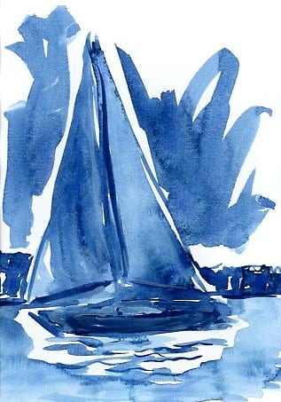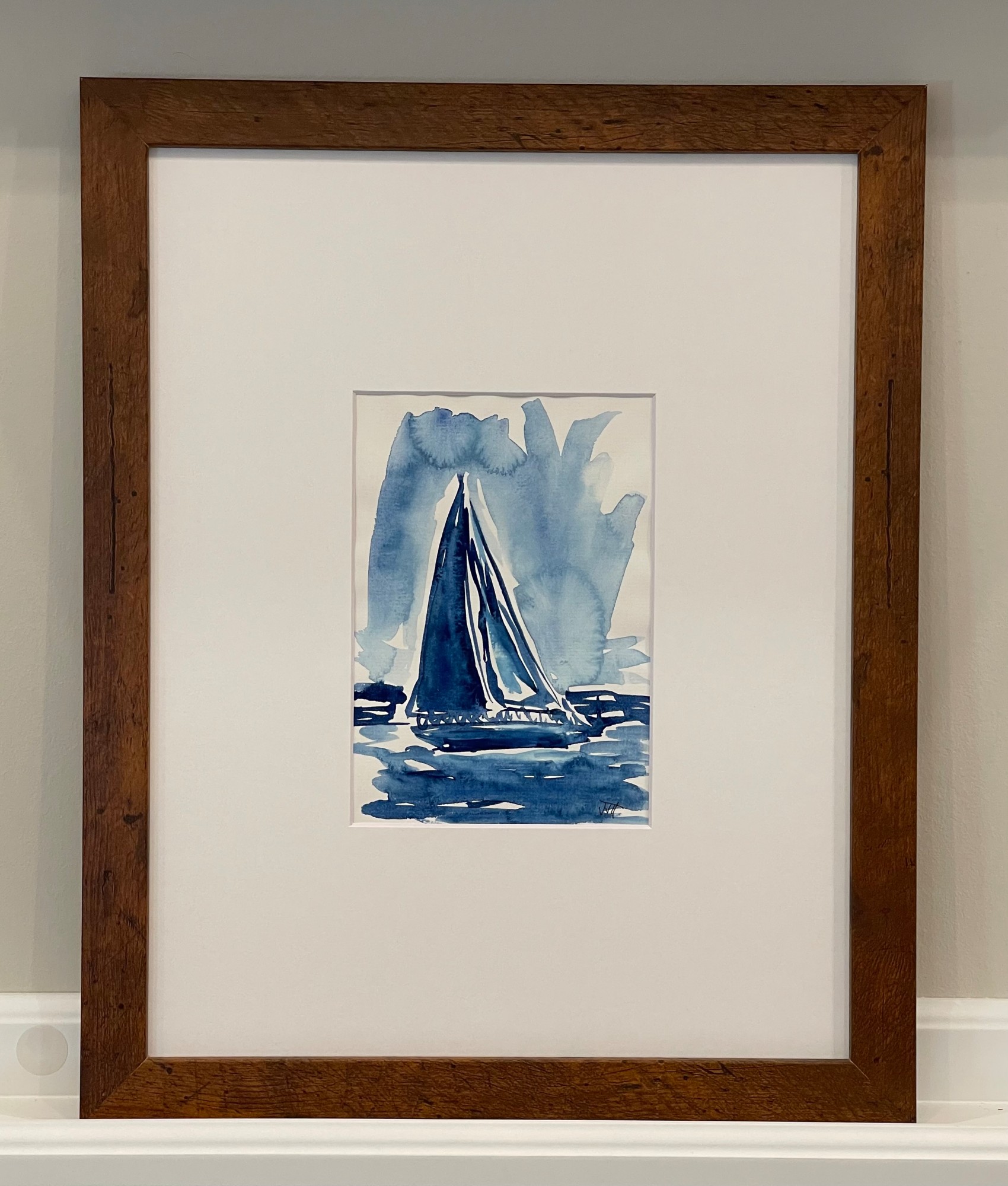 Nautical-inspired blue and white watercolor; honey wood frame, matted under glass.