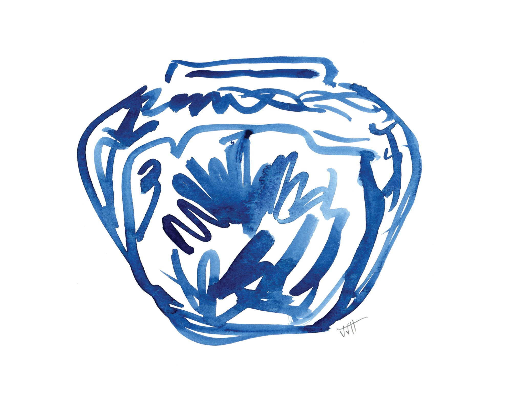 Abstract indigo chinoiserie bowl watercolor; matted and ready to frame.