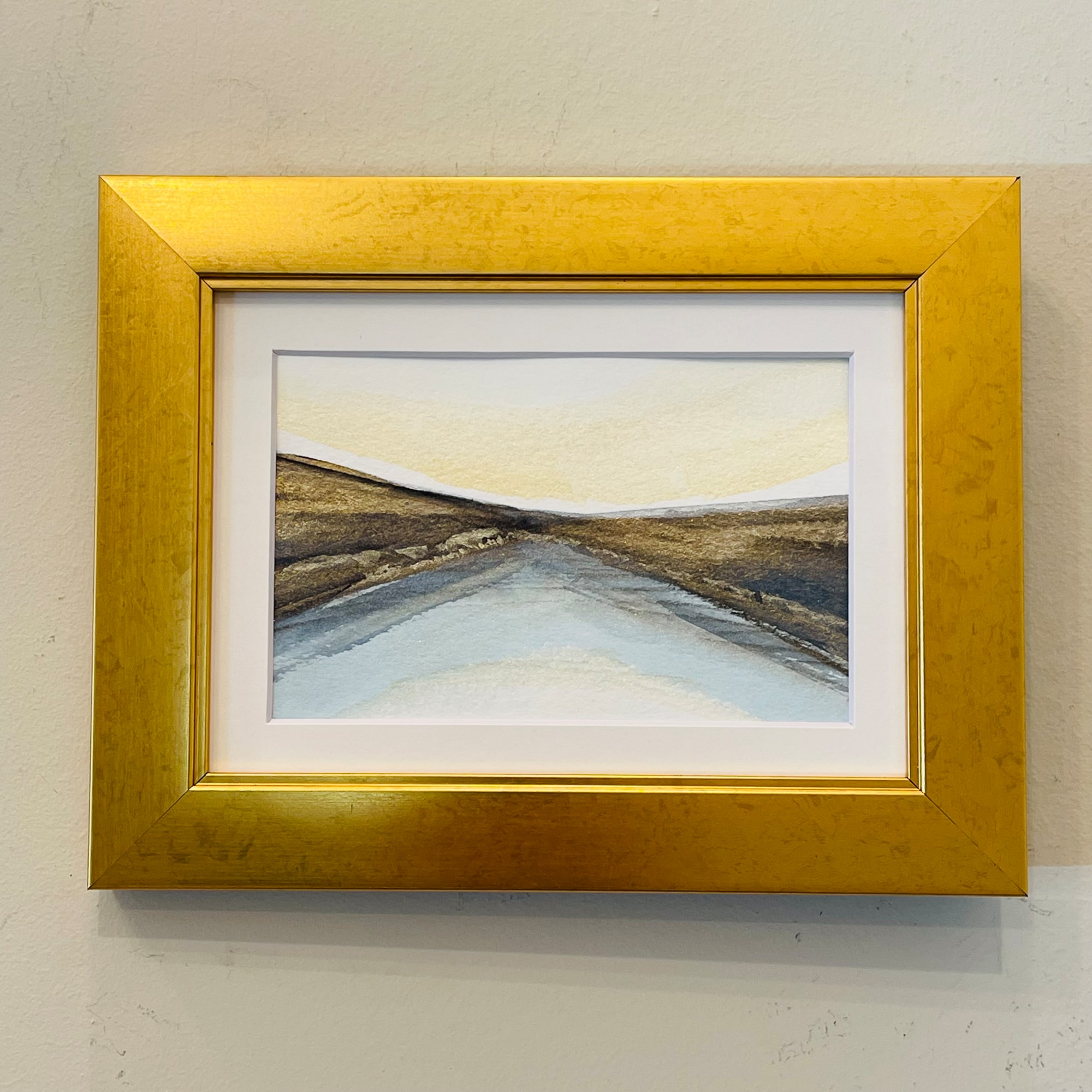 This landscape watercolor is professionally finished with a wide burnished gold frame. Deep metallic wash minimalist palette.