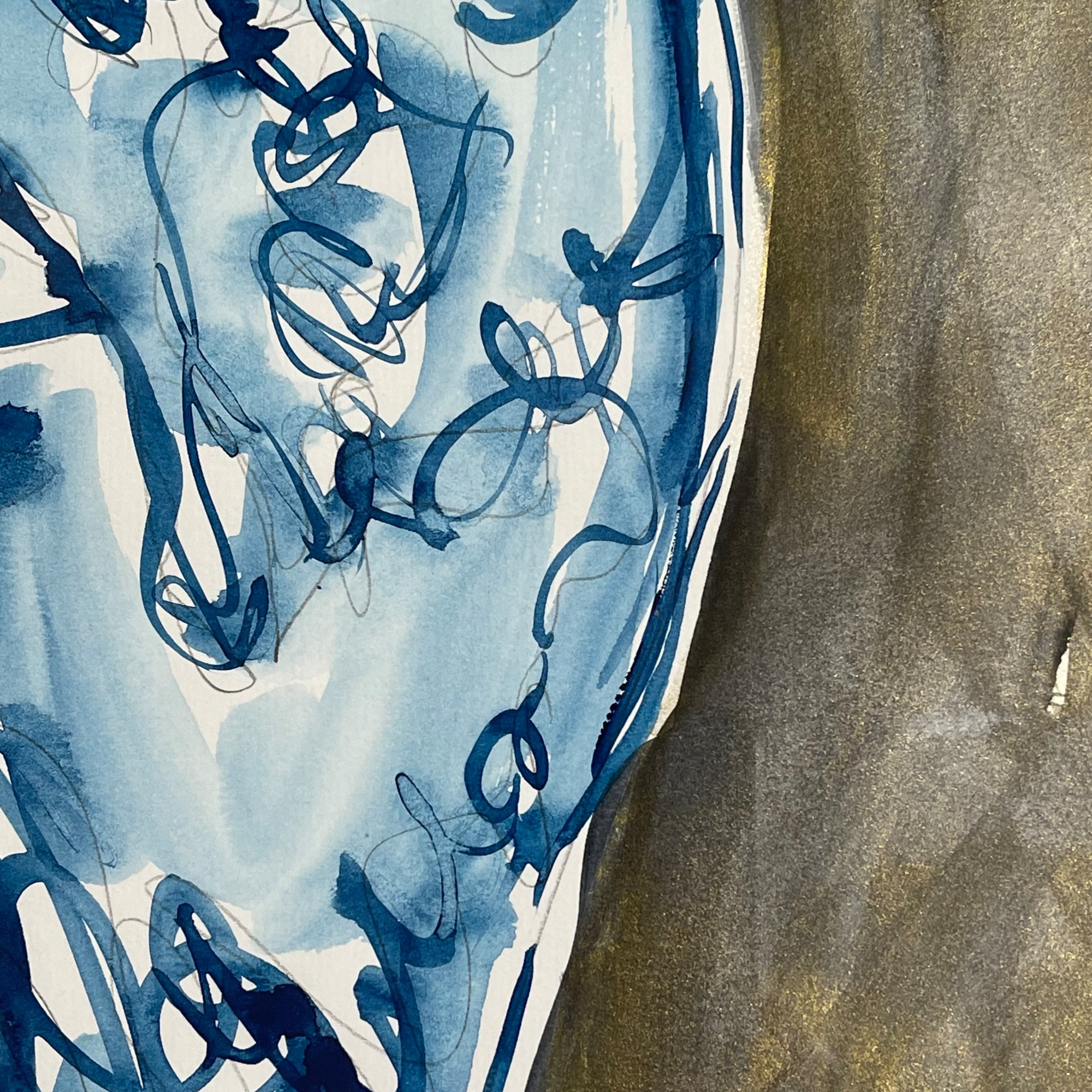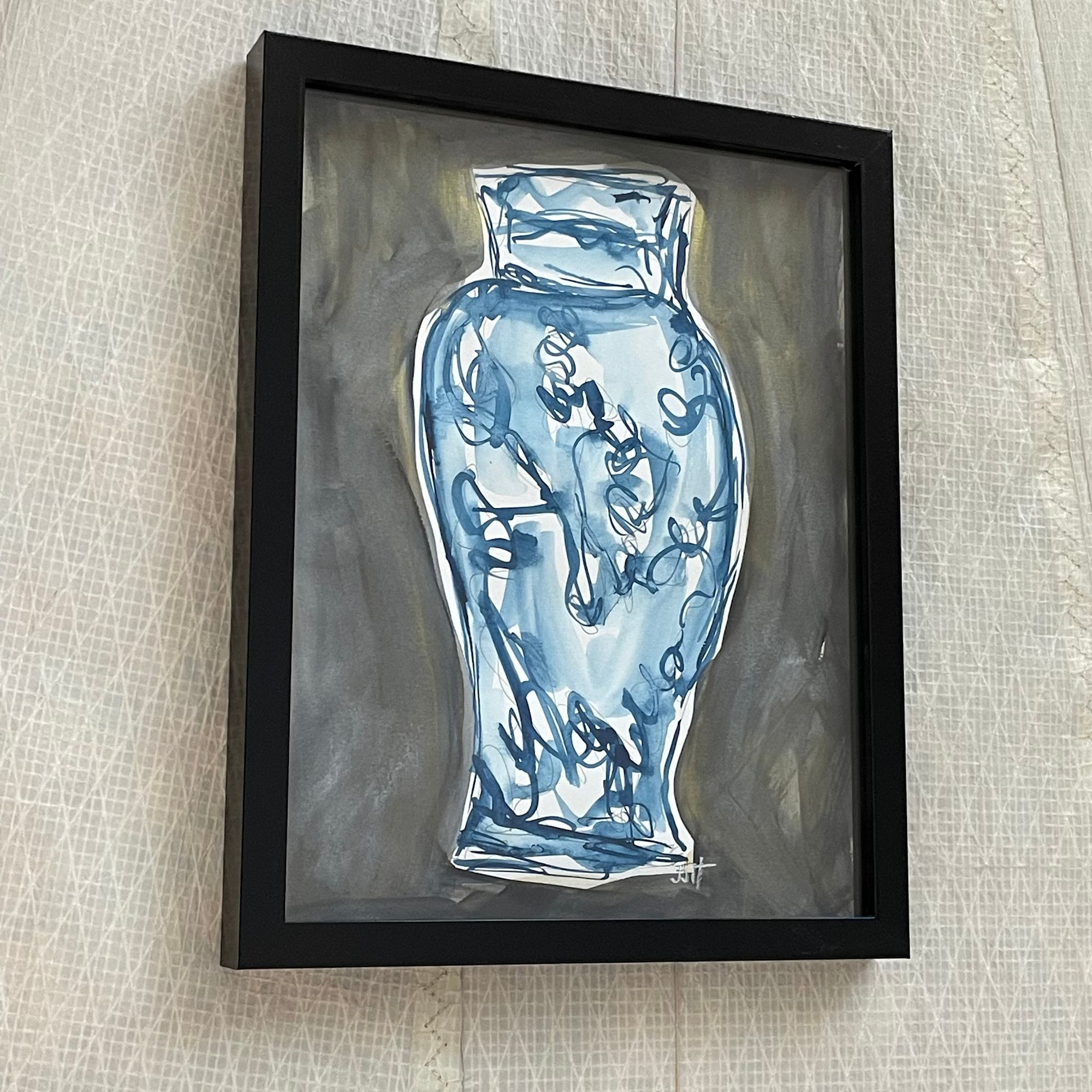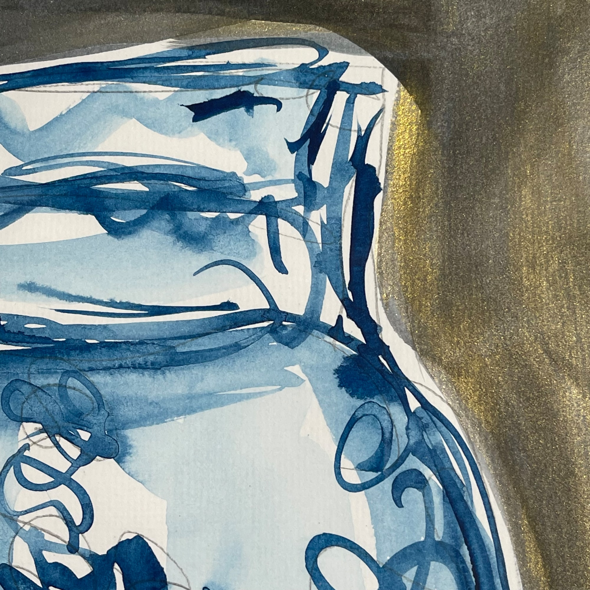 Incredible blue and white Chinoiserie-inspired watercolors. Shimmery metallic gold underpainting with a deep blue palette. Glossy black modern frame, under glass.