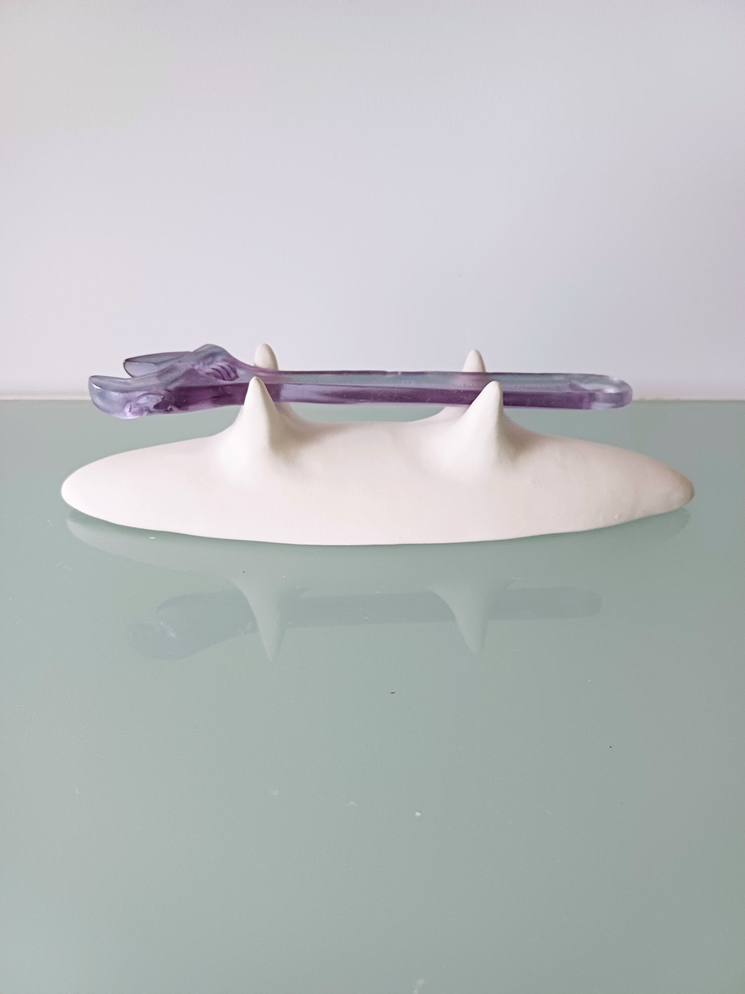 Cast glass crescent with ceramic holder. This glass sculpture feels great to hold. Perfect gift for car or motorcycle enthusiasts. Metaphor for repairing emotionally, or physically. Use with care. I'm stronger than I look.