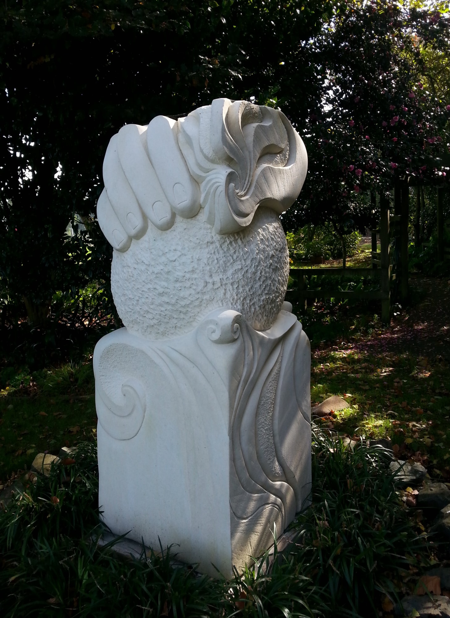 Commission to replace existing water feature approx 1.5m high based on client's design of one hand coming up from the ground and one hand coming down from the sky holding a sphere between them - representing working the land.