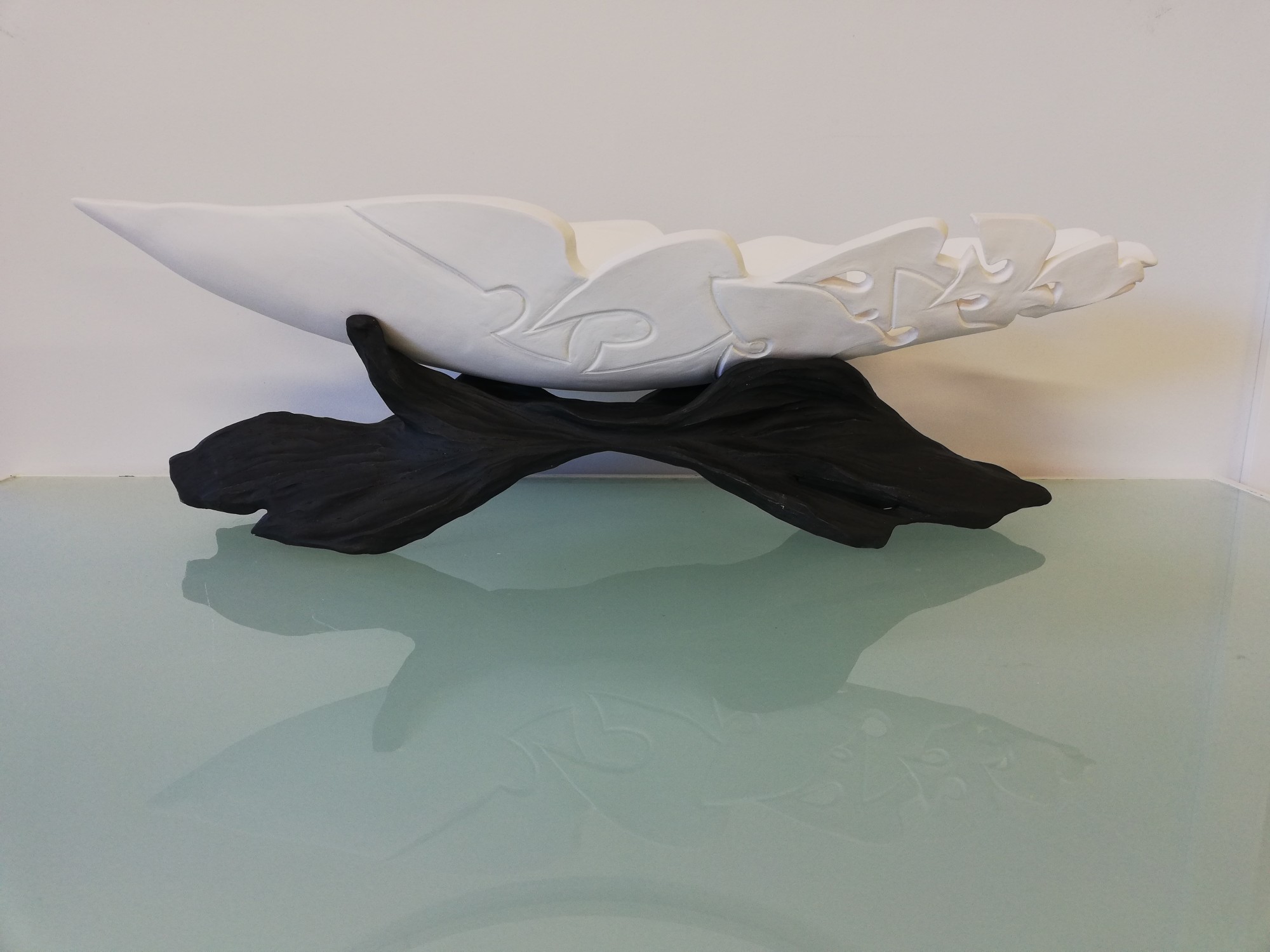 Ceramic Vessel nestled on an organic base. This simple boat form has graduating birds in flight carved in and through the surface. The organic base grounds the light airy boat, inspired by a scorched blackened tree branch. Two individual separate pieces created to fit perfectly together. This piece is intended as decorative rather than functional.