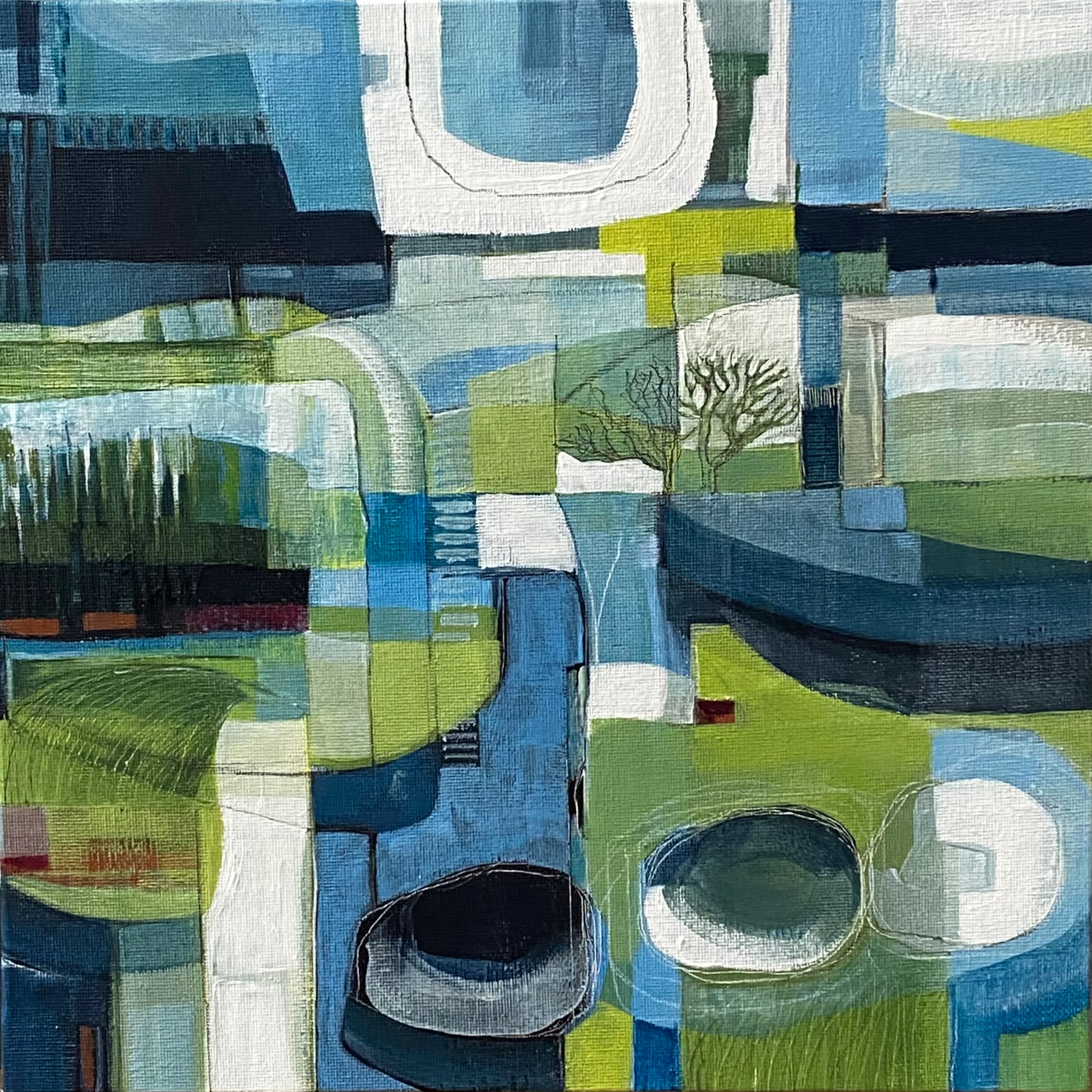 Painting which comes from walking the high fields close to where I work-scattered scrubby trees, dry stone walls and scudding clouds with boulder strewn grass.