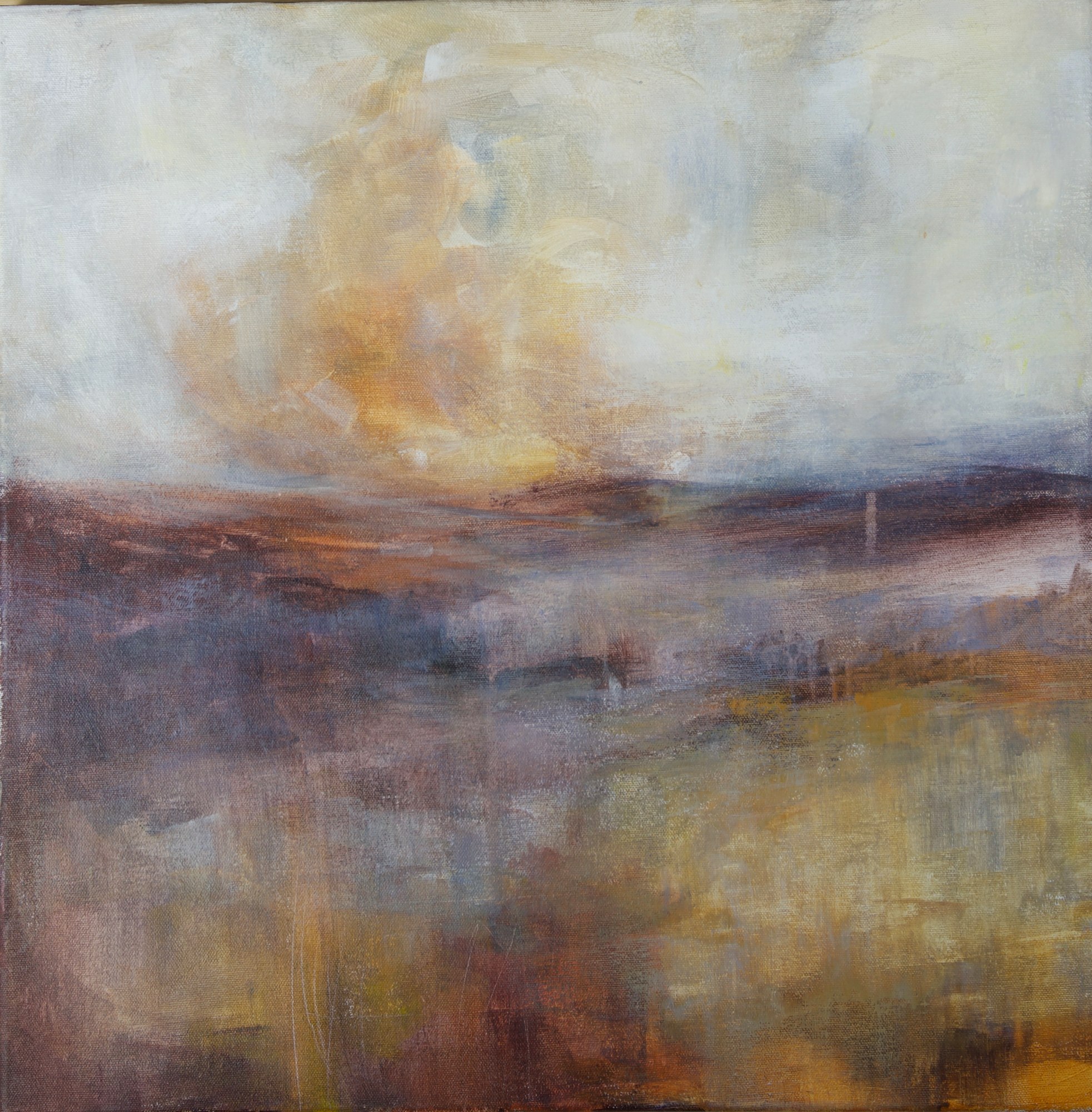 Awakening is an atmospheric abstraction painting, exploring the colour and atmosphere of our local moorland in bright warm light.