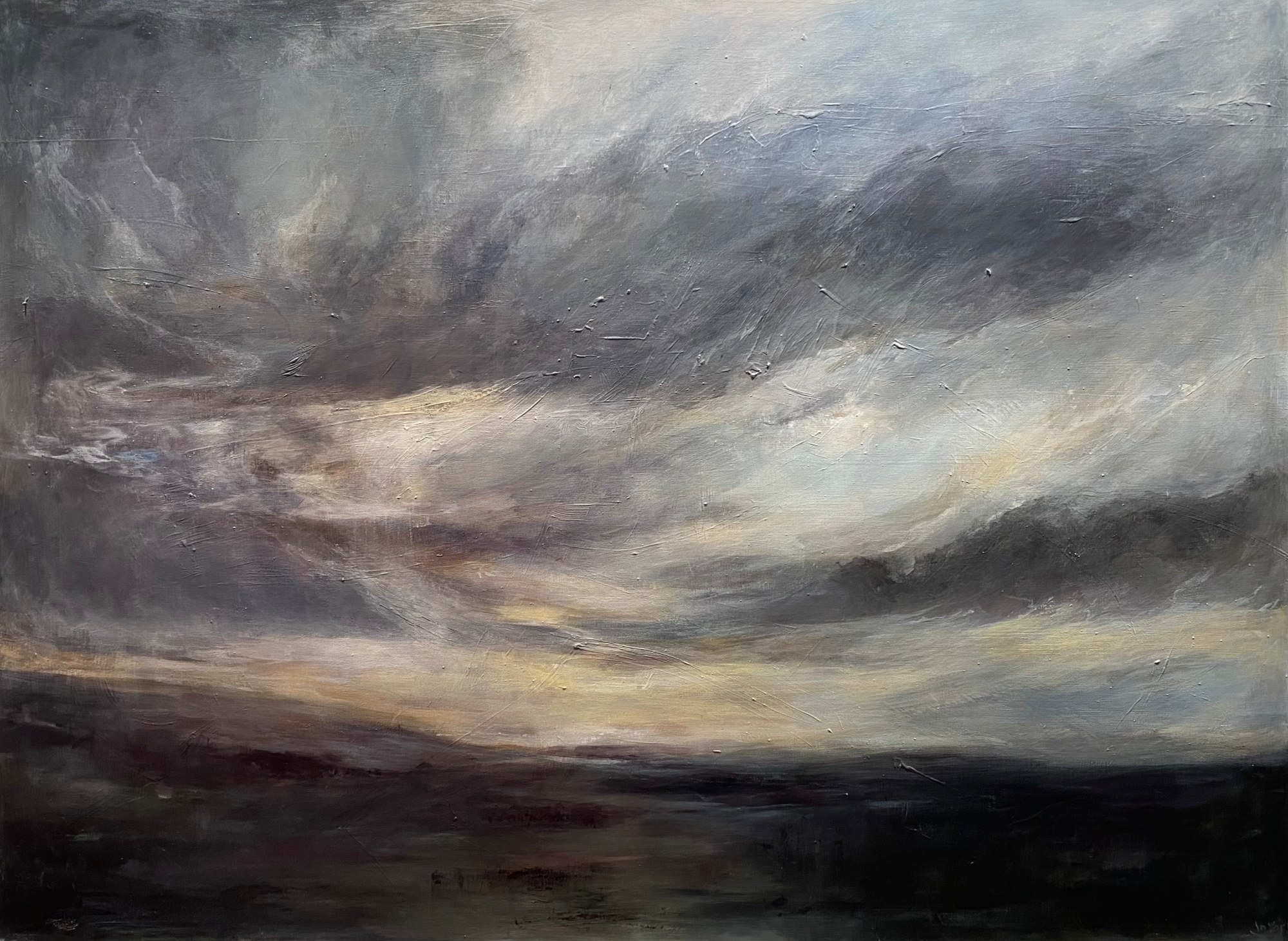 Atmospheric moorland land and sky scape; a dramatic sky with early morning glowing colour, painted in multiple layers of opaque and glazed acrylics.