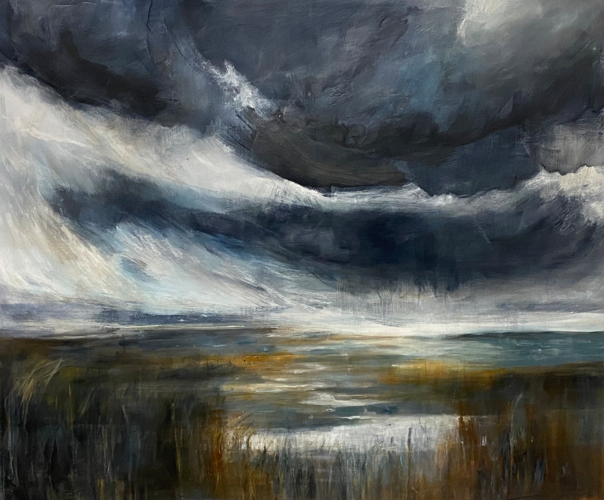 Atmospheric painting inspired by walking a local wetlands reserve in stormy weather.