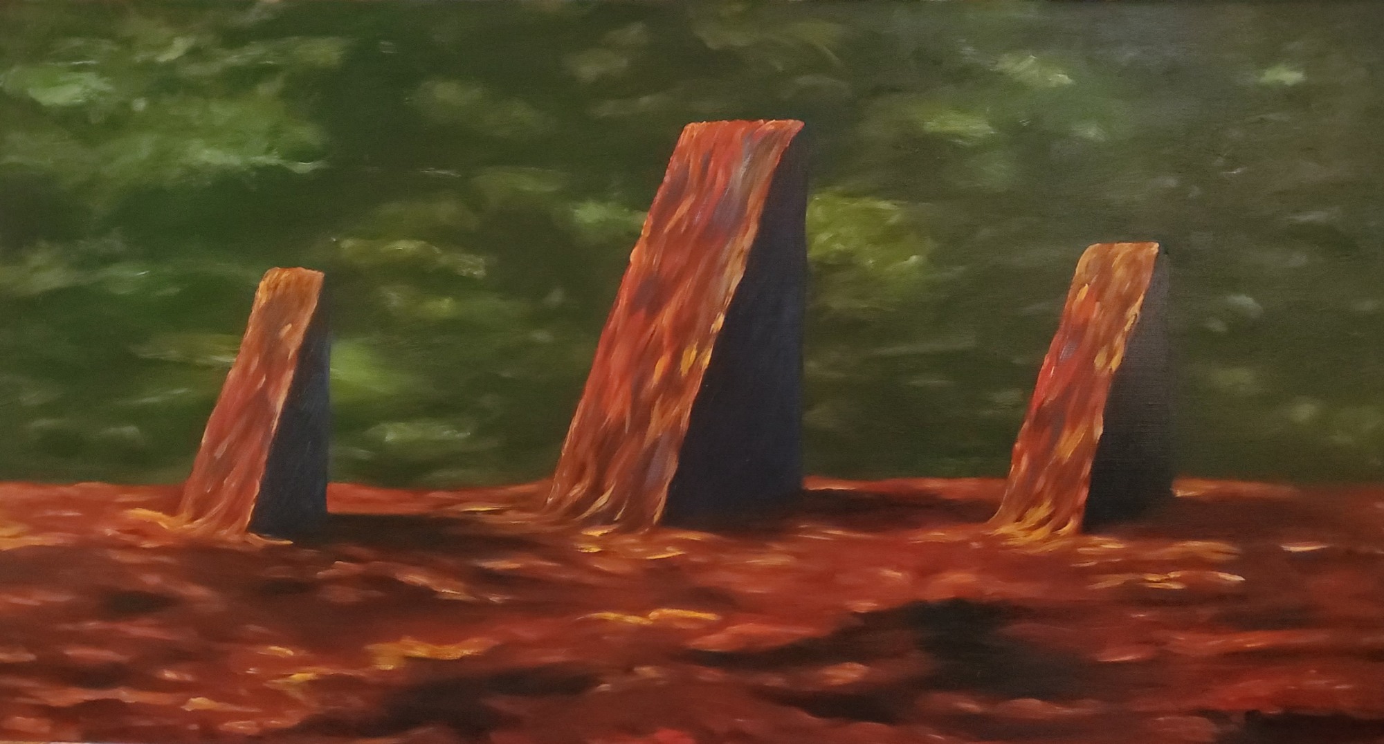 Oil on linen version of a pastel I did last year. I was really curious to see the difference that size and medium can make to an image. It's part of my Monoliths series, which addresses an awareness of our deepest perceptions of our surroundings. This is titled "Anger" 16" x 29" and the 2" x 5" pastel is titled "Three Kings".