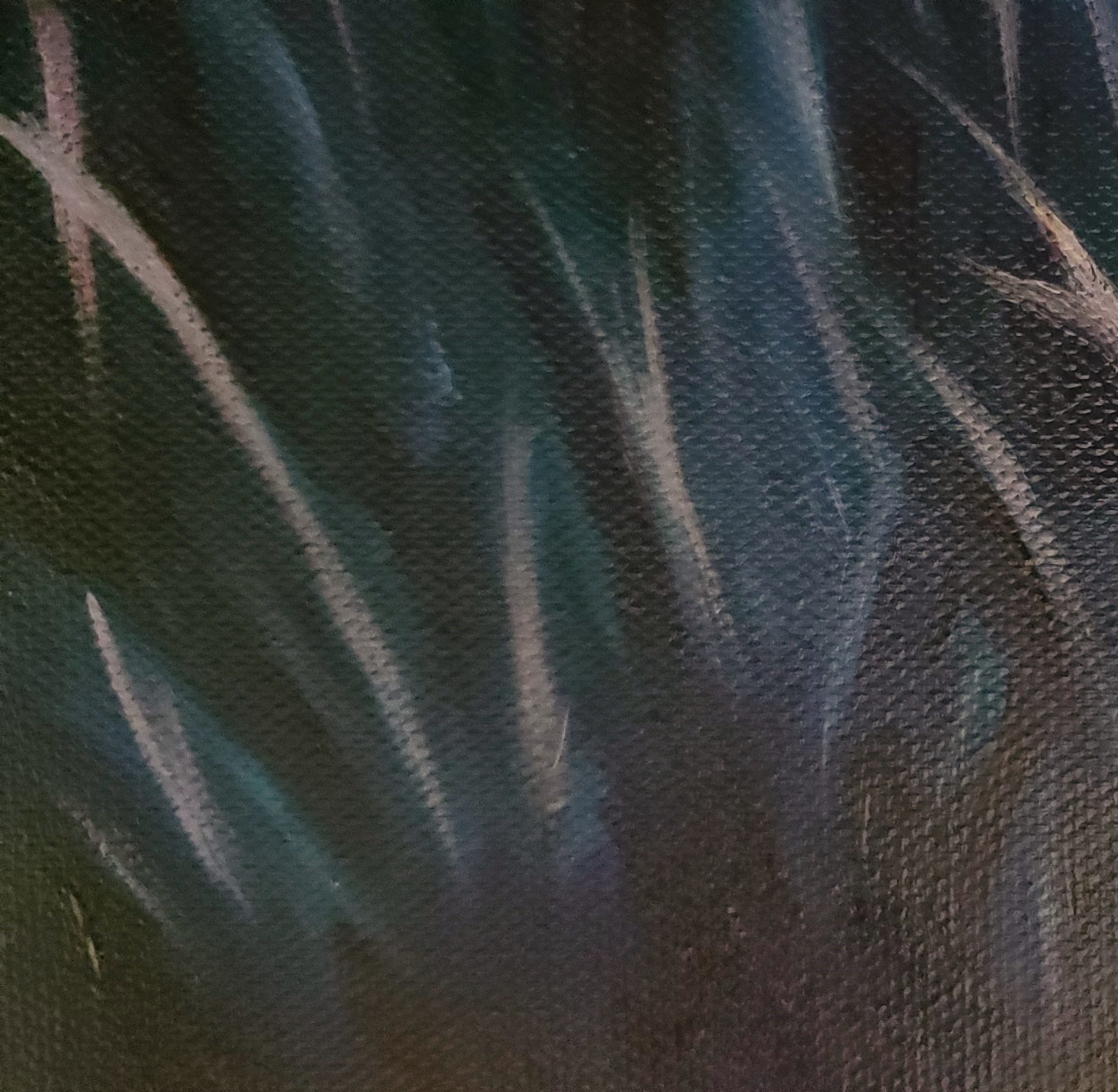 This painting is titled "Dusk Along Chadwick St., Penn Hills, Pittsburgh", oil on canvas unframed 16" H x 20" W x 0.75" D. It is finished except for painting the sides and final varnish, so that's why it is marked still "in progress". The sides will be painted dark blue (one of the colors used in the painting) so it is ready to display or can be framed later on. There is a flat D-ring wire hanger for flush wall mounting.