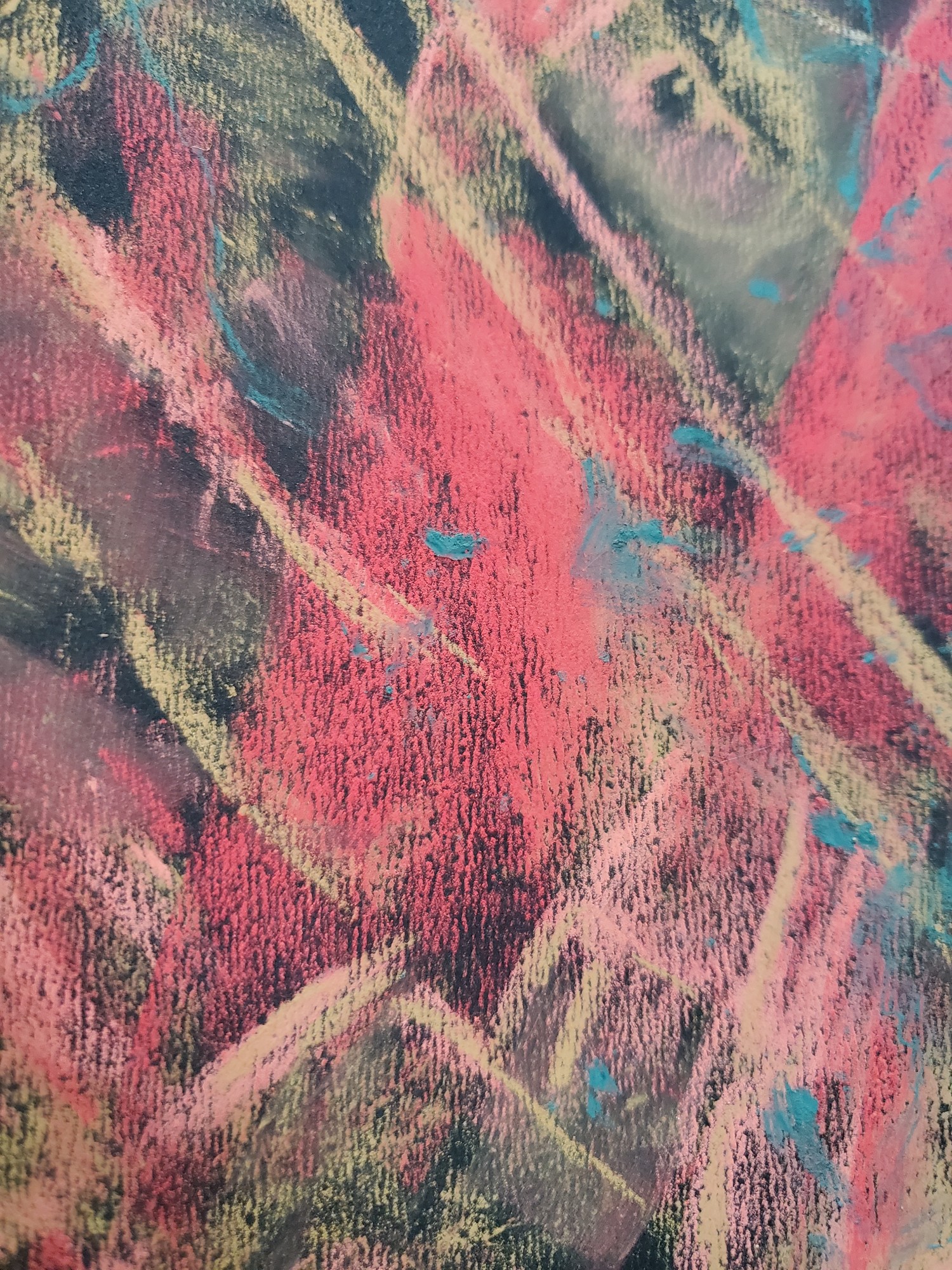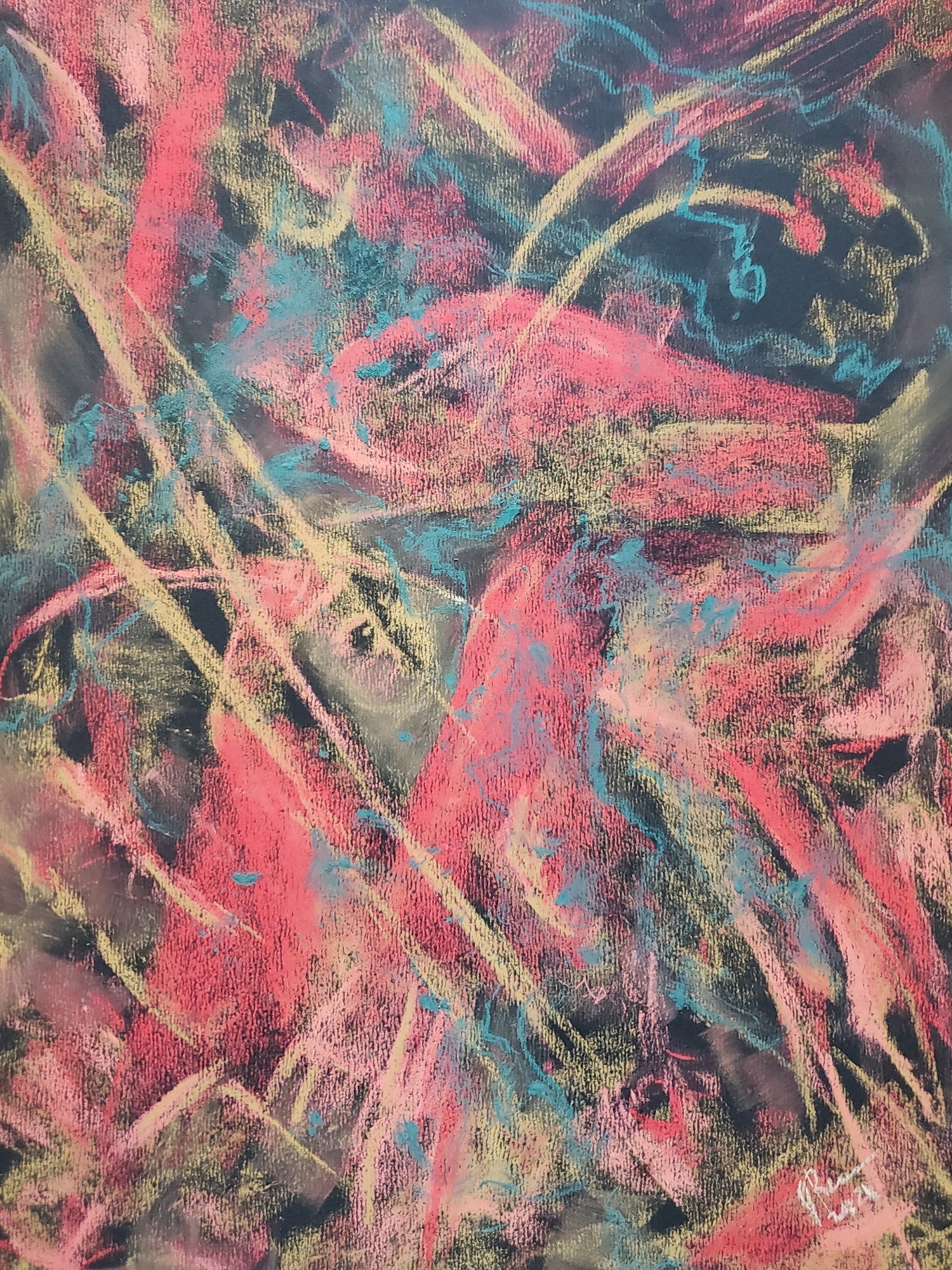 Titled "Fantasy in Coral", this Expressionist/Surrealist pastel was created using intuitive techniques on dark Uart sanded paper 12" H x 9" W unframed. I chose the colors I wanted to use like the pink coral, then began making arbitrary marks. Shapes and features emerged organically, like the face in the lower left and the reaching hand in the upper right.