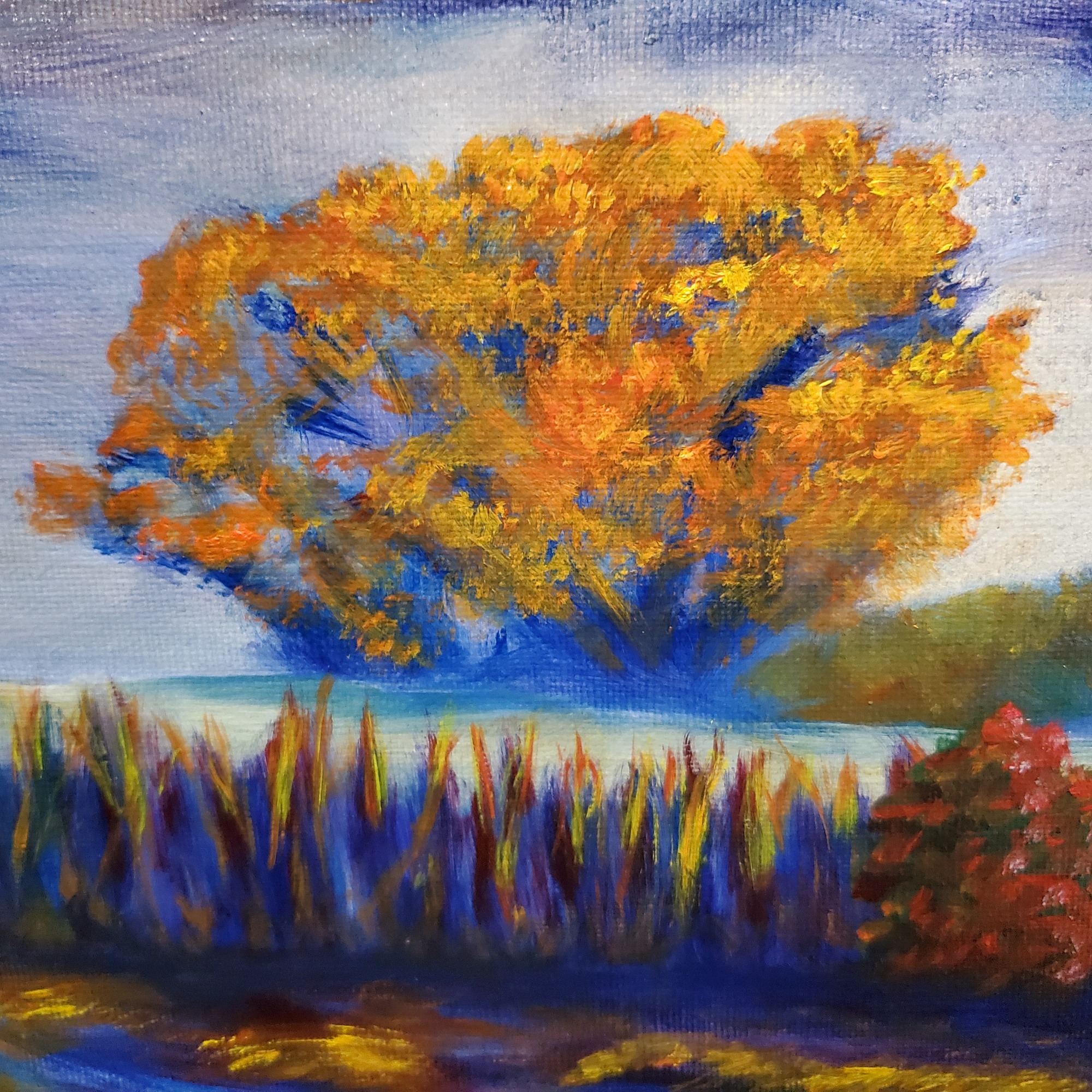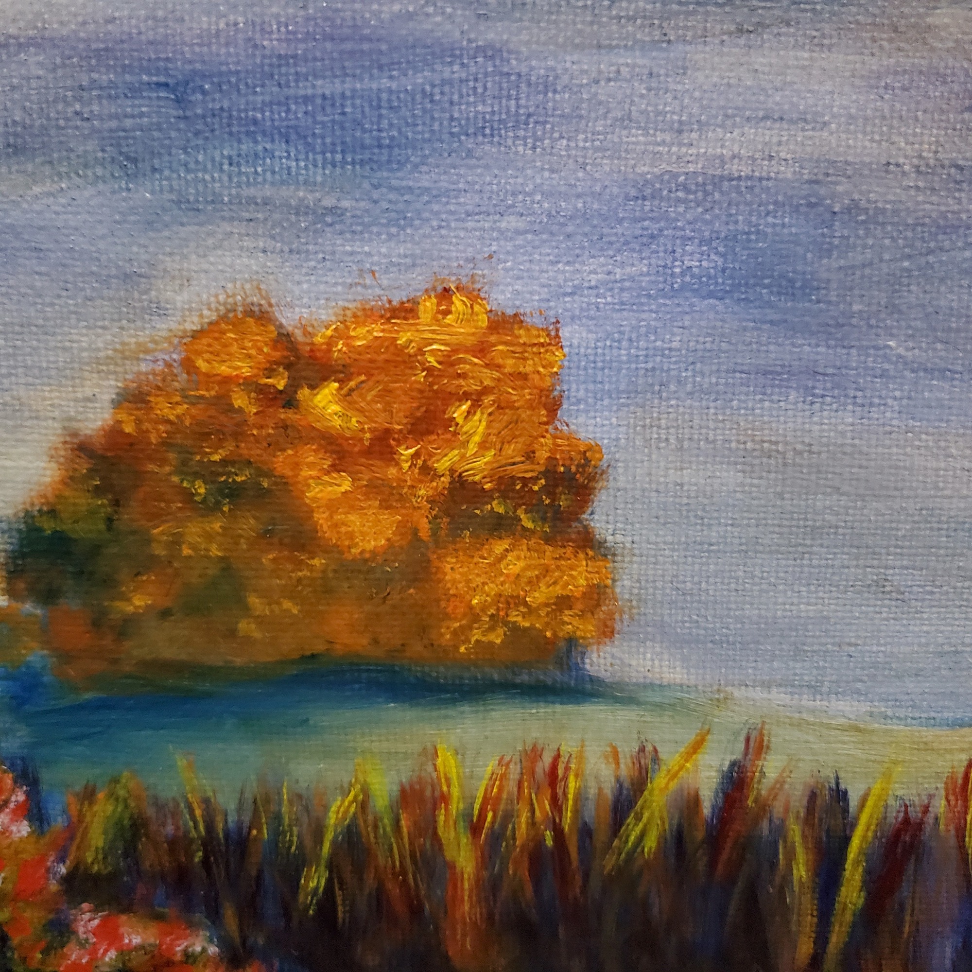 This painting is titled "Late Fall at Churchill Valley Greenway", oil on linen unframed 10" H x 16" W x 1.5" D. Sides are painted gray so it is ready to display or can be framed later on. There is a recessed wire hanger for flush wall mounting. Churchill Valley Greenway is on the site of a former golf course which Nature has reclaimed and is now a protected greenspace. No matter how much we humans try to shape the Earth, Nature will always take it back.