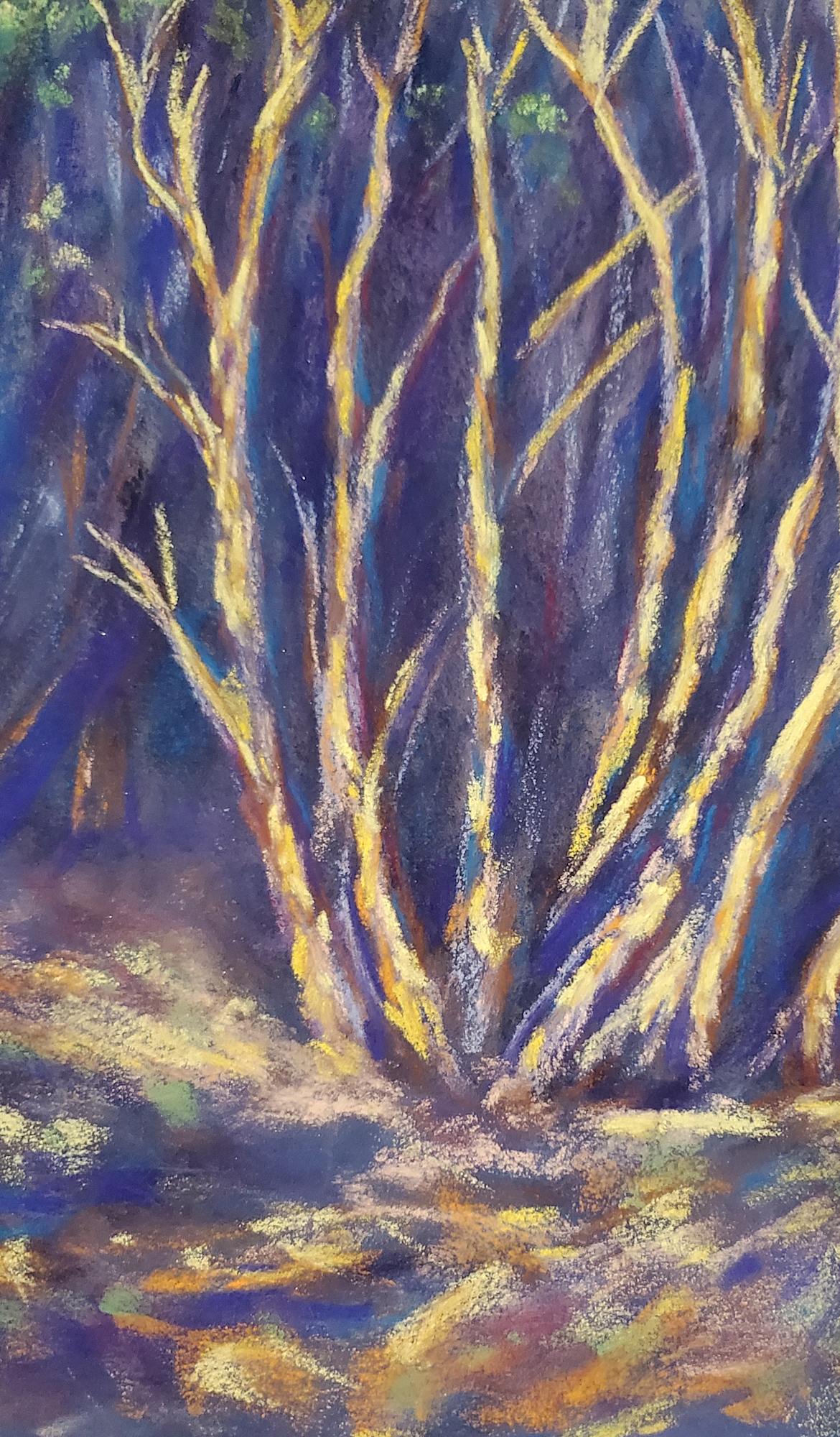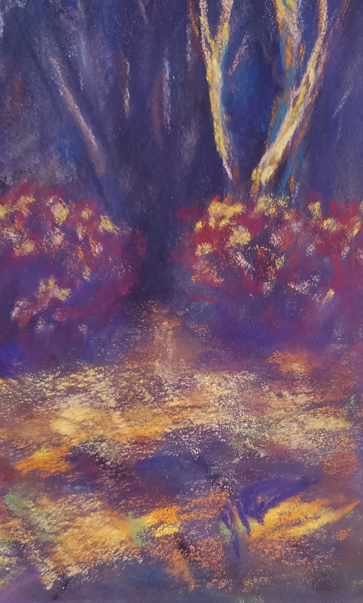 It is pastel on Ampersand Pastelbord panel, 16" x 12", currently framed for the upcoming Pittsburgh Pastel Artists League 2024 Annual Members Exhibition "Rendering Radiance" at the Southern Alleghenies Museum of Art in Ligonier, PA.