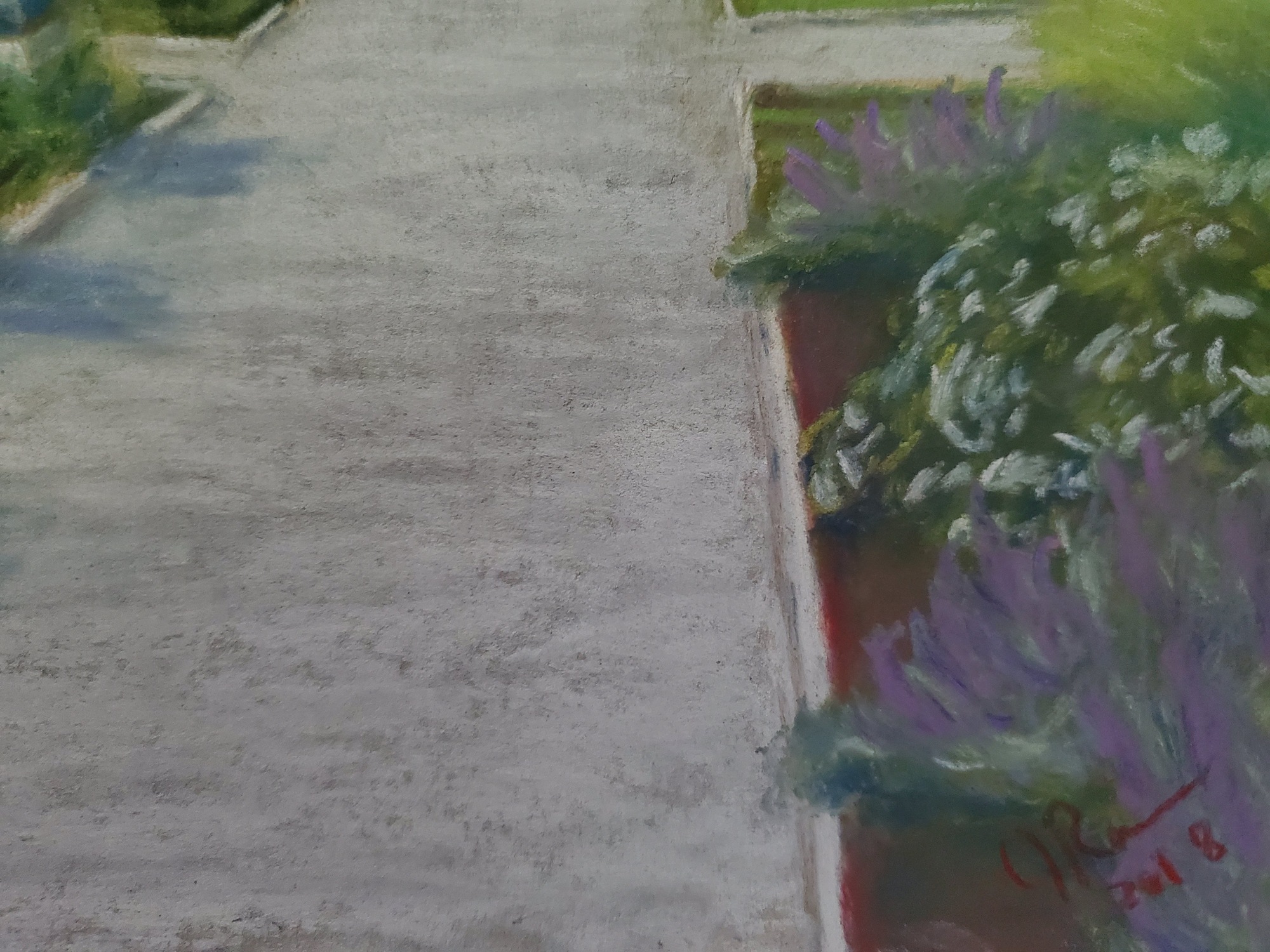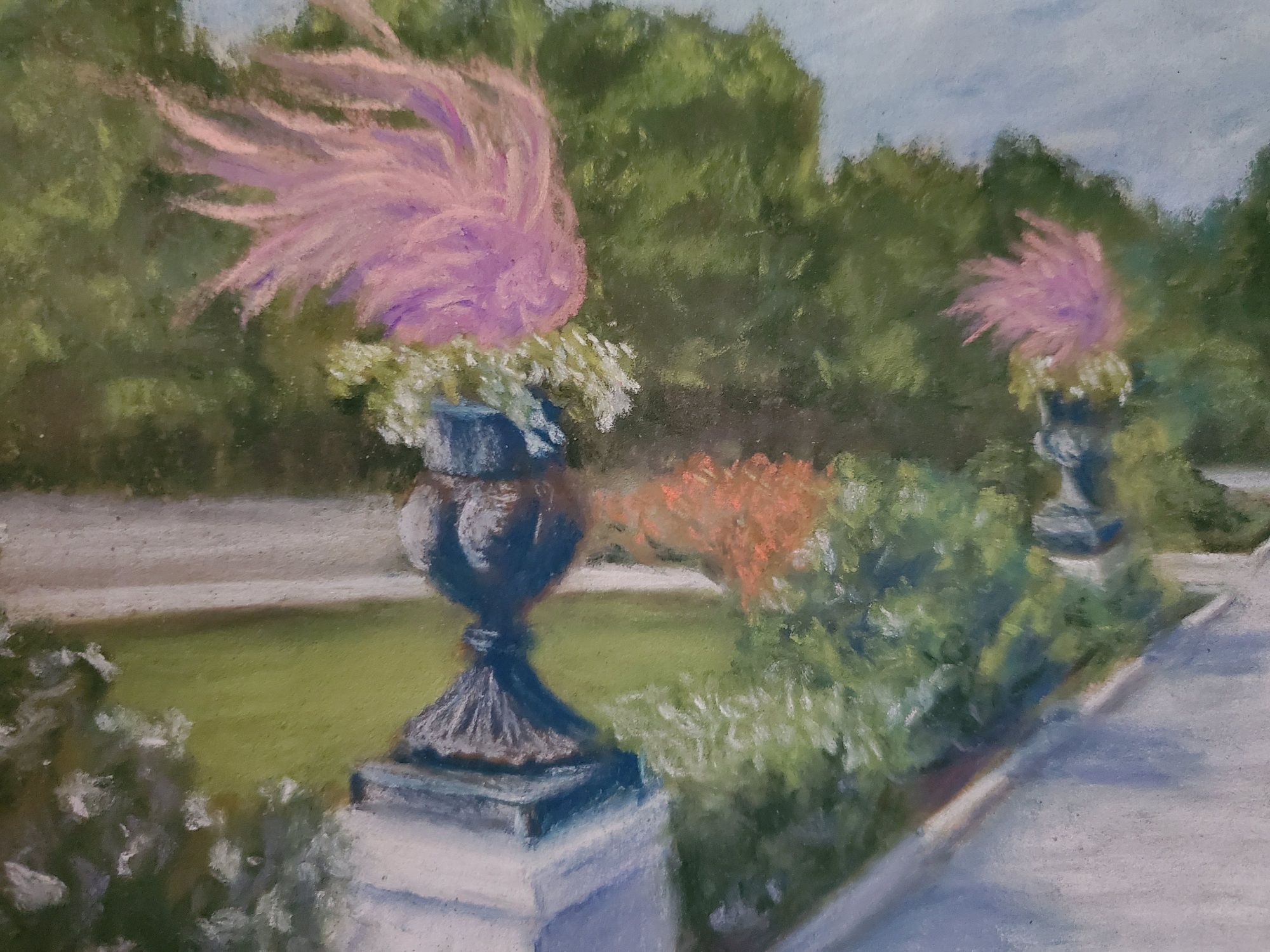 Pastel on sanded paper of one of my favorite places, Highland Park in Pittsburgh, PA. This is a summer scene of a path in the Victorian entry gardens showcasing the antique bronze urns there. If you get the chance to visit Pittsburgh, consider a stop at this park.