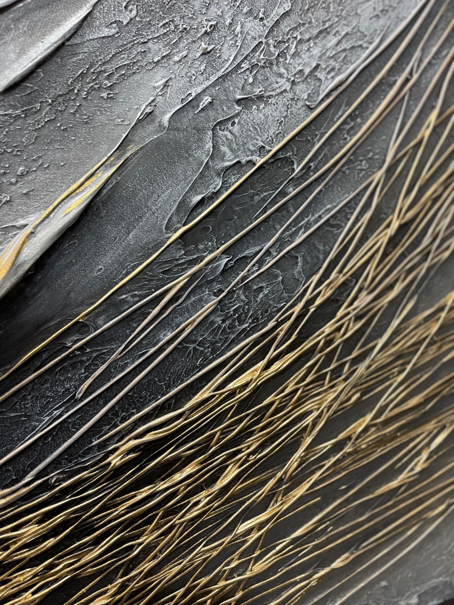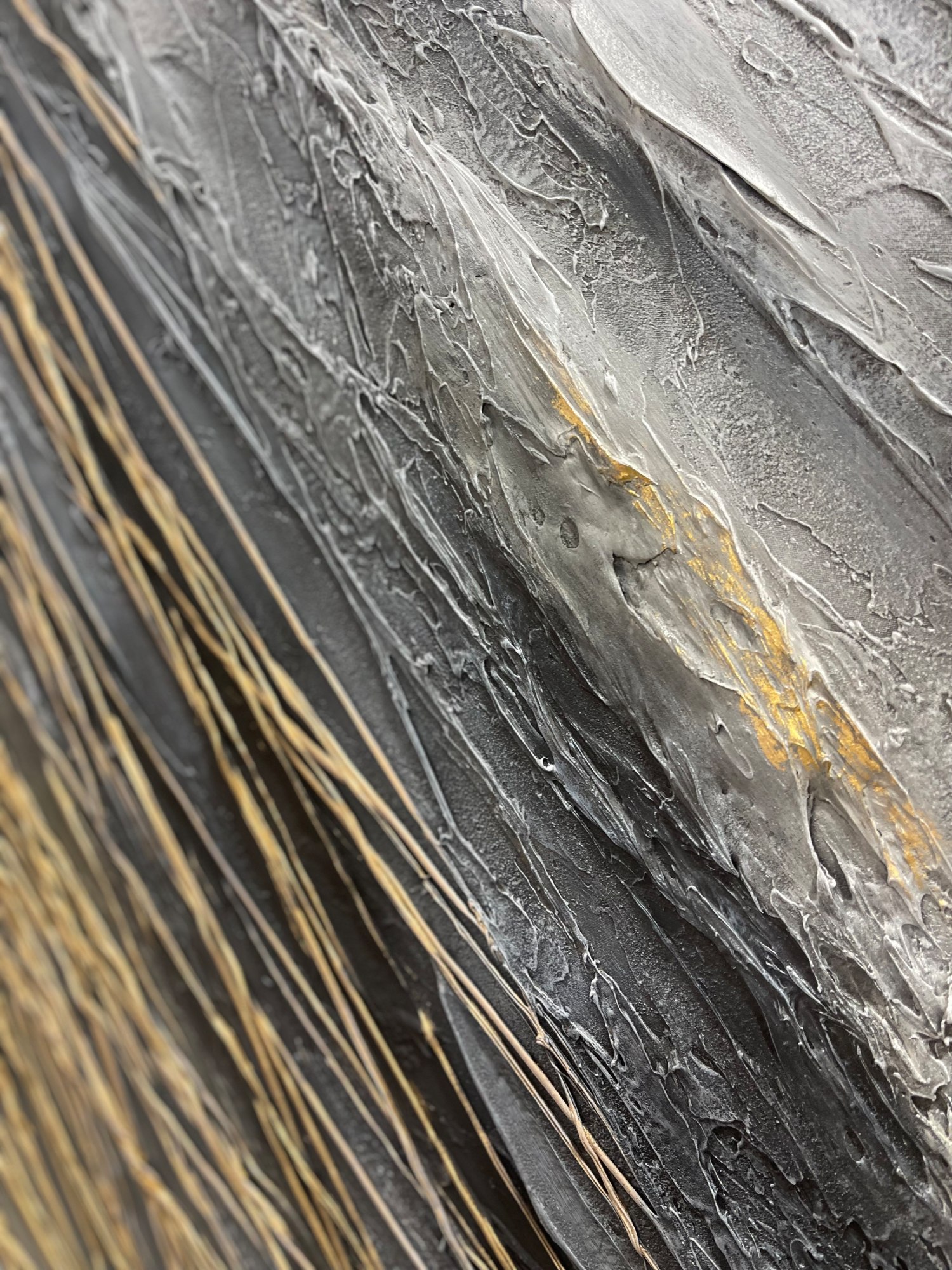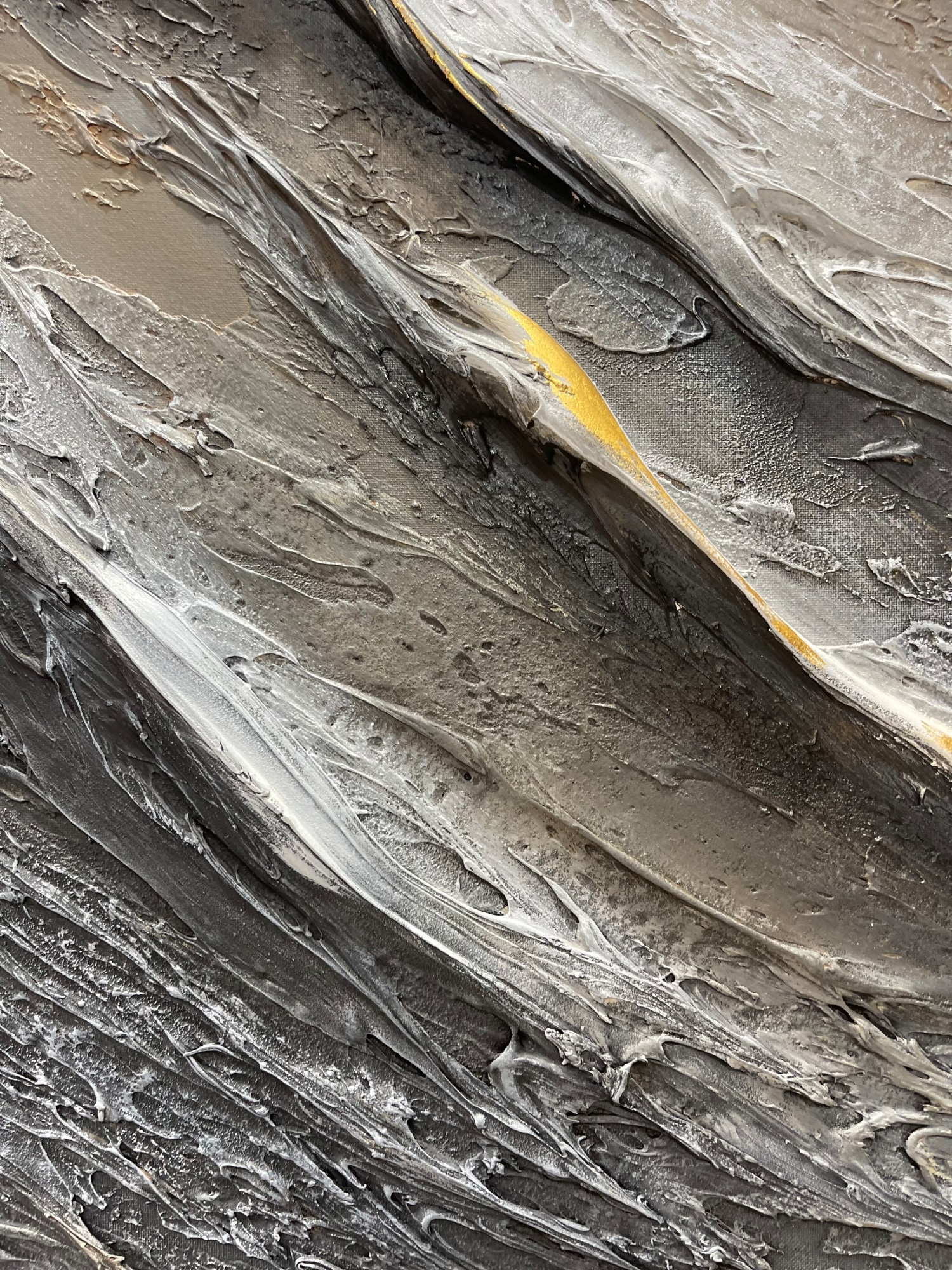 This piece is a large and textured abstract artwork that features a predominantly grey, black, and white colour scheme, with touches of gold leaf and textured lines adding a touch of glamour and sophistication.