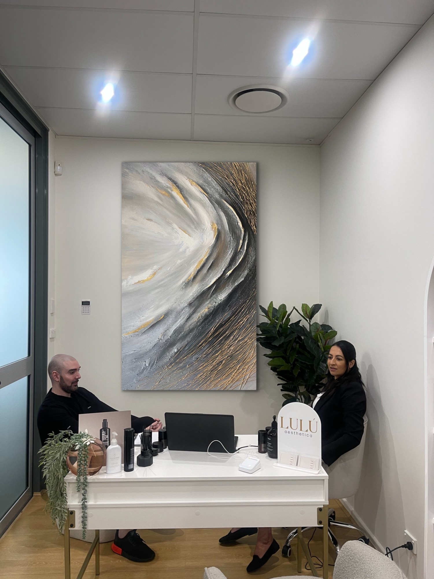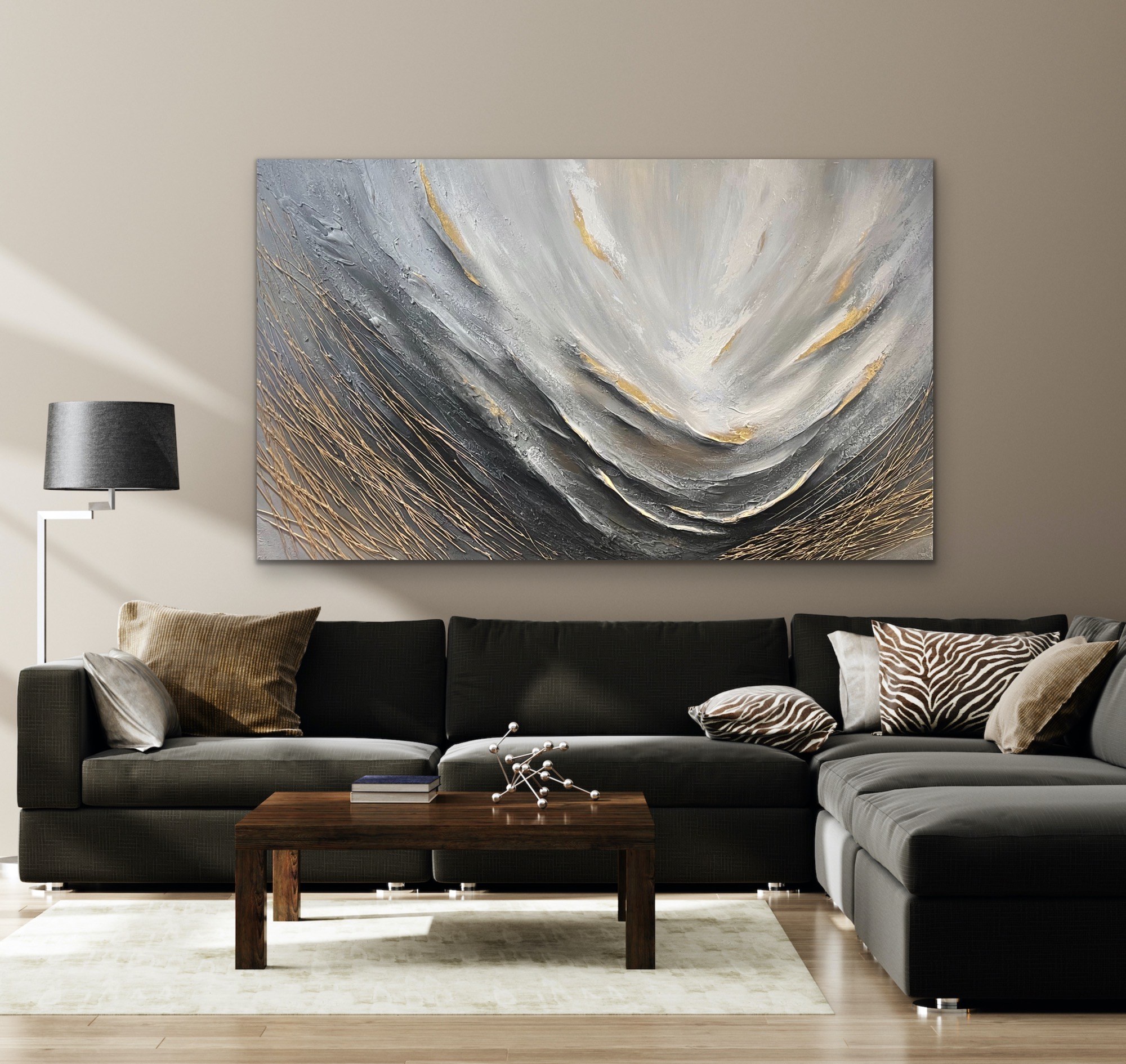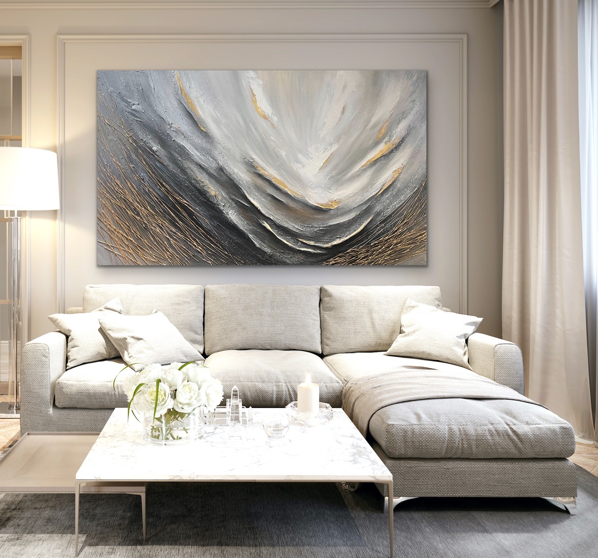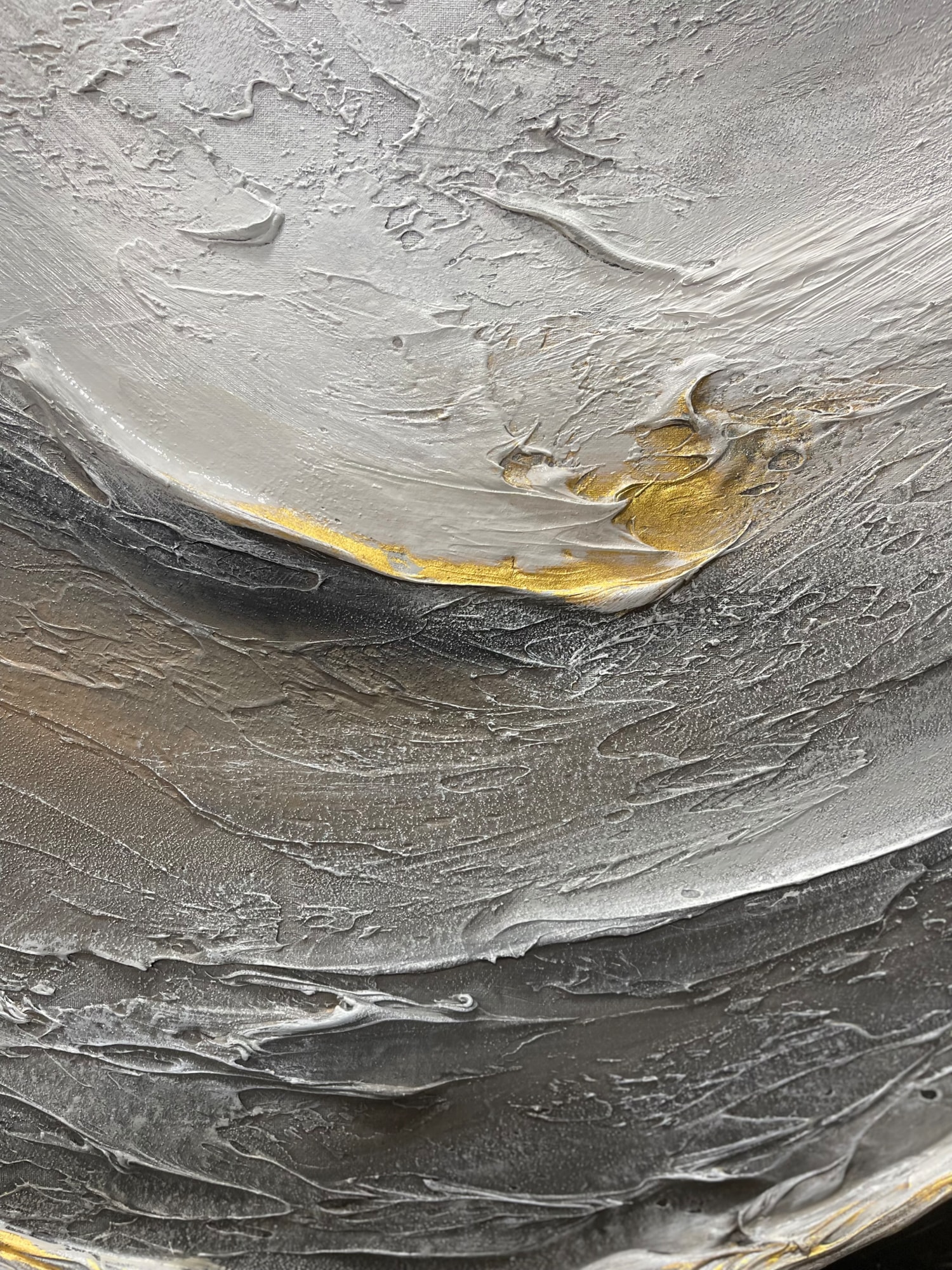 This piece is a large and textured abstract artwork that features a predominantly grey, black, and white colour scheme, with touches of gold leaf and textured lines adding a touch of glamour and sophistication.