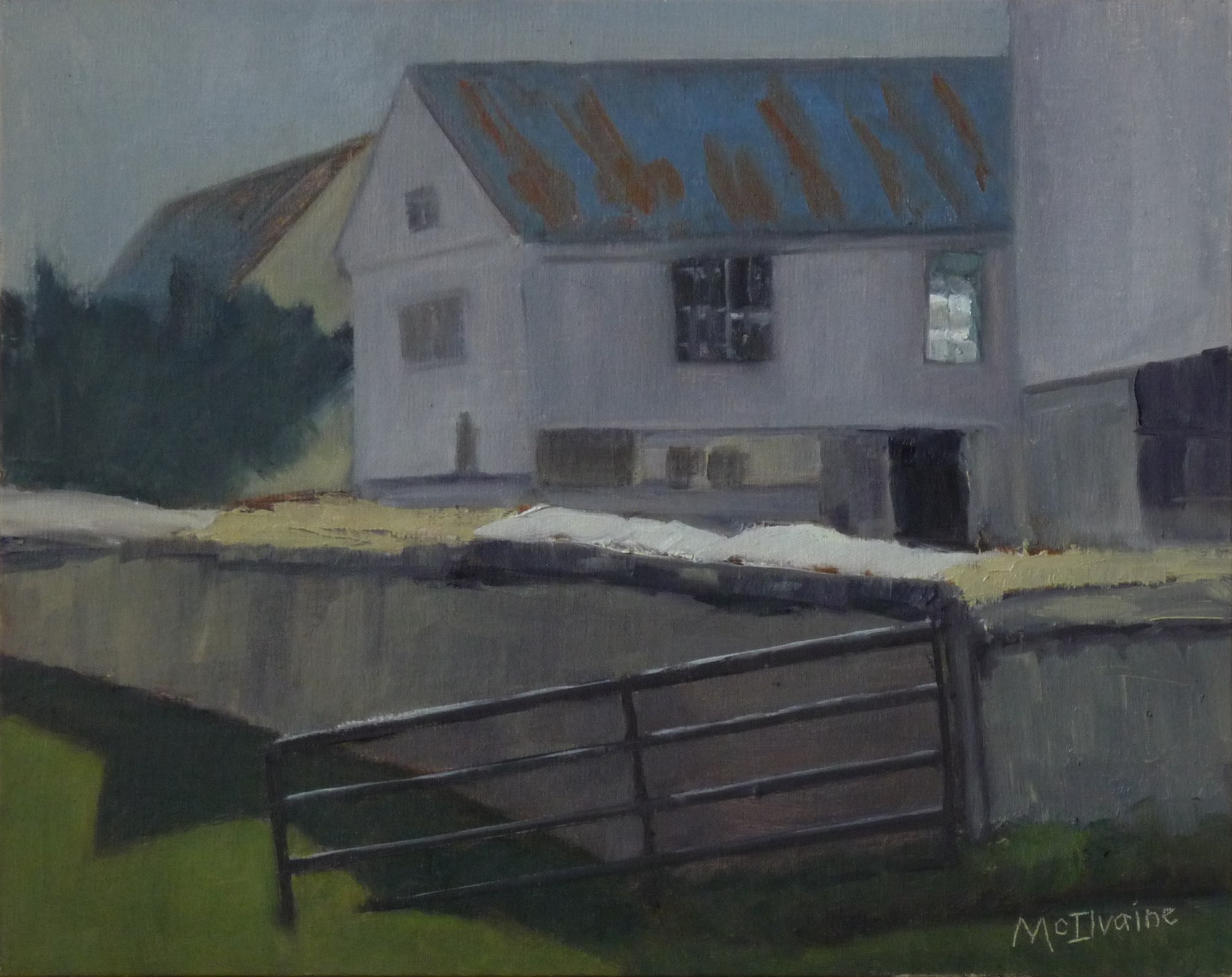 Painted in oils on location (plein air) using an alla prima method. Evening light from the setting sun comes through a lone window into the empty barnyard and falls on a broken, propped-open gate.