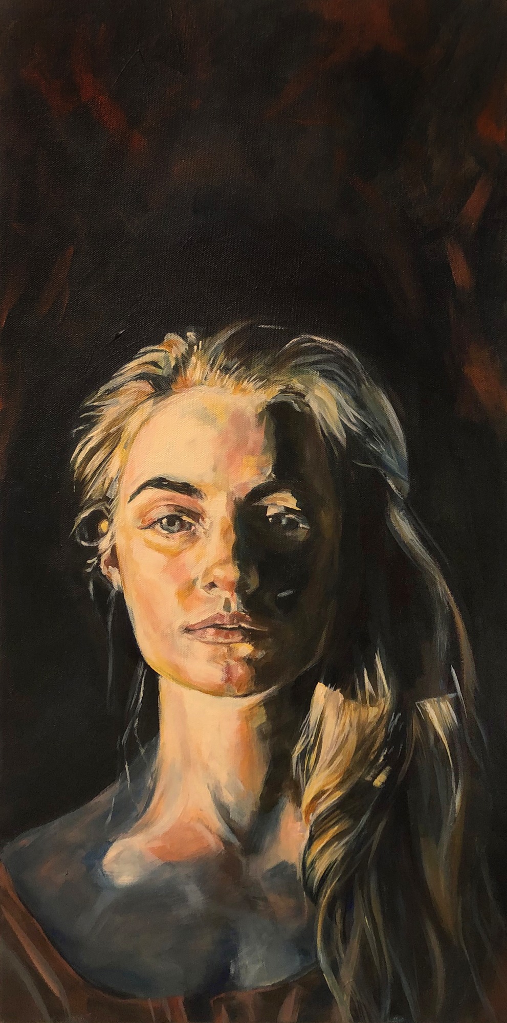 My second portrait painting of 2022. The Storm Ahead serves as a study for my upcoming Siren series, as well as a practice in gentler color transitions than in my last portraits. I enjoyed capturing the challenging “film noir” type lighting in this piece.