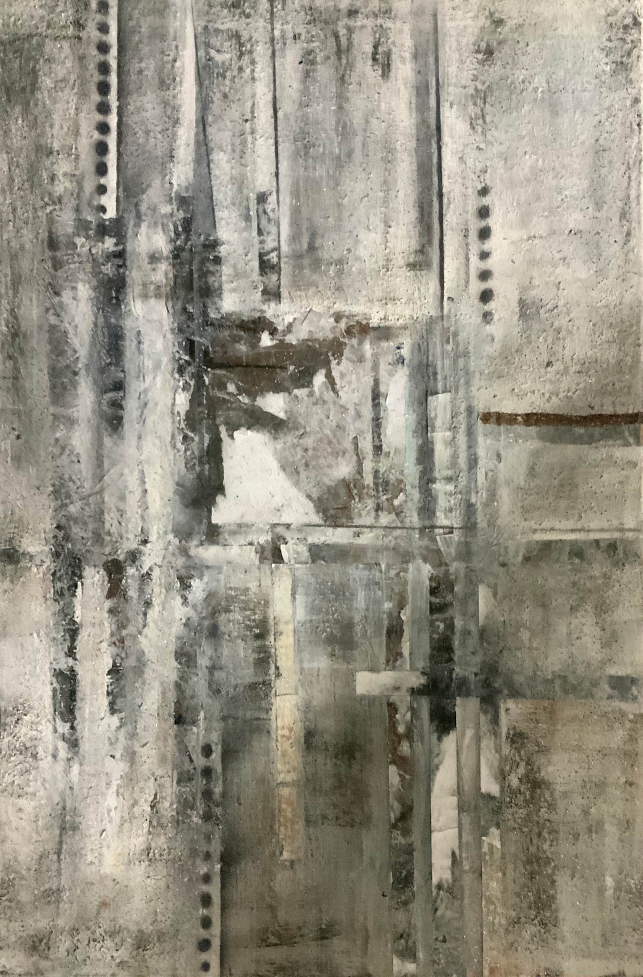 Yin- is a delicate exploration of life’s subtle nuances; with a palette of cream, gray, white, and tan, this piece invites you to find rest in the softer, quieter moments of life. The collage paper technique is combined with acrylic paint and sprinkled with a grey metallic dust that gives the feeling of serenity and balance, reminding us that life is never only black and white but a complex interplay of light and shadow.